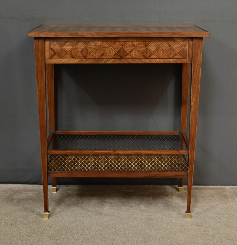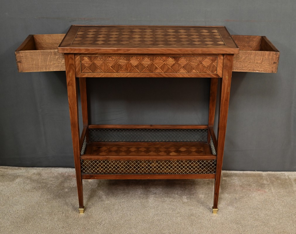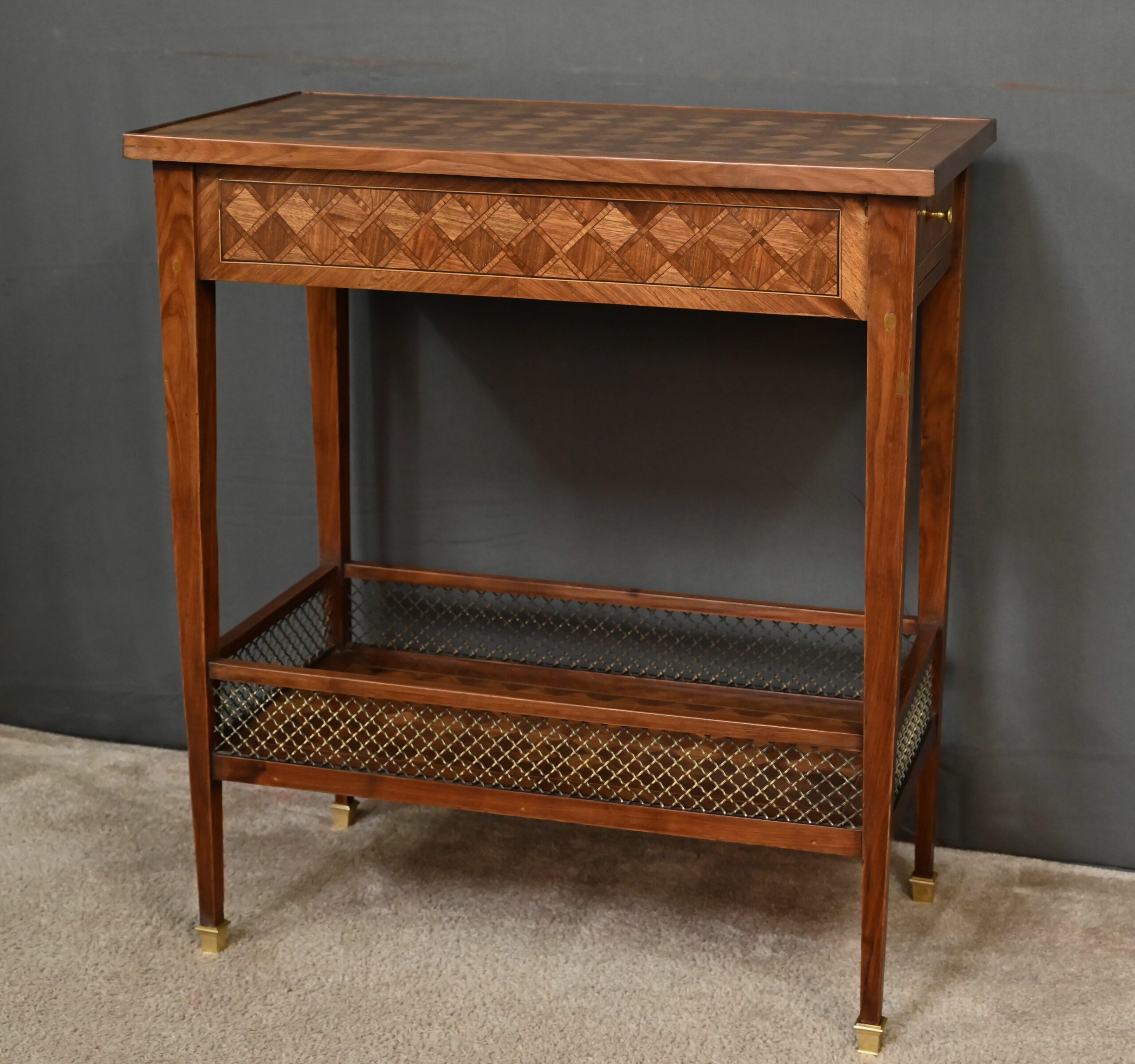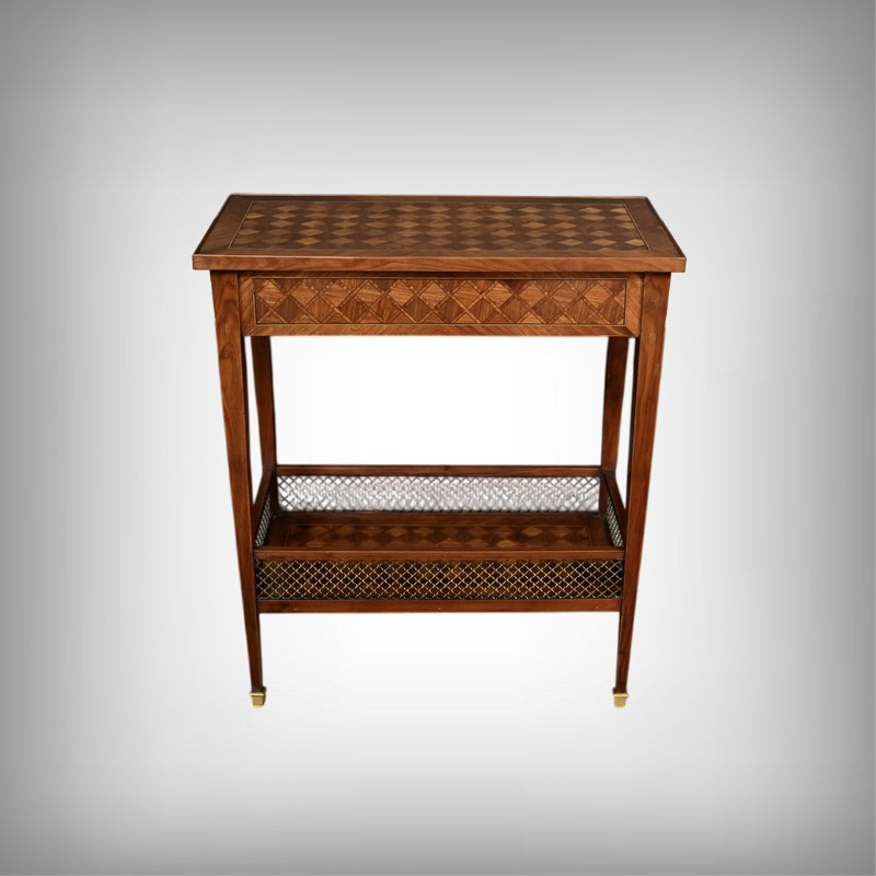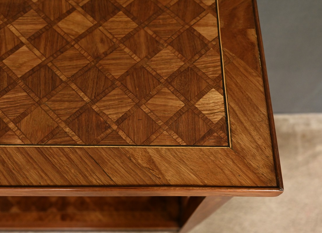 Cette table de salon Louis XVI est réalisée en placage d’acajou finement travaillé en damier au centre du plateau, offrant un jeu de contrastes lumineux. Autour du damier, un filet de bois clair et un placage de feuilles d’acajou disposé en ailes de papillon crée un motif raffiné qui dynamise la surface tout en respectant l’élégance classique du mobilier.