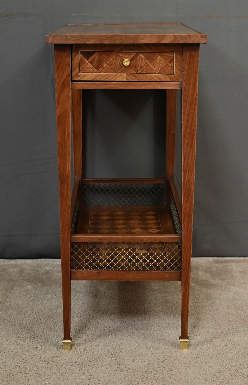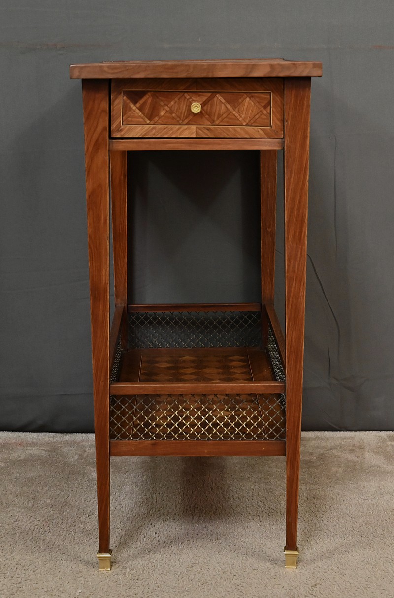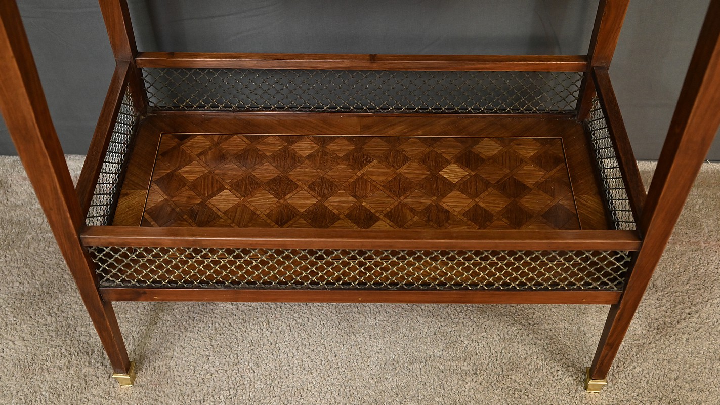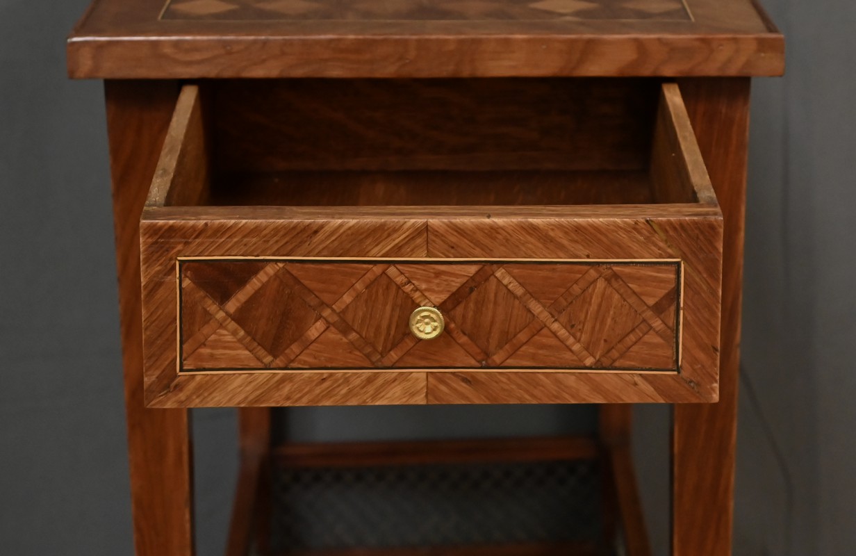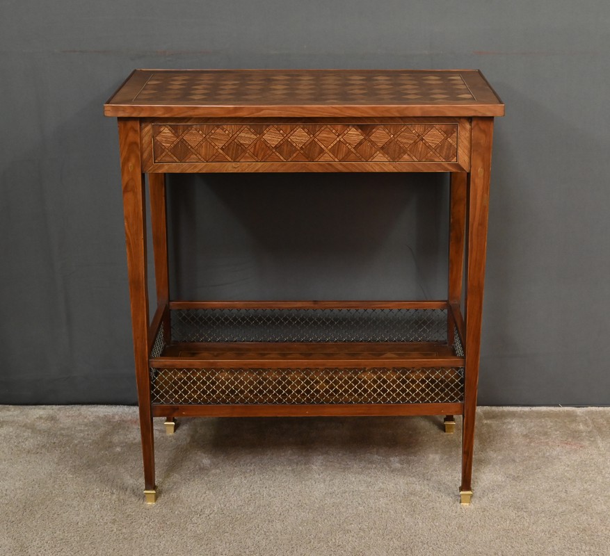 Cette table de salon Louis XVI est réalisée en placage d’acajou finement travaillé en damier au centre du plateau, offrant un jeu de contrastes lumineux. Autour du damier, un filet de bois clair et un placage de feuilles d’acajou disposé en ailes de papillon crée un motif raffiné qui dynamise la surface tout en respectant l’élégance classique du mobilier.