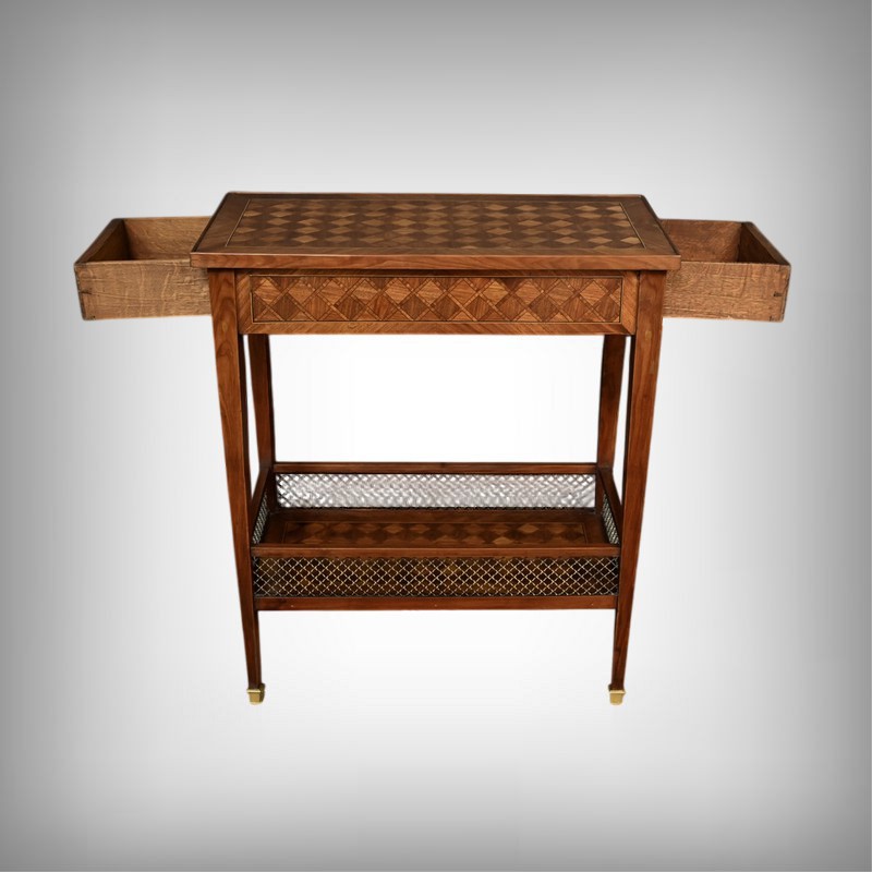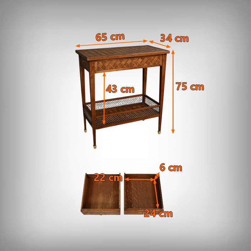 La ceinture comporte deux tiroirs latéraux aménagés discrètement, suffisamment profonds pour accueillir de petits objets de salon tout en conservant l’harmonie du décor. Entre les pieds, une tablette d’entretoise assure la stabilité de l’ensemble et propose un espace de rangement supplémentaire. Cette tablette est entourée d’une galerie ajourée finement ciselée qui apporte légèreté et finesse à cette desserte.