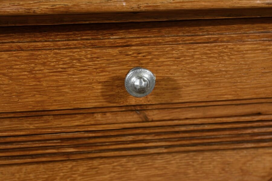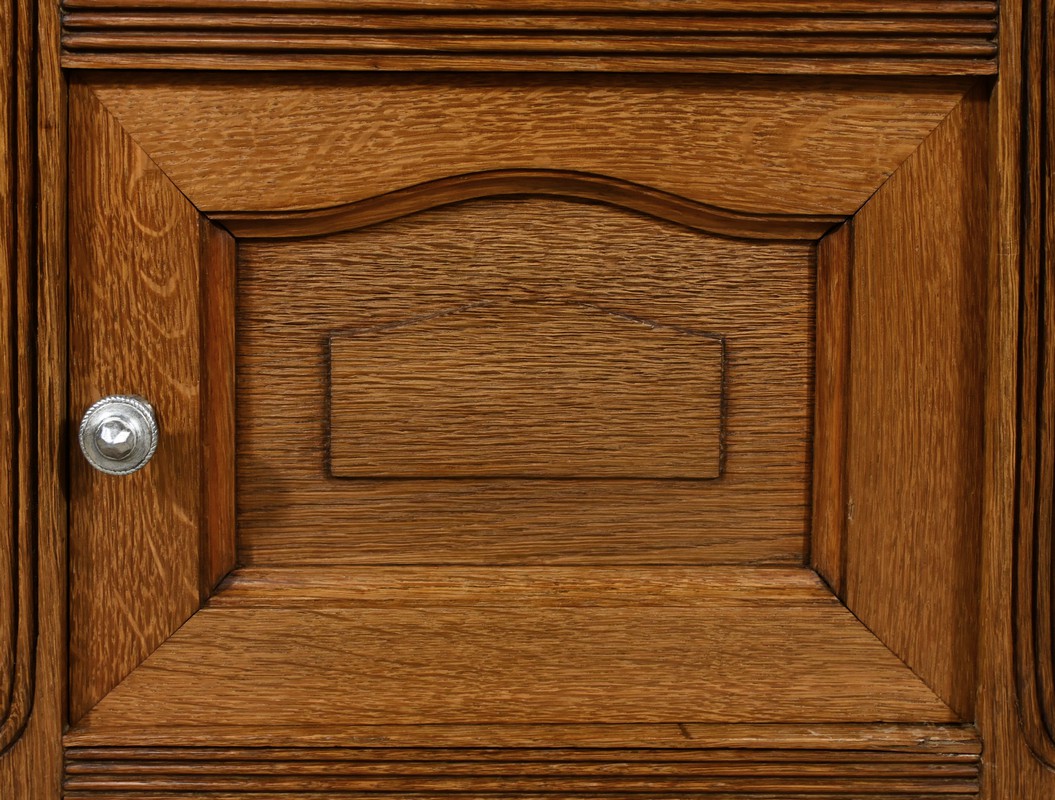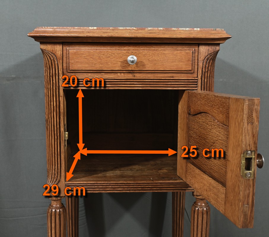 Petit meuble de rangement en chêne, doté d’un tiroir, d’une porte et d’une étagère. Ce chevet est sommé d’un marbre griotte rouge de Belgique. La façade du tiroir est moulurée en son pourtour et la porte possède un encadrement à coupe d’onglet et des moulurations en son centre. Les poignées de tirage en métal argenté sont rondes et ciselées. Les montants du meuble sont creusés et sculptés de stries dans le style Art Déco. Cette petite table repose sur des pieds cannelés s’affinant jusqu’à la tablette d’entretoise. Ce meuble de rangement est une pièce à la fois fonctionnelle et décorative.