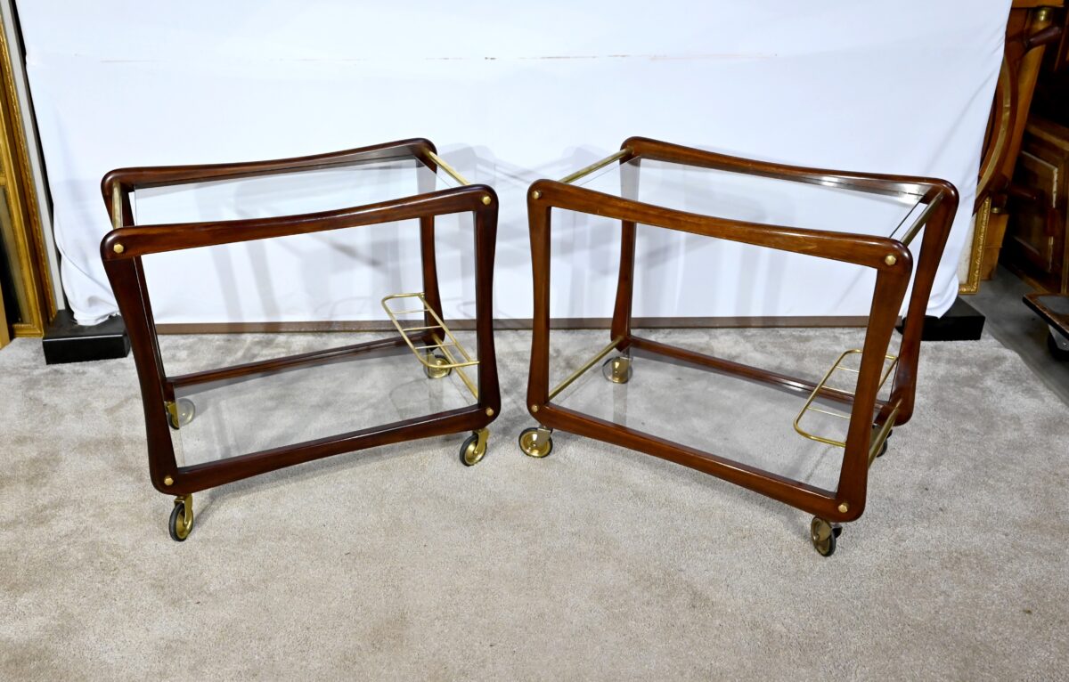 Tables roulantes composées de deux plateaux en verre, épais de 6mm, maintenus par deux cadres latéraux en acajou massif.