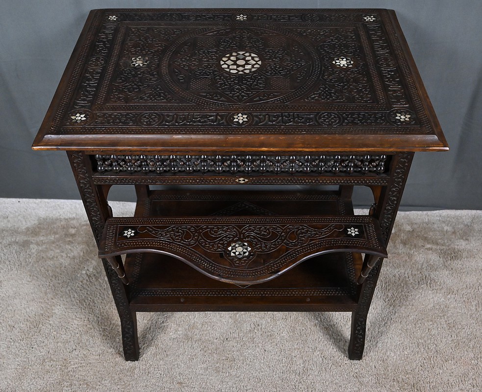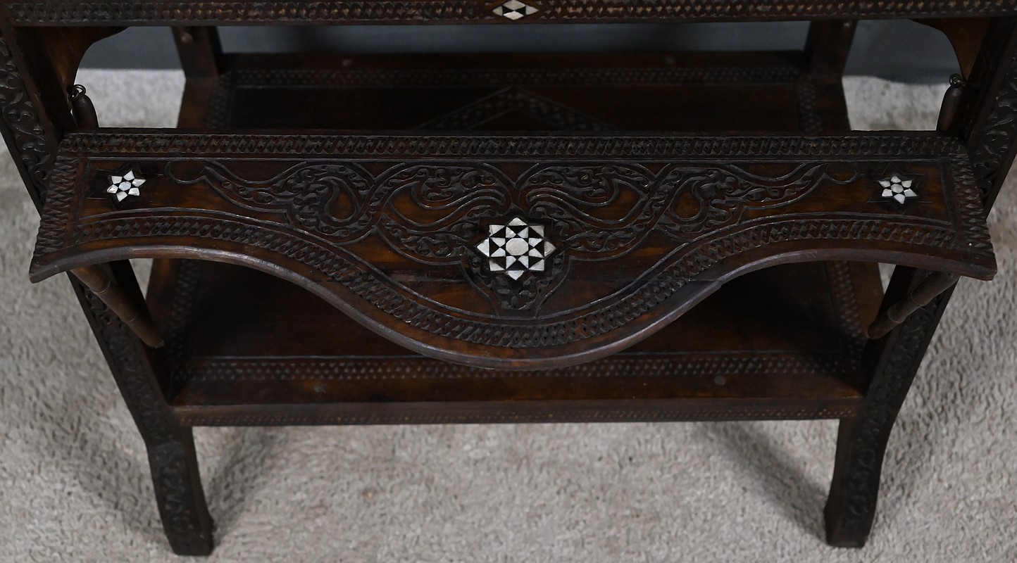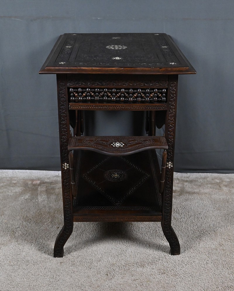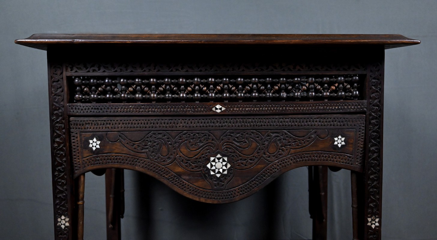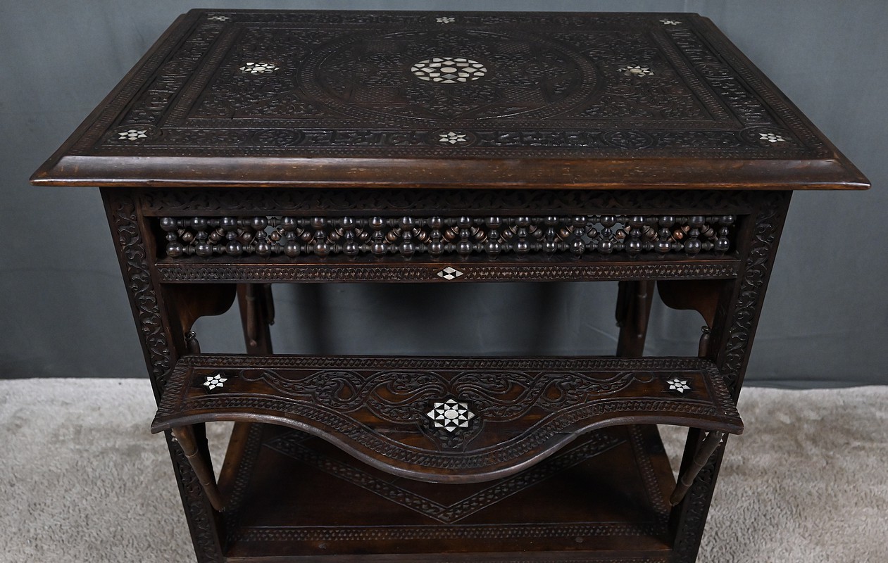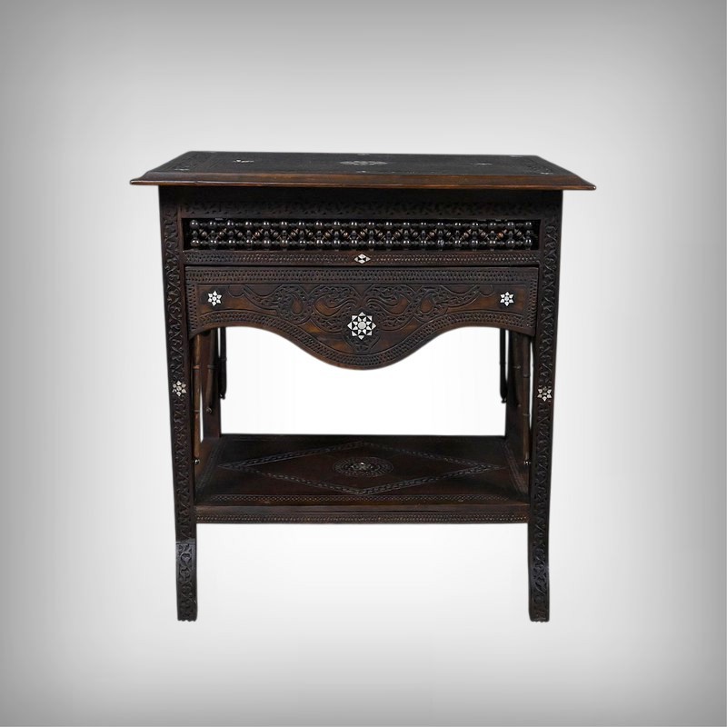 Composée de trois niveaux — un plateau supérieur, les panneaux et une étagère intermédiaire également ornée — elle combine élégance, fonctionnalité et sophistication décorative. Par son travail d’orfèvre, la qualité de ses matériaux et la finesse de son dessin, cette table syrienne en noyer incrustée de nacre s’impose comme une pièce authentique et expressive, emblématique de l’art décoratif oriental de la fin du XIXᵉ siècle.