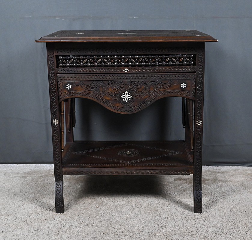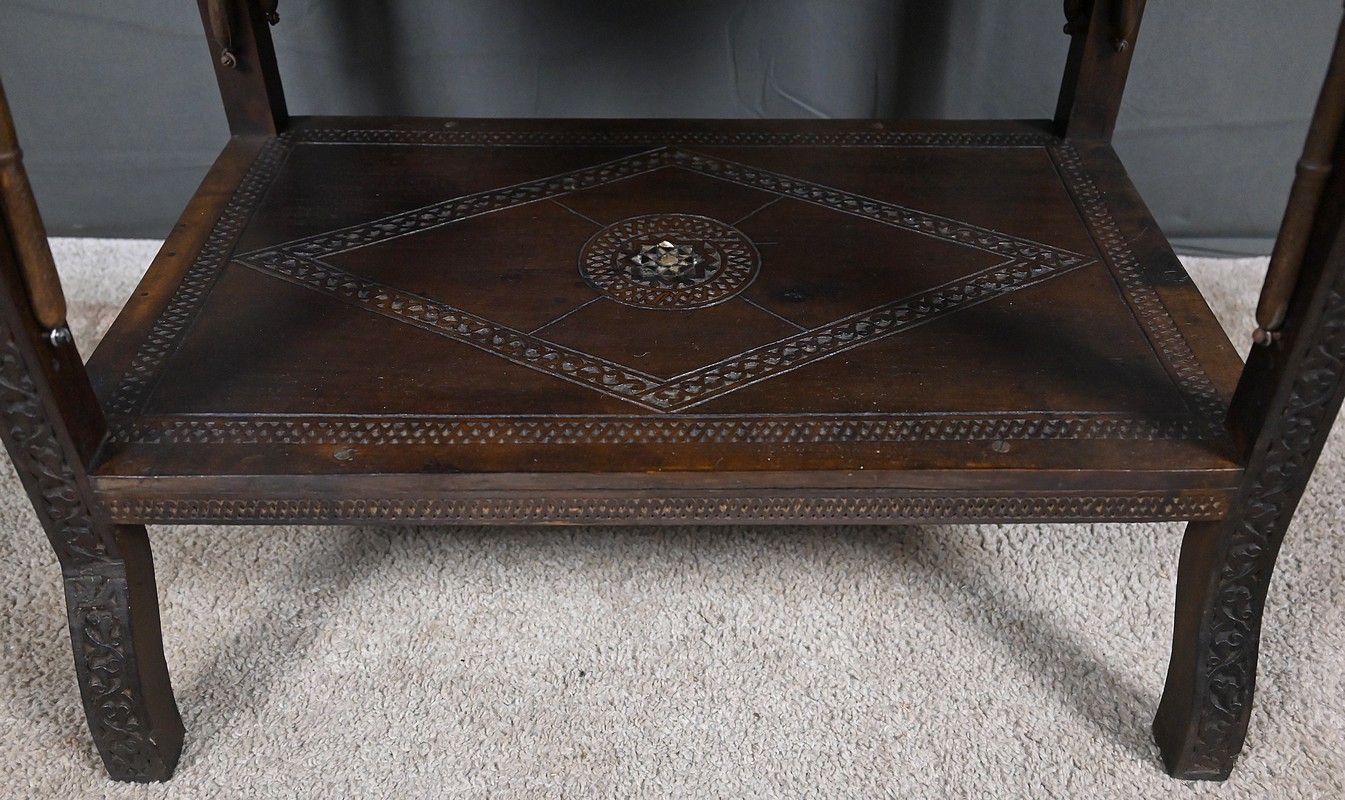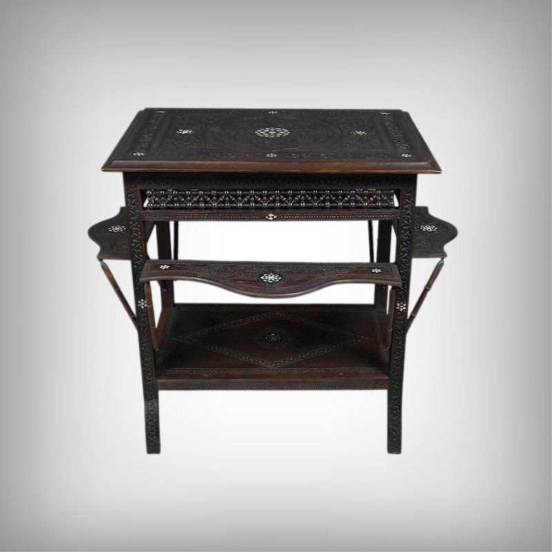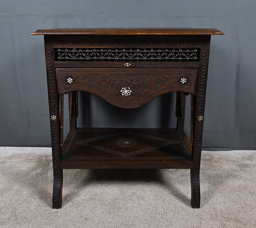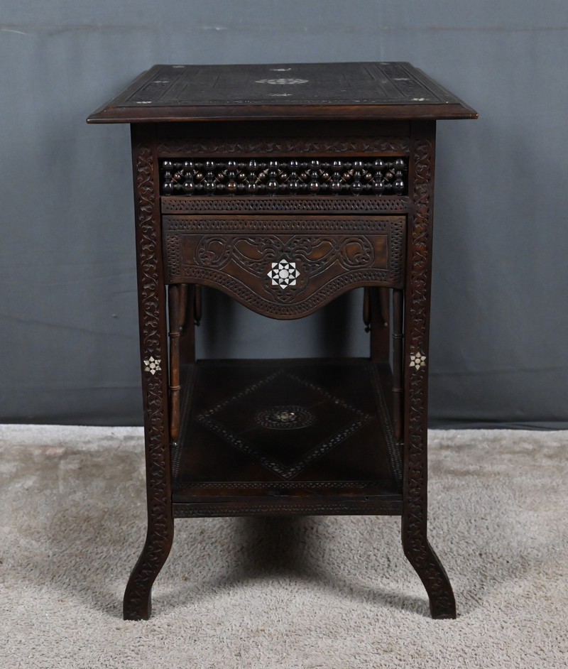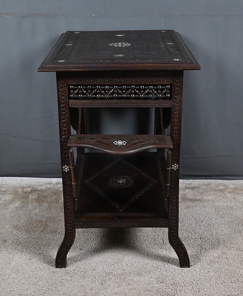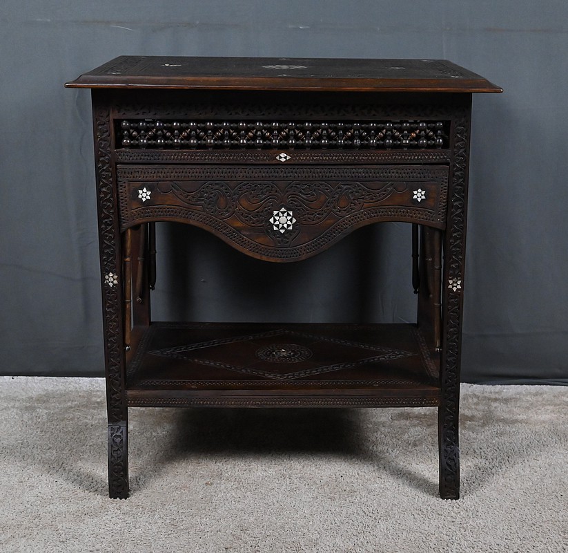 Composée de trois niveaux — un plateau supérieur, les panneaux et une étagère intermédiaire également ornée — elle combine élégance, fonctionnalité et sophistication décorative. Par son travail d’orfèvre, la qualité de ses matériaux et la finesse de son dessin, cette table syrienne en noyer incrustée de nacre s’impose comme une pièce authentique et expressive, emblématique de l’art décoratif oriental de la fin du XIXᵉ siècle.