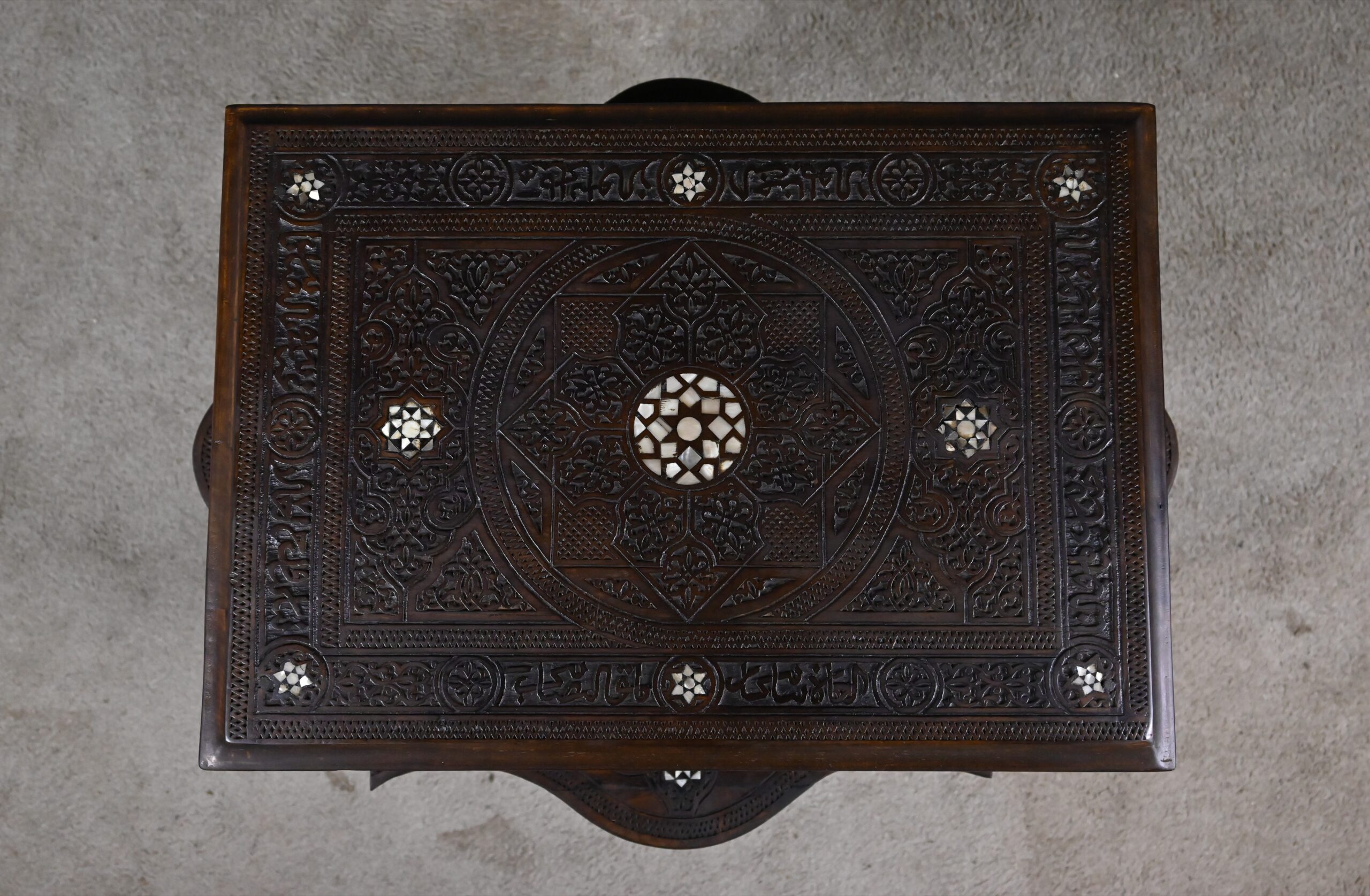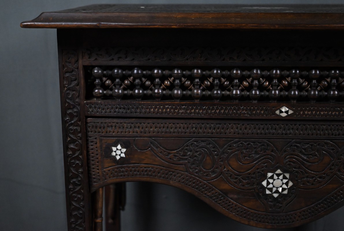Cette petite table en noyer illustre à merveille l’excellence des ateliers syriens de la fin du XIXᵉ siècle, où la sculpture minutieuse et l’incrustation de nacre se conjuguent pour créer des pièces d’un raffinement exceptionnel. Le noyer, choisi pour sa chaleur et sa densité, est travaillé avec une virtuosité remarquable : chaque face est animée de rinceaux, d’entrelacs et de motifs géométriques profondément sculptés, donnant à l’ensemble une présence vibrante et presque architecturale.