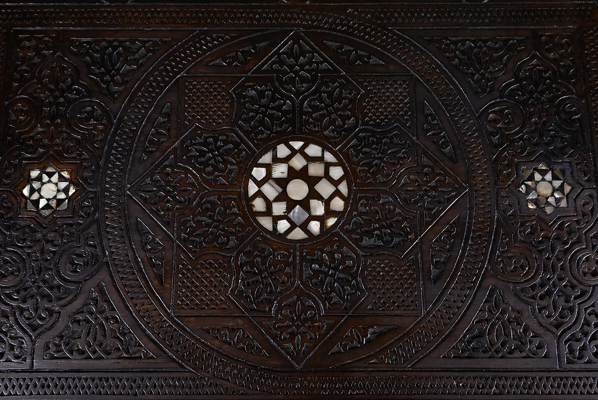 Les plateaux et panneaux sont rehaussés d’incrustations de nacre finement découpées, dont les éclats irisés soulignent la délicatesse du décor et apportent une lumière subtile à la surface du bois. Cette alternance entre matière sombre et reflets nacrés crée un jeu visuel très caractéristique des productions syriennes de prestige.