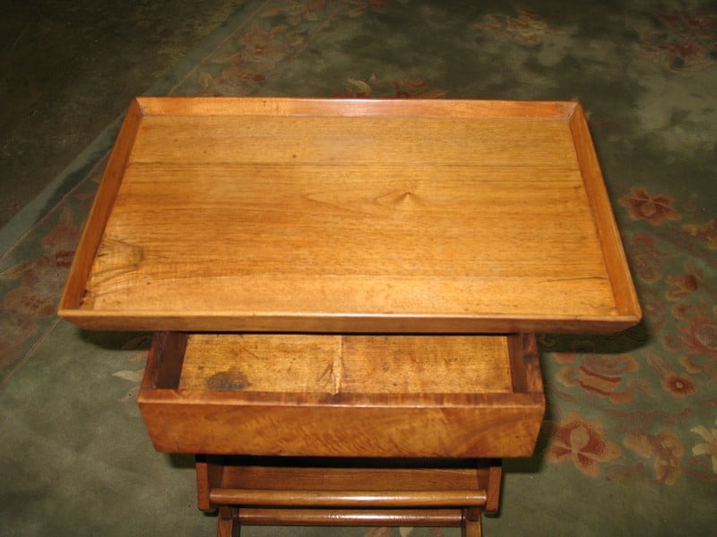Petite table vide-poche en noyer blond ouvrant à un tiroir. Dessus en cuvette et tablette d’entretoise. Époque XIXe