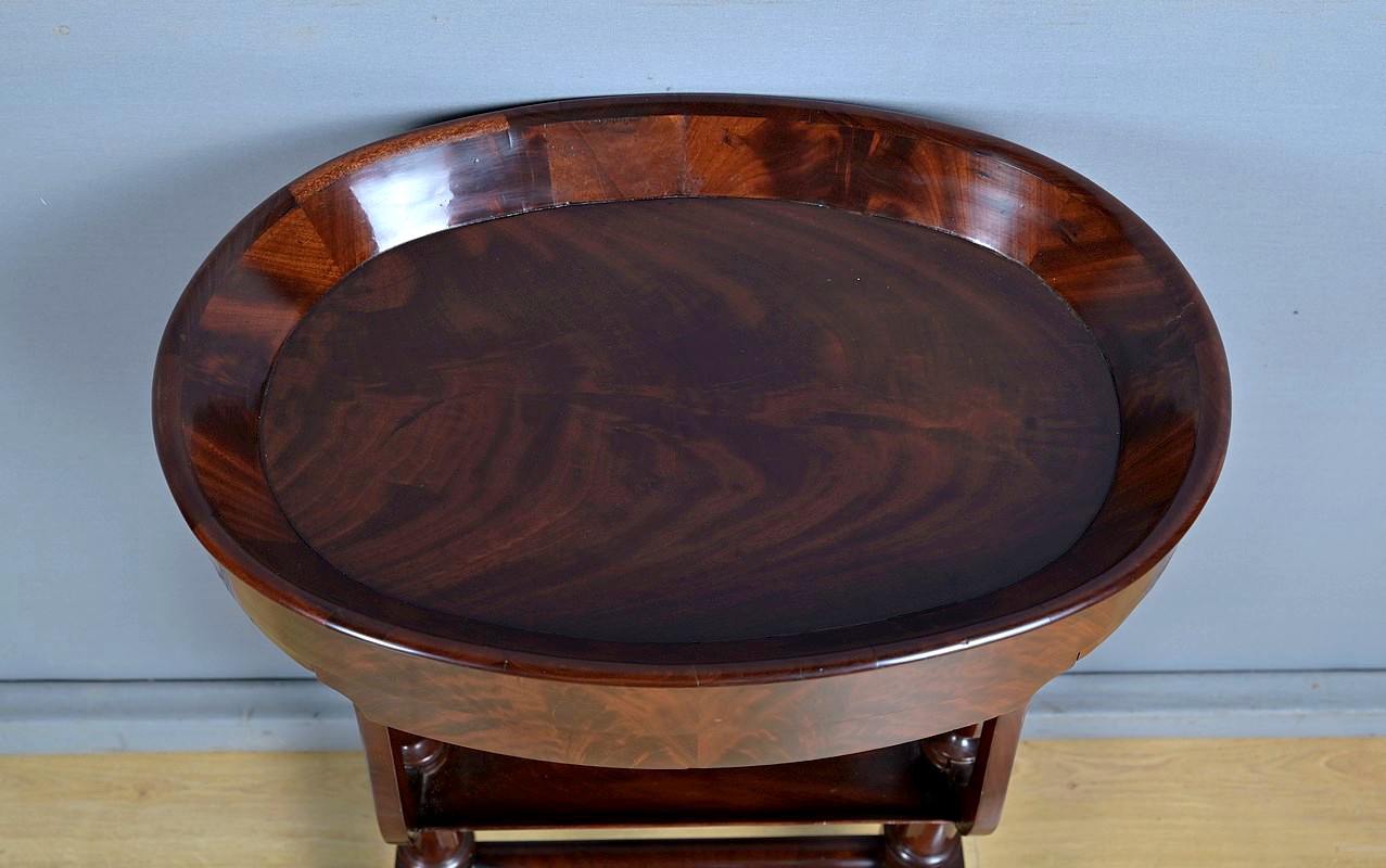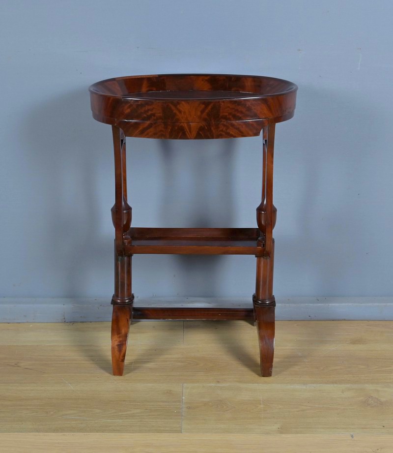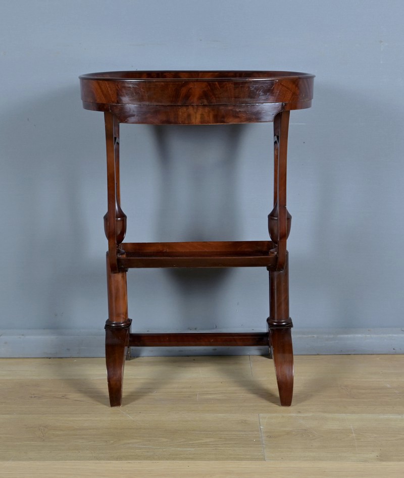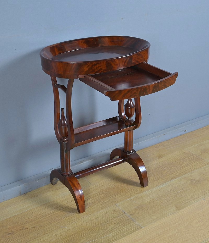 Élégante table vide-poche de l’époque Empire, en placage de ronce d’acajou, révélant une patine chaleureuse aux reflets rougeoyants. Le plateau ovale en cuvette, offre une surface accueillante tout en soulignant la rigueur géométrique propre au style impérial. Elle ouvre par un petit tiroir en ceinture, discrètement intégré.