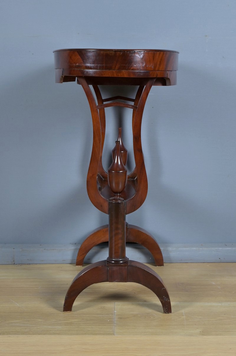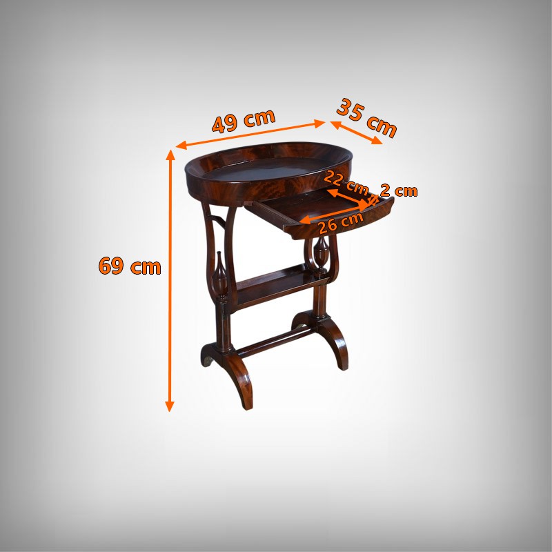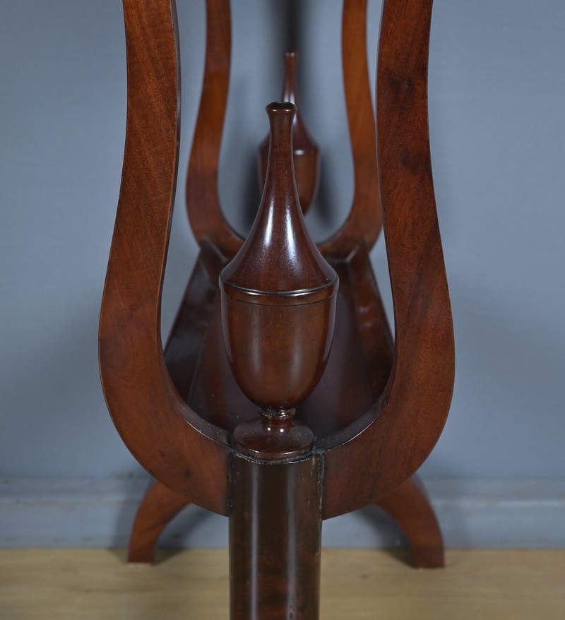 L’ensemble repose sur un piétement dont les 2 côtés en forme de lyre encadrent un balustre tourné, reposant sur des pieds arqués. Par ailleurs, cette table de salon possède une tablette d’entretoise également en cuvette, conférant à la pièce une stabilité raffinée et une allure architecturée. Les proportions équilibrées et la sobriété des ornements traduisent l’esthétique néoclassique chère au Premier Empire, où la noblesse des matériaux s’allie à la rigueur formelle.