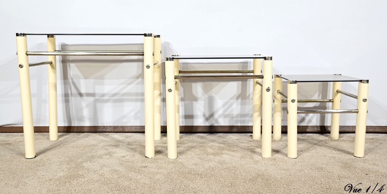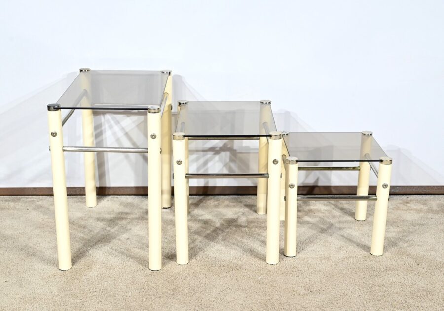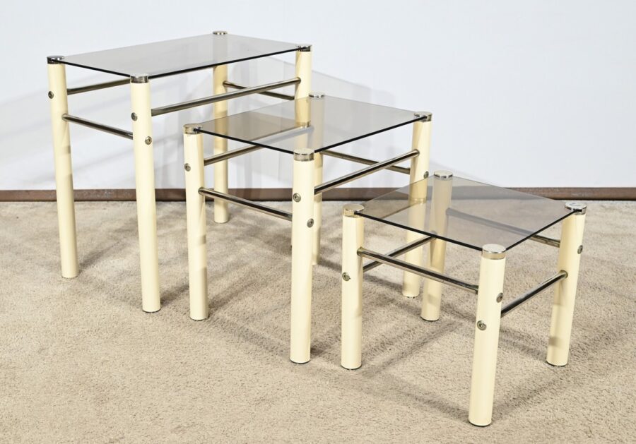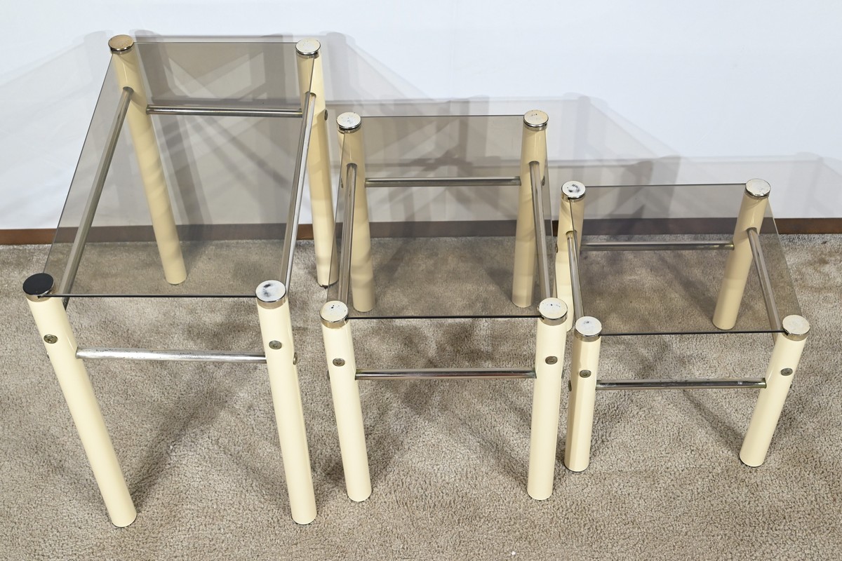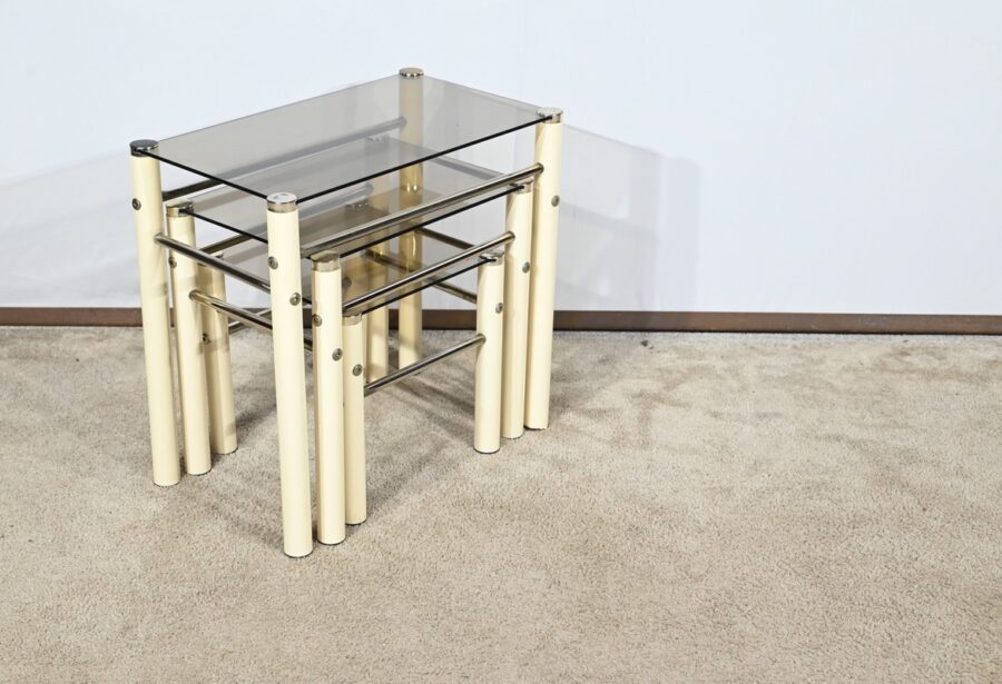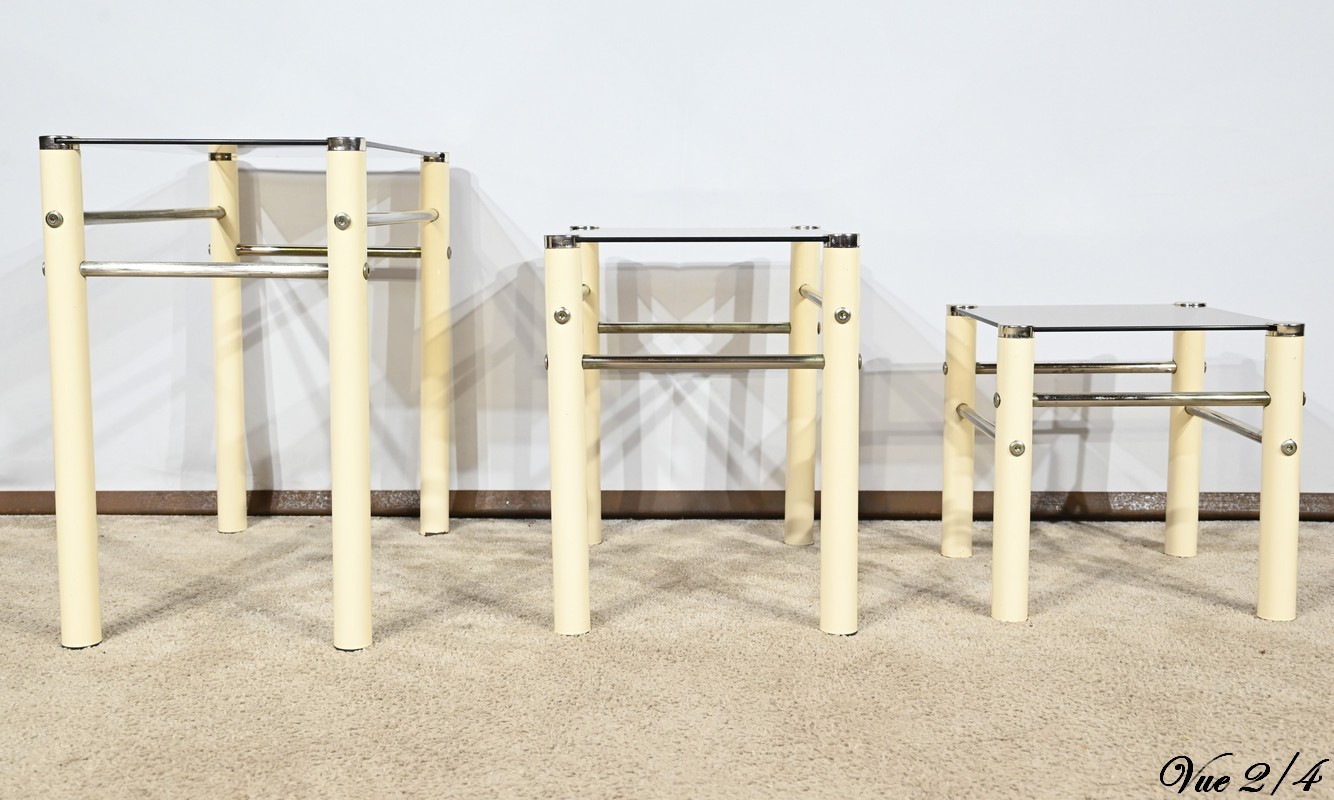 Ensemble de trois tables gigognes en métal, de couleur beige, attribuées à Yves Boutboul, designer actif au XXe.