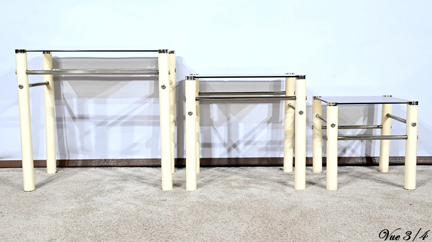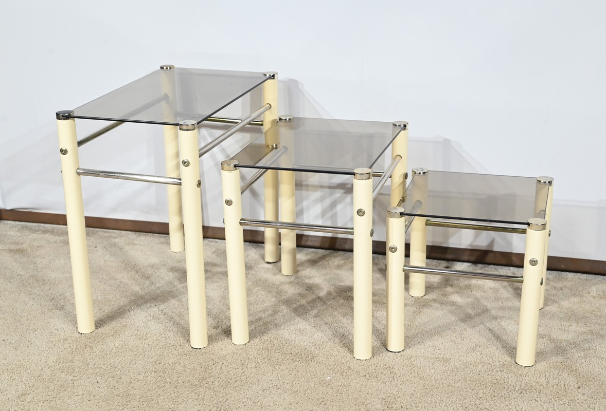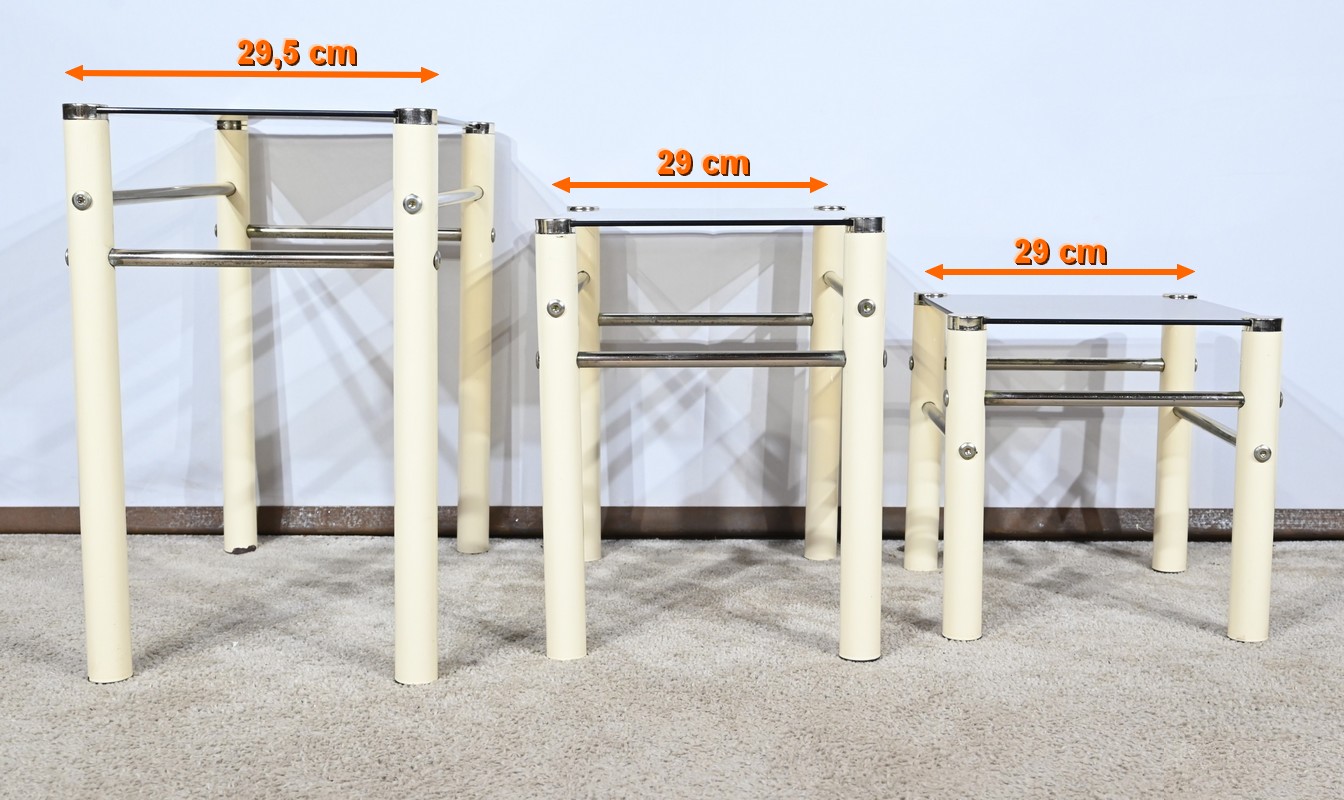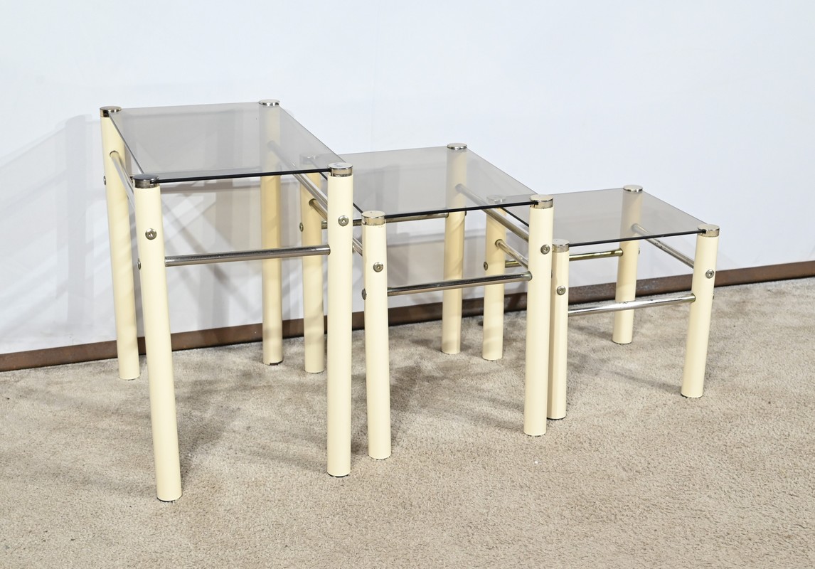 Ensemble de trois tables gigognes en métal, de couleur beige, attribuées à Yves Boutboul, designer actif au XXe.