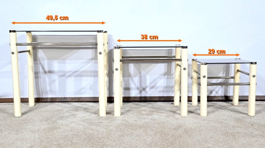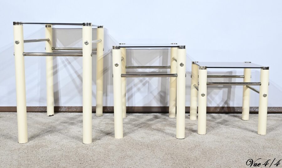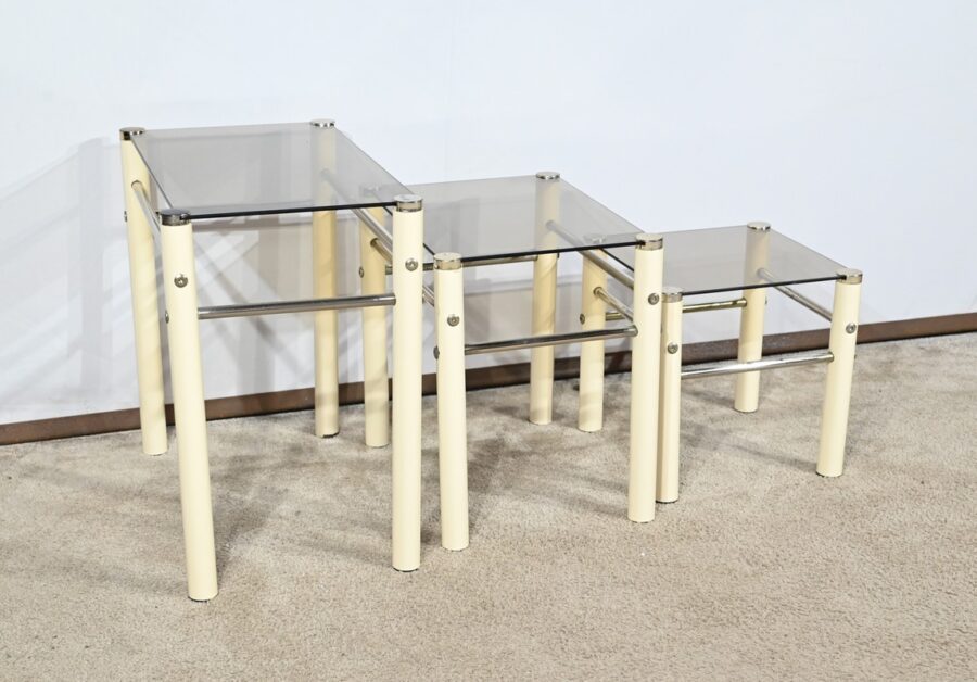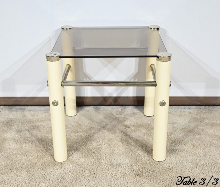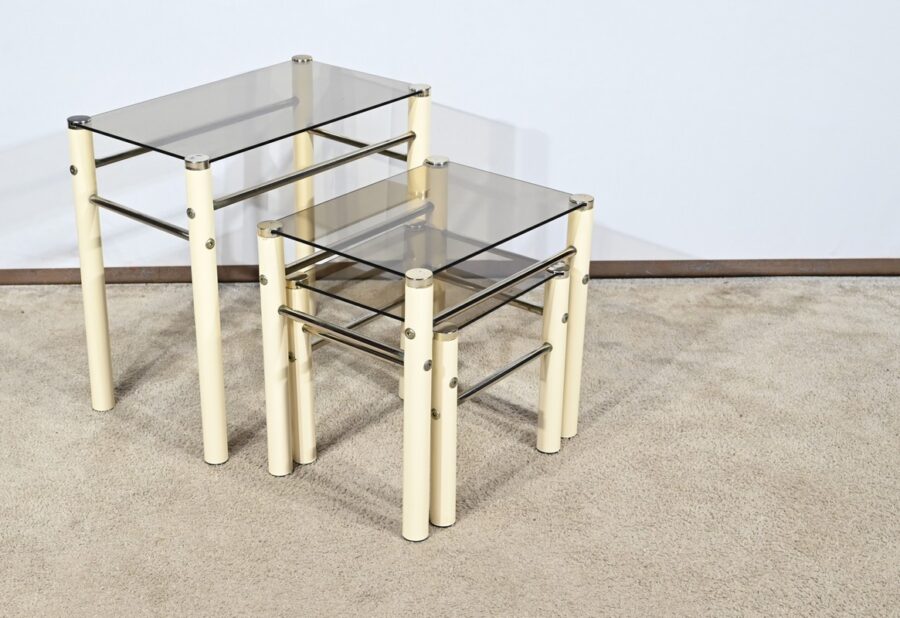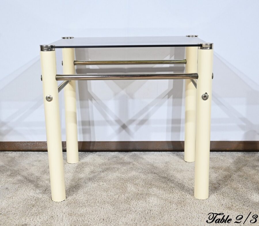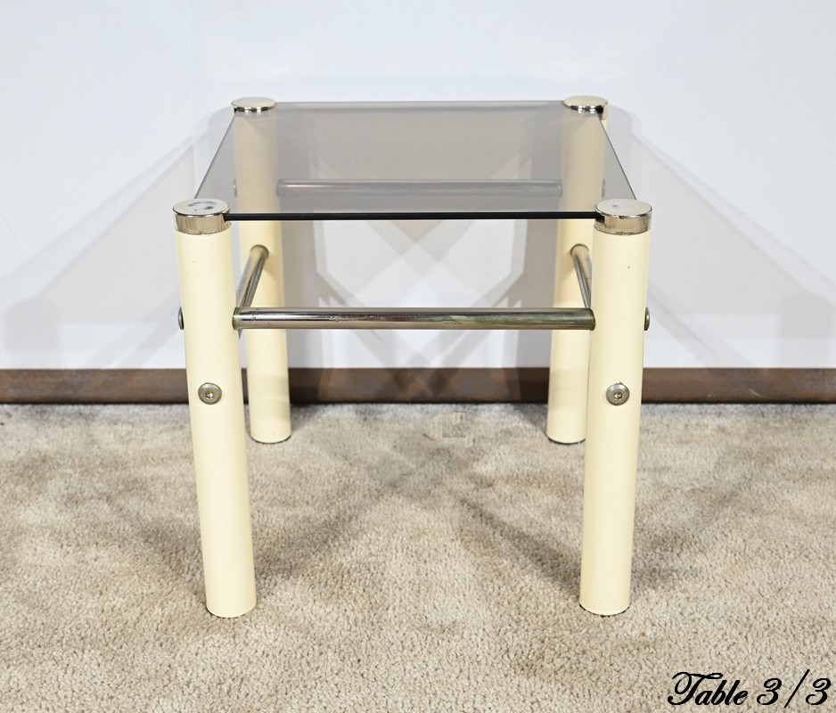 Chaque plateau en verre trempé, légèrement fumé, est intégré dans une bague en métal chromé se profilant sur des pieds tubulaires droits solidarisés par de fines traverses également chromées.