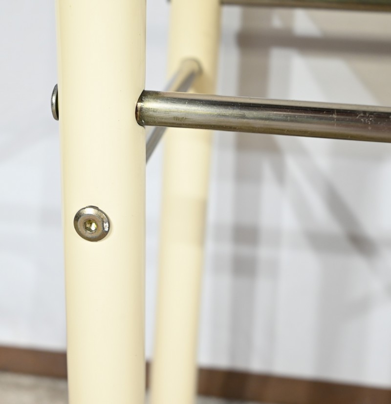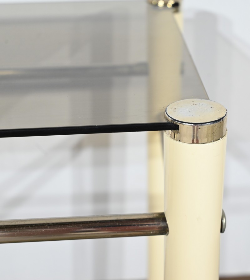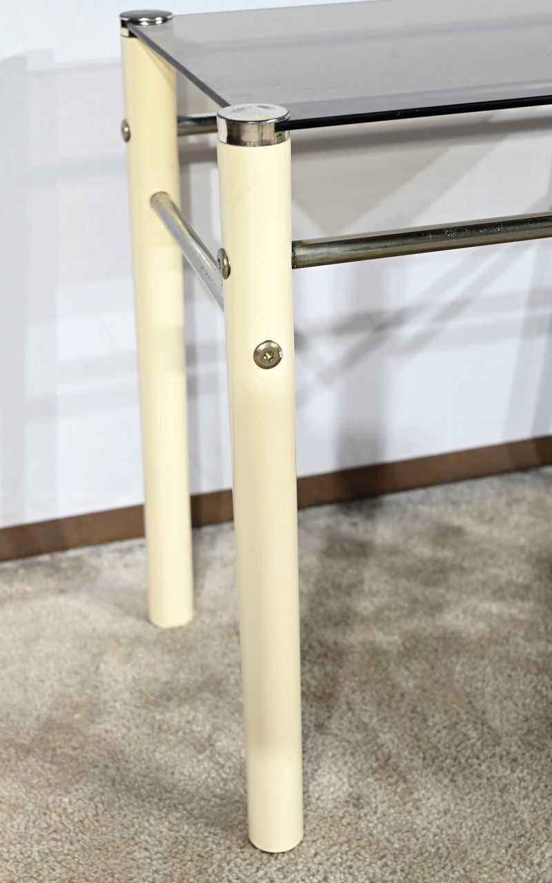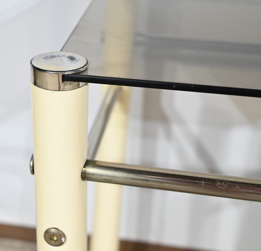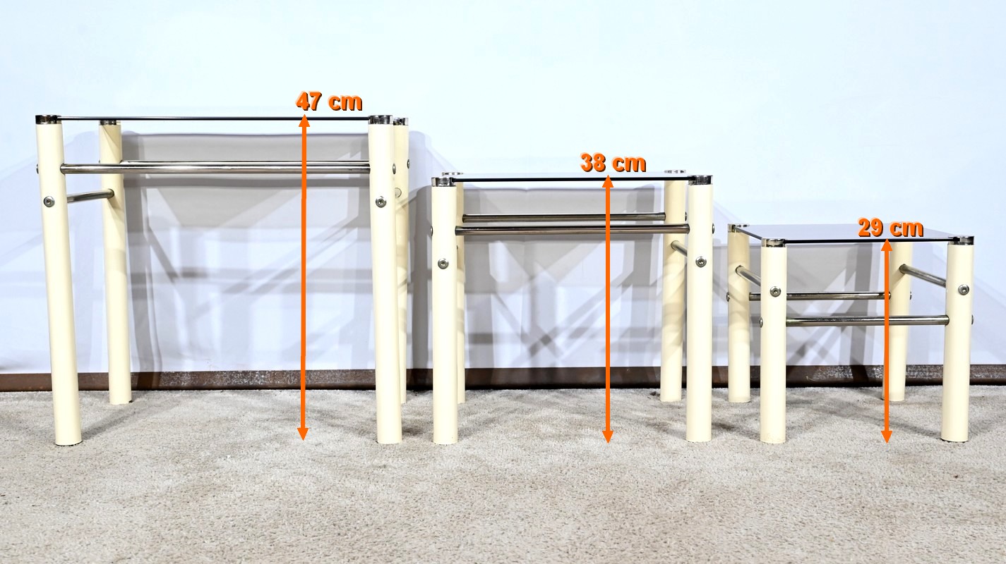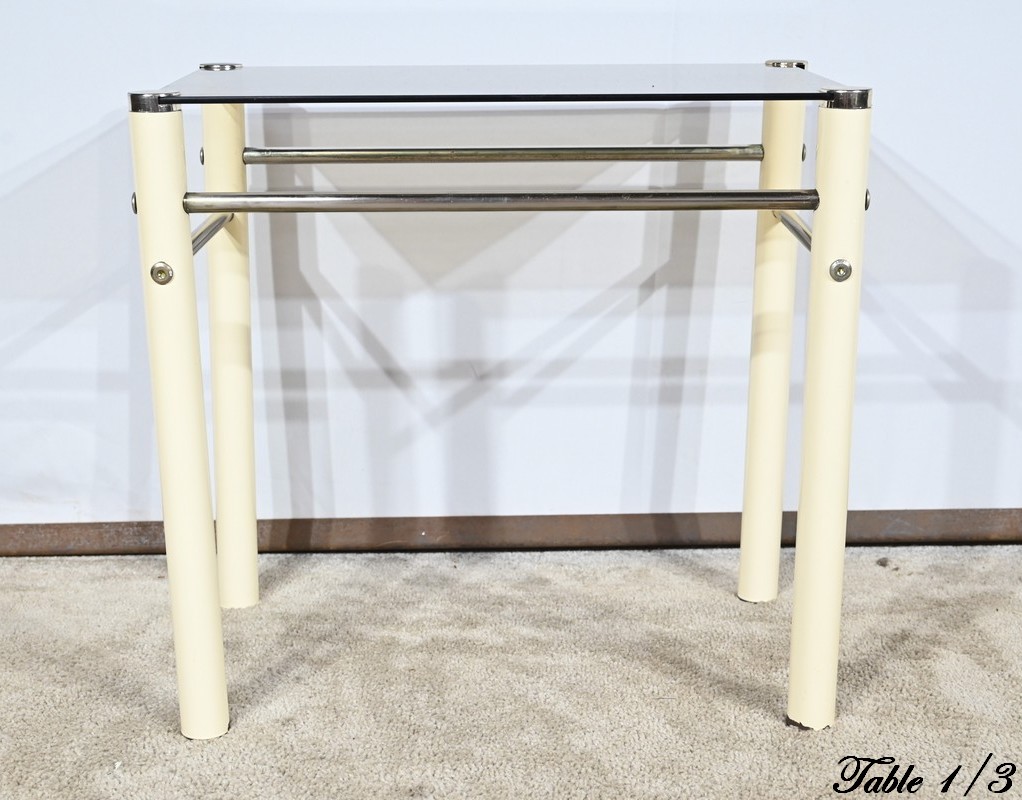 Chaque plateau en verre trempé, légèrement fumé, est intégré dans une bague en métal chromé se profilant sur des pieds tubulaires droits solidarisés par de fines traverses également chromées.