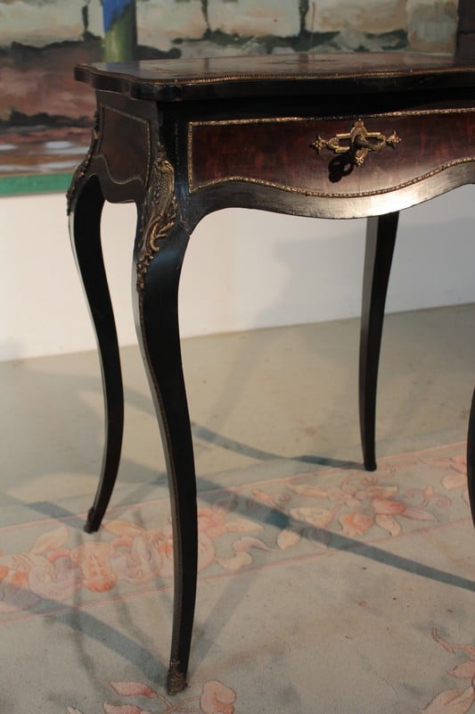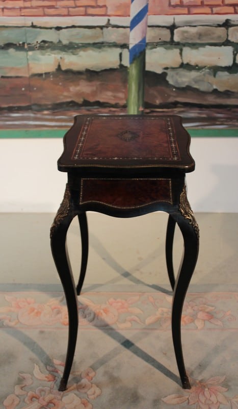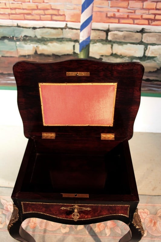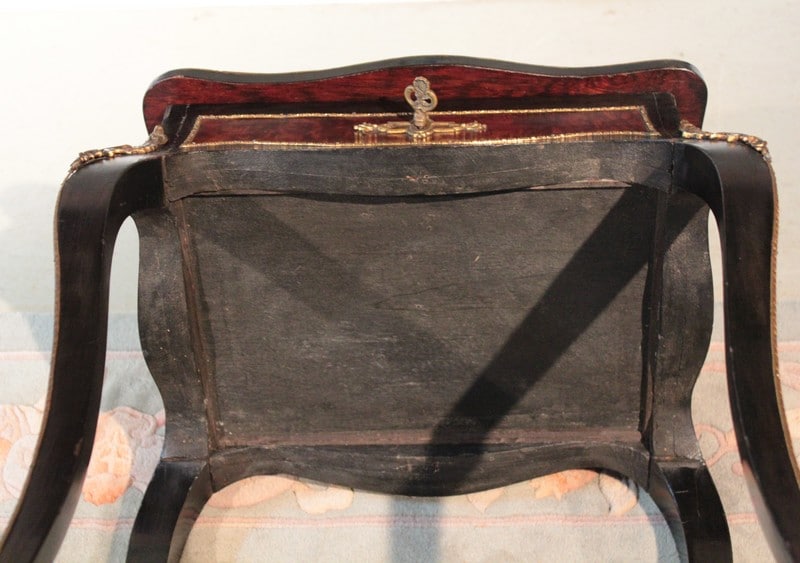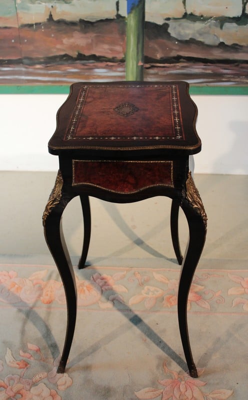 Travailleuse de style Louis XV, en bois noirci, d’époque NAPOLÉON III. Elle repose sur 4 pieds galbés ornés de bronzes. Le dessus – ainsi que les côtés – est en loupe de thuya, encadré d’une marqueterie de nacre et d’écaille de tortue. Plaque de laiton découpée en son milieu. Moulurations et ornementations de bronze. Intérieur en palissandre. Quelques accidents.