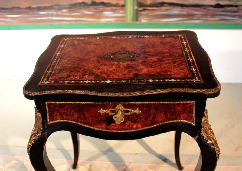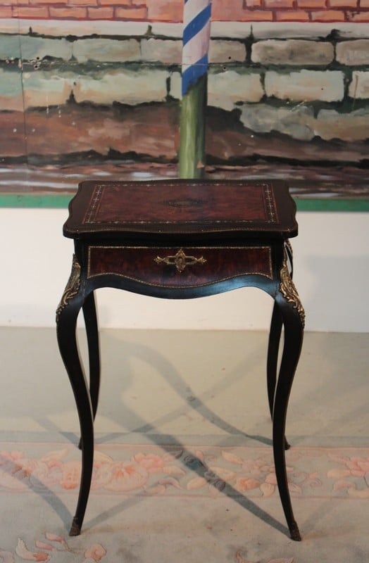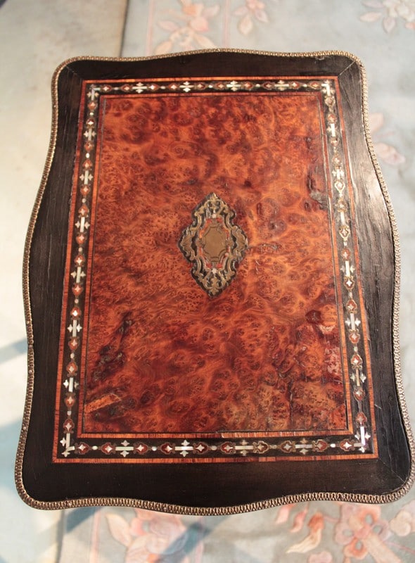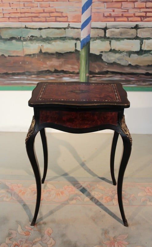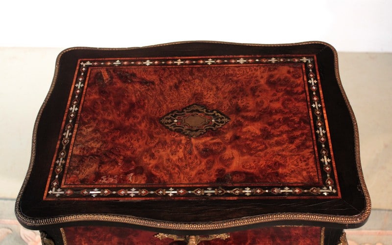Travailleuse de style Louis XV, en bois noirci, d’époque NAPOLÉON III. Elle repose sur 4 pieds galbés ornés de bronzes. Le dessus – ainsi que les côtés – est en loupe de thuya, encadré d’une marqueterie de nacre et d’écaille de tortue. Plaque de laiton découpée en son milieu. Moulurations et ornementations de bronze. Intérieur en palissandre. Quelques accidents.