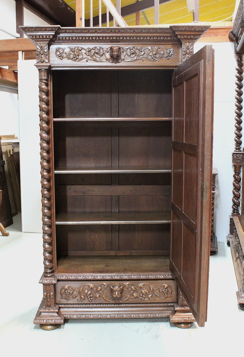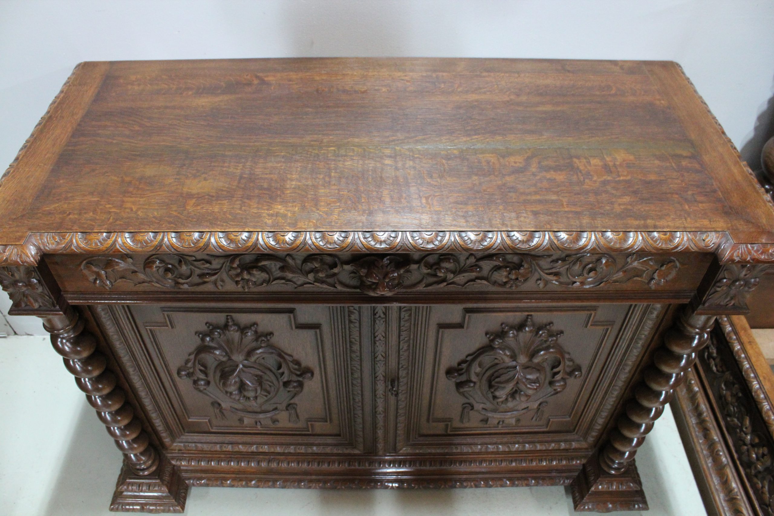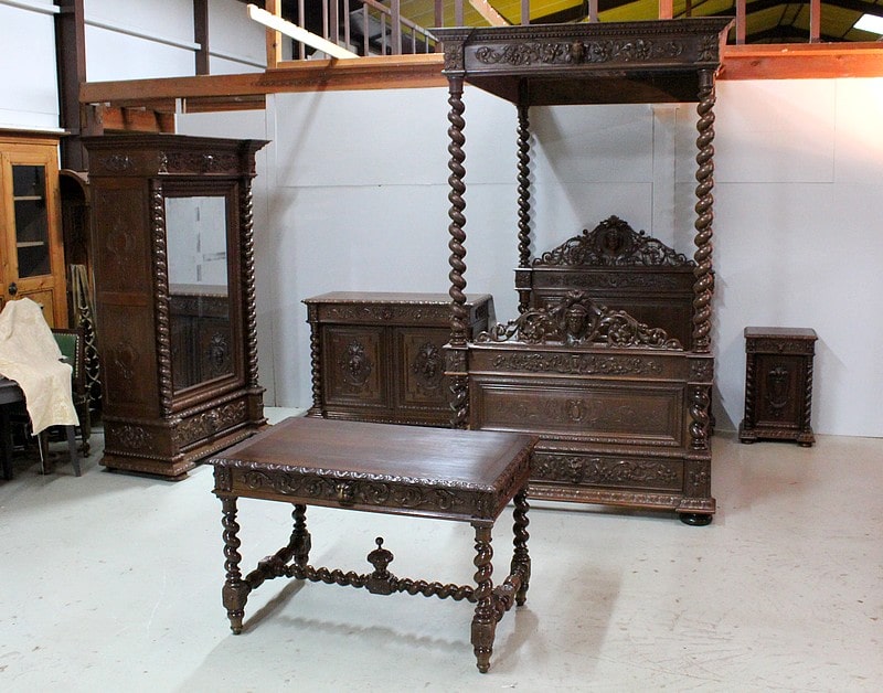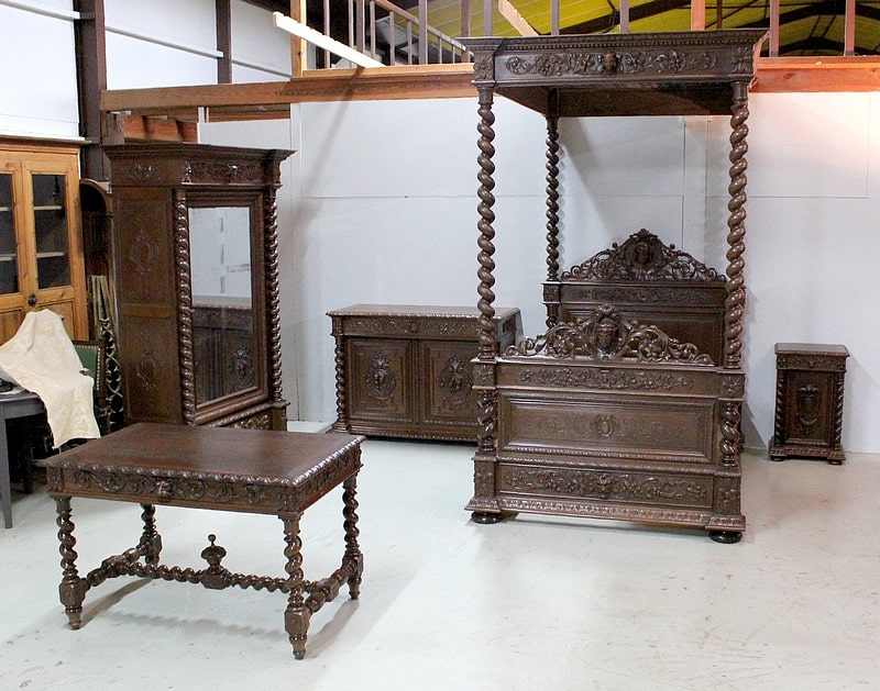 Ensemble important d’une chambre de style Louis XIII en chêne richement sculpté de rinceaux feuillagés, de masques de personnages, de grotesques ainsi que de cartouches ornés de fruits.