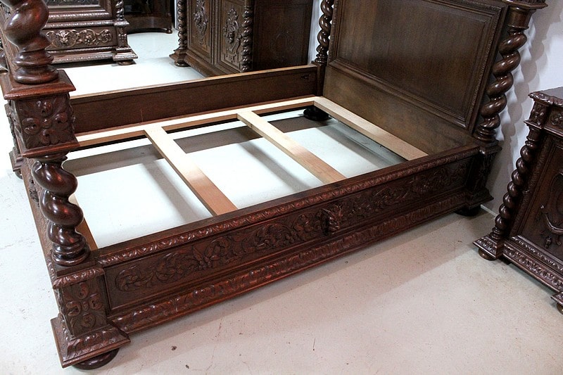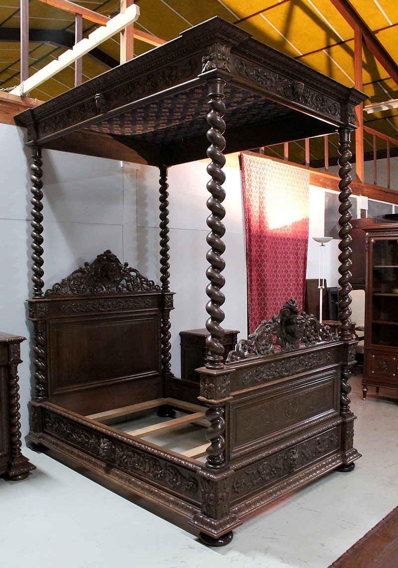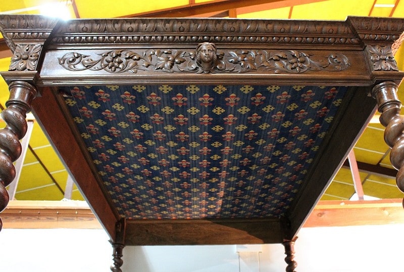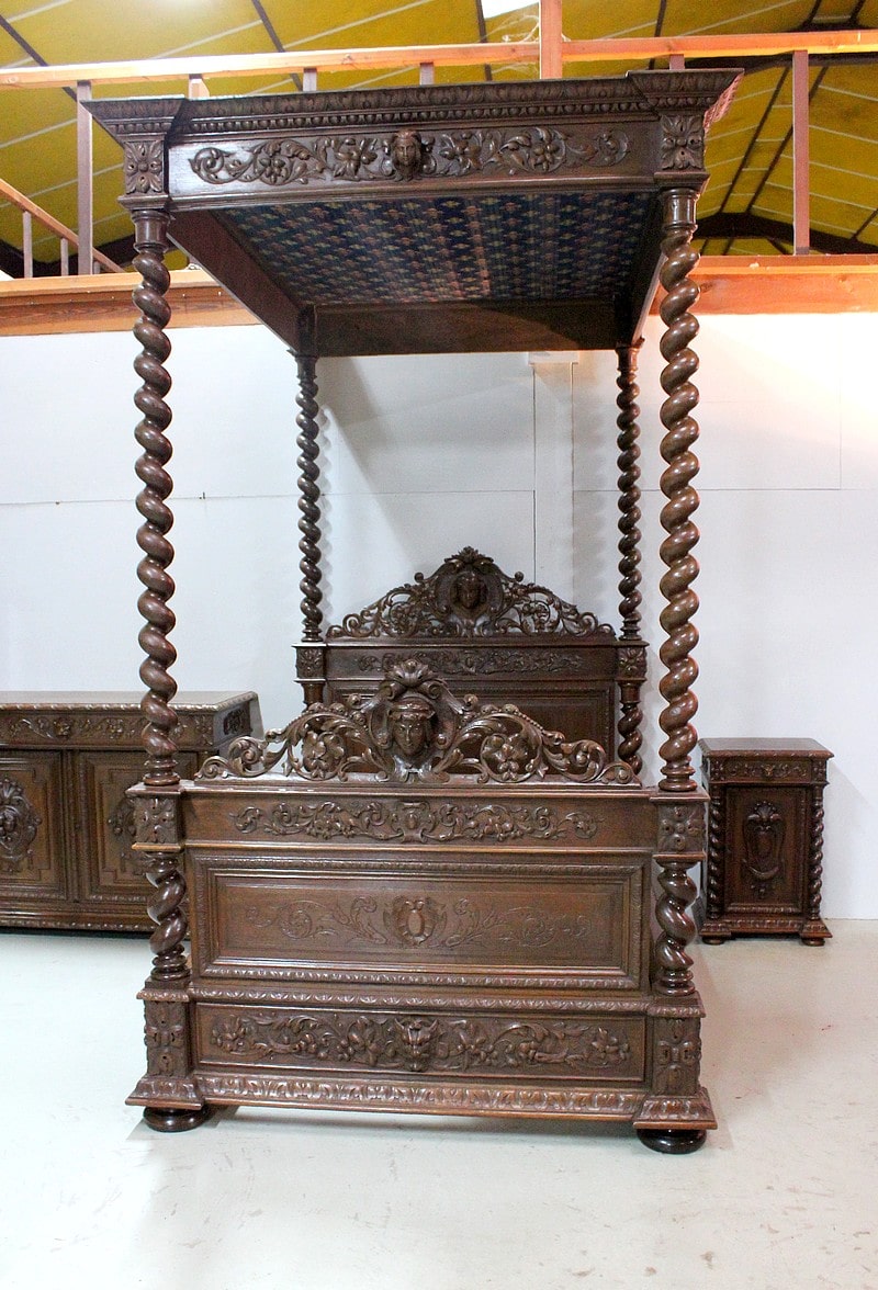 – Un lit à baldaquin avec support de literie refait sur mesure. La partie haute du baldaquin est agrémentée de son ciel de lit bleu à décors de fleurs de lys et les montants sont en colonnes torses.