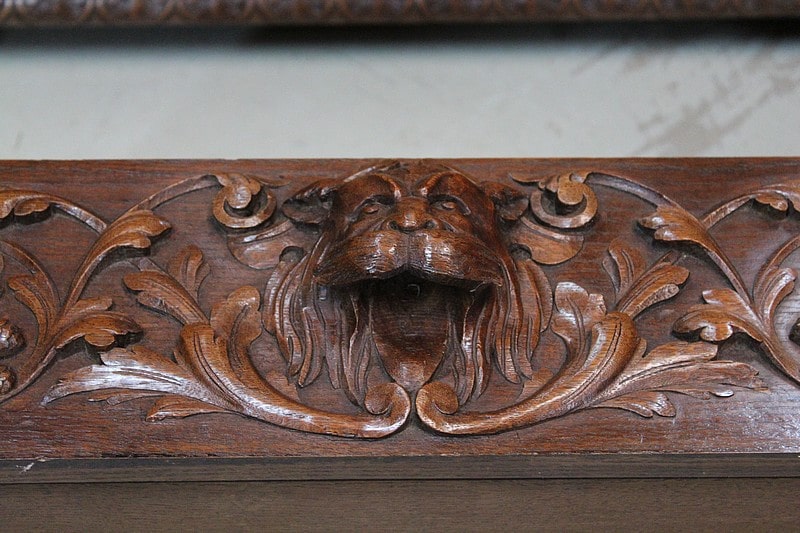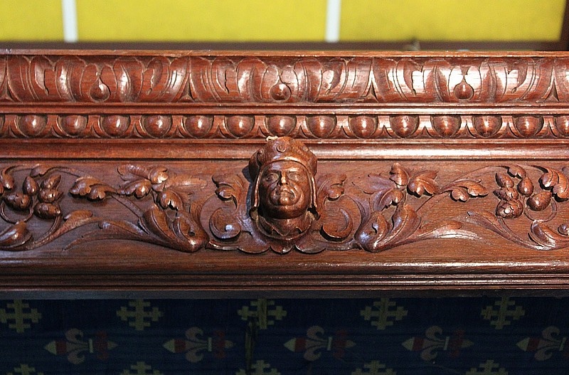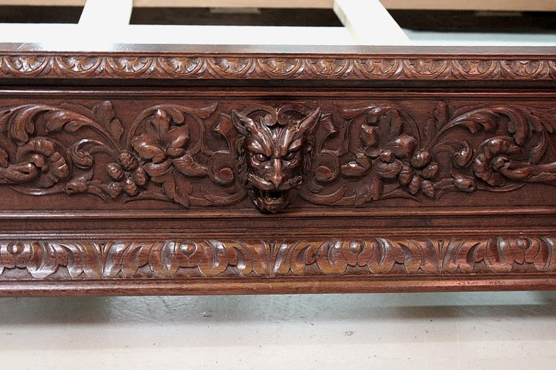 – Un chevet sculpté des mêmes ornements que le lit. Il ouvre par un tiroir en ceinture dont la poignée est sculptée d’une tête animale et ouvre par une porte en dessous sculptée en façade d’un cartouche ovale.