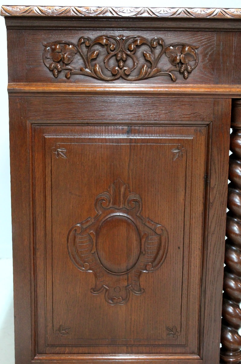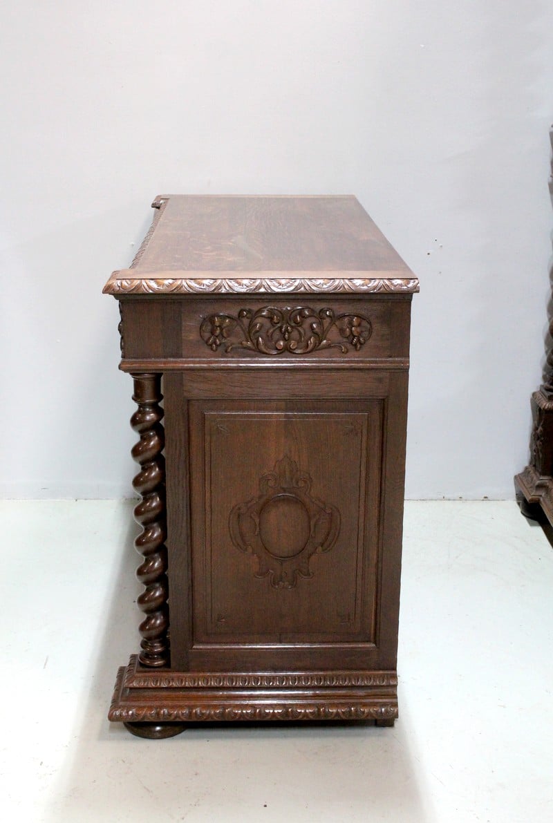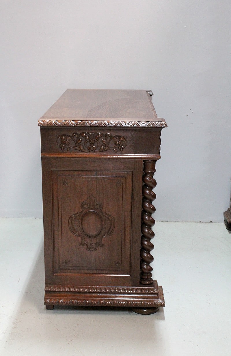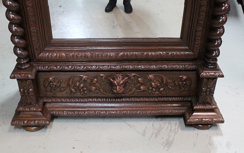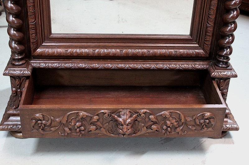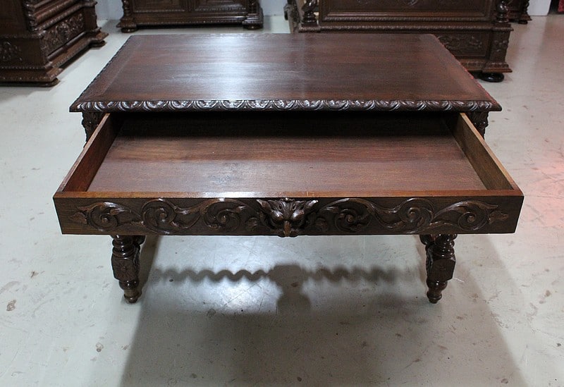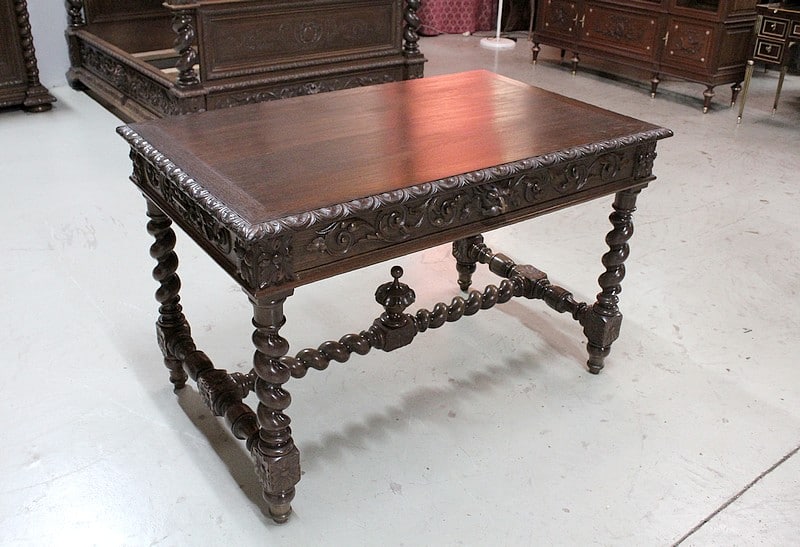 – Une table bureau toutes faces ornée des mêmes sculptures ouvrant par un tiroir en ceinture avec sa poignée en tête animale creuse. Ses pieds et montants en colonnes torses sont entretoisés et agrémentés d’une sculpture centrale.