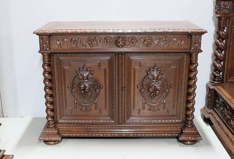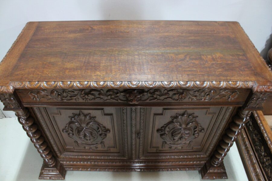 – Une commode richement sculptée à l’instar des autres meubles ouvrant à 1 tiroir en ceinture ainsi que 2 portes révélant 3 tiroirs dont les côtés sont découpés en forme mouvementée vers l’avant.