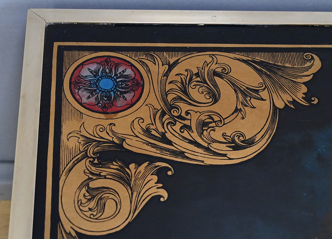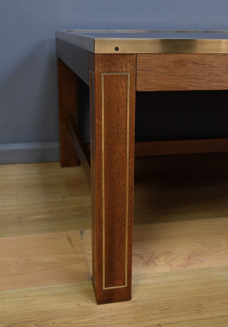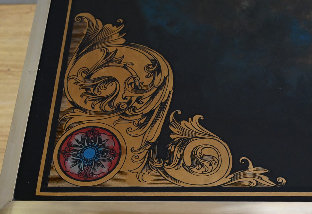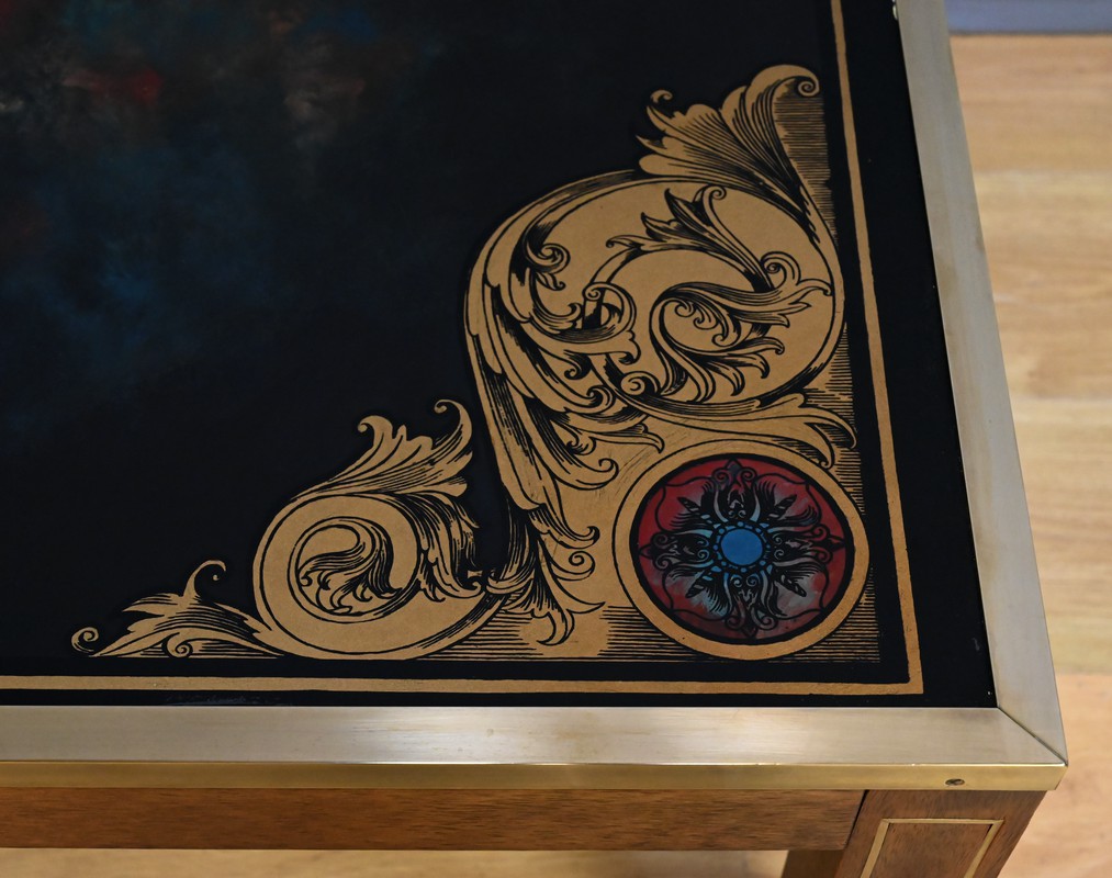 Cette grande table basse en acajou se distingue par son caractère rare et son élégance singulière. Le plateau en verre églomisé, véritable œuvre d’art, mêle volutes dorées et nuances picturales dans un jeu subtil de contrastes. Un large échiquier peint sur l’envers décore également cette table insolite. Les cases noires se détachent sur un fond aux tonalités mêlées, évoquant le cosmos et ses vibrations de lumière. Les coins du plateau sont ornés de motifs floraux et de médaillons étoilés aux accents rouges et bleus, apportant une touche de faste inspirée des arts décoratifs. Entouré d’un cadre en laiton, ce plateau repose sur une structure solide au piétement incrusté de filets de laiton, relié par une entretoise qui renforce l’équilibre et la prestance de l’ensemble.