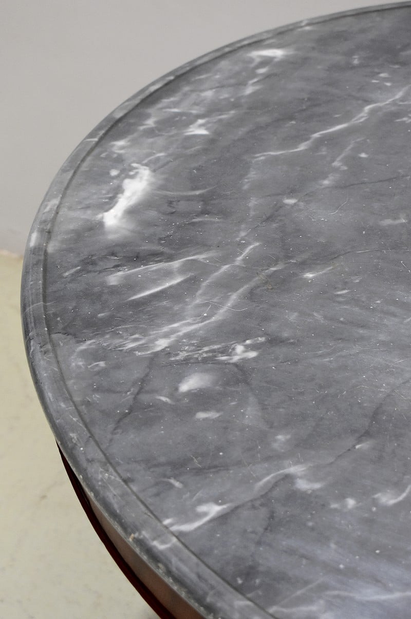 Il arbore un dessus en marbre gris clair veiné de blanc et mouluré en cuvette d’origine et en parfait état.