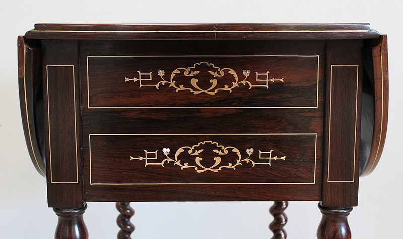 Ce Meuble d’une Exceptionnelle Qualité est muni d’un dessus Oblongue avec deux abattants Pliants décorés d’incrustations de Nacre.