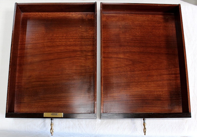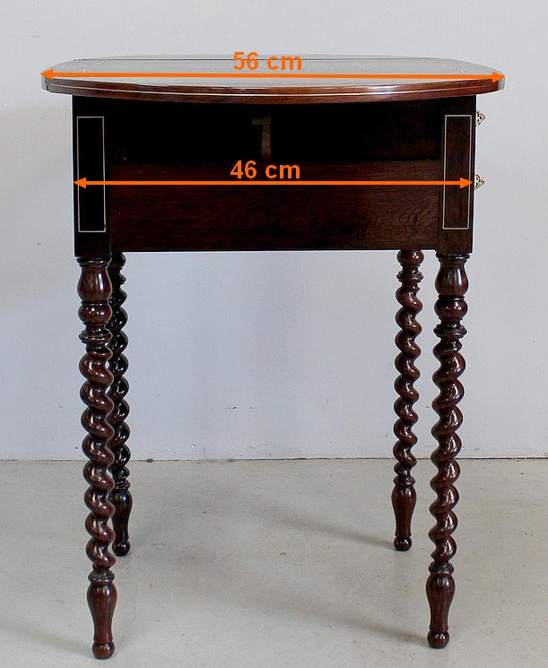En façade, le Palissandre traité avec incrustations est orné de motifs et d’un filet de Laiton dans le pourtour. Deux Tiroirs avec leurs Serrures d’Origine en Parfait état de fonctionnement avec leur clé, sont composés d’un intérieur et de côtés en Acajou Massif. Sur l’arrière, deux faux Tiroirs reproduisent les motifs avant.