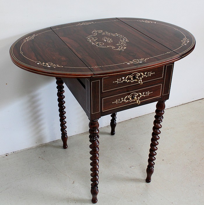 Distinguée et Gracieuse, cette Petite Table à Volets rabattables et aux Ornementations délicates, trouvera aisément place dans un intérieur Raffiné.