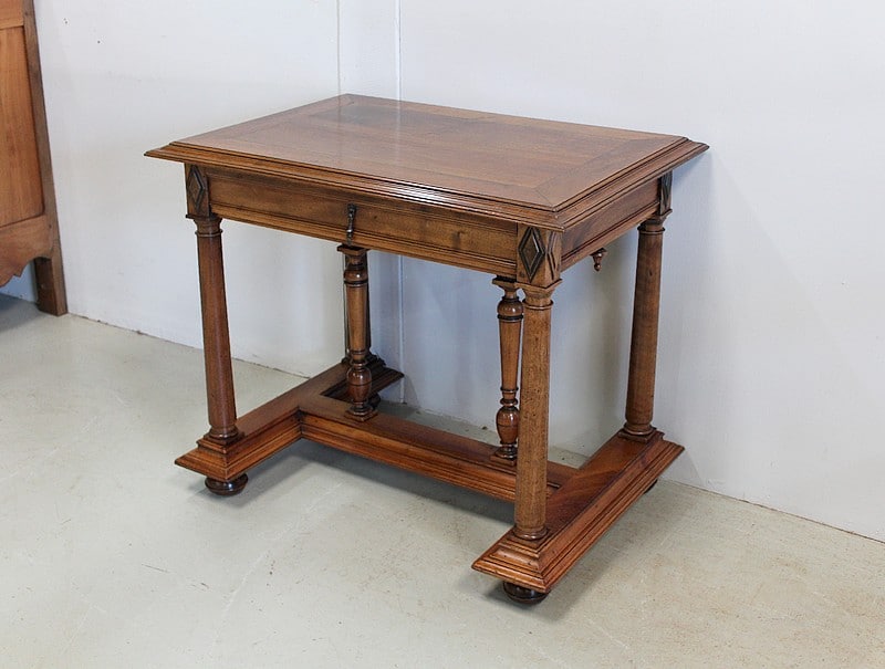 Elle repose sur 4 pieds en colonnes moulurées ainsi que sur 2 autres pieds centraux en balustres et sculptures en ogives, tous reposant sur une entretoise en H à multiple moulures, sur pieds boules aplaties.