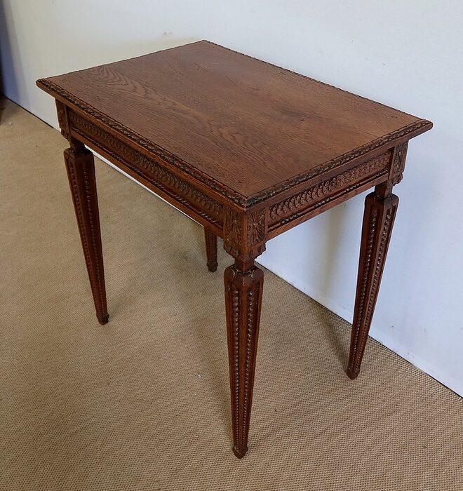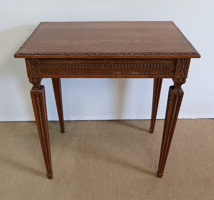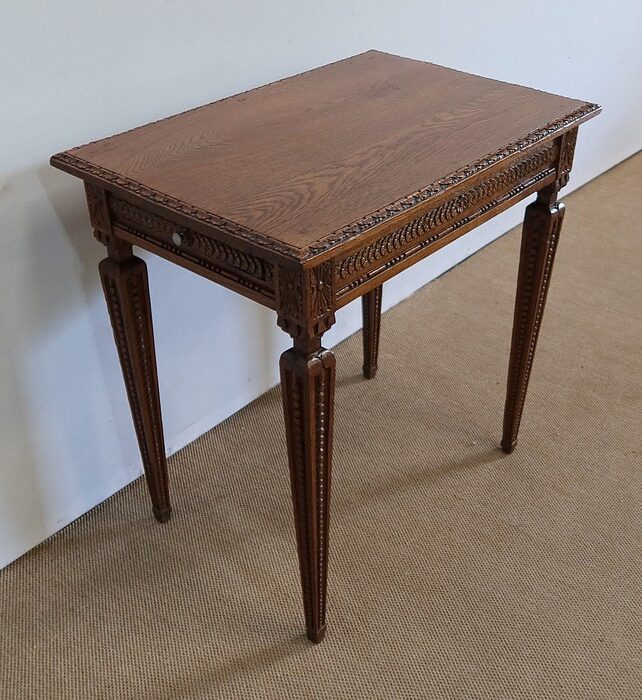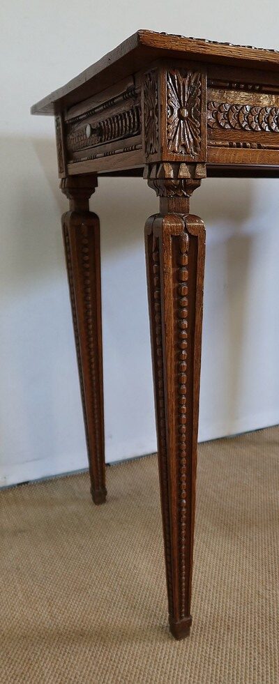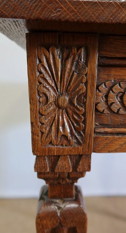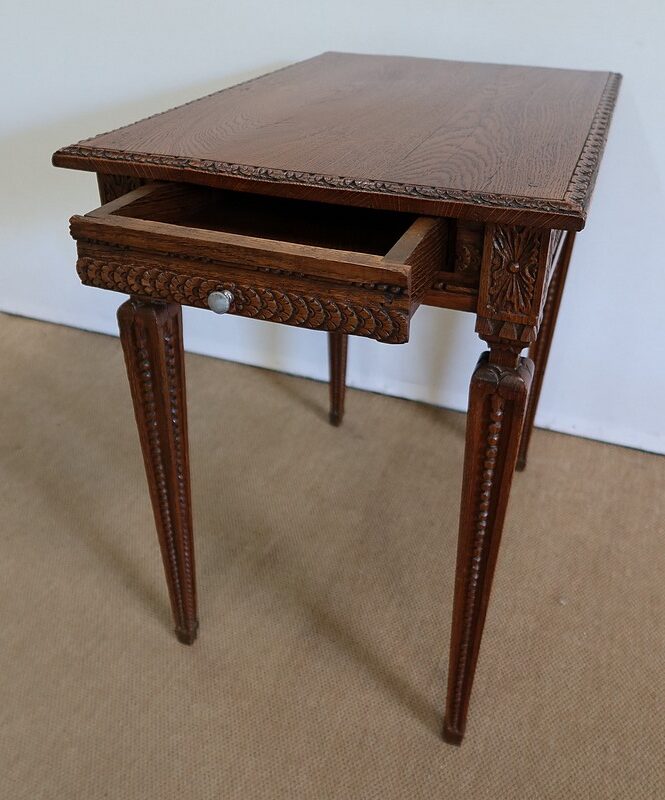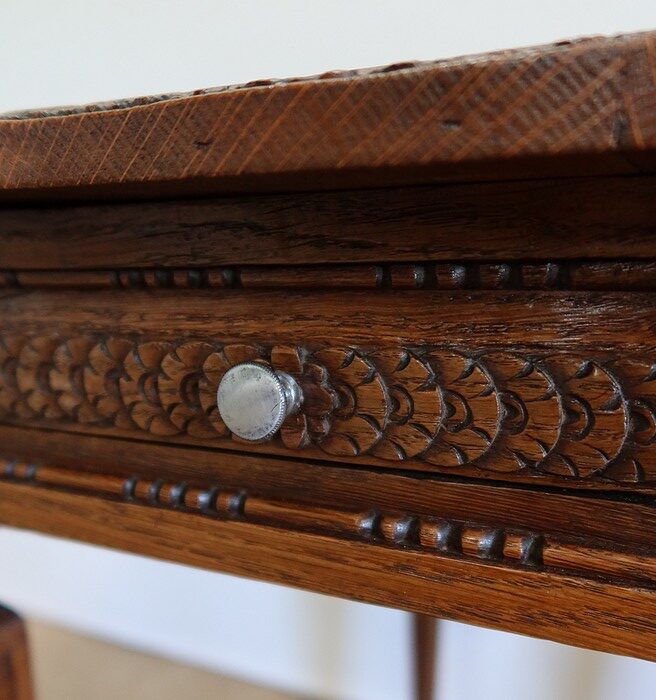 Petite Table en Chêne massif, avec dessus constitué de deux planches parfaitement raccord, rendant leur jonction presque indistincte. Le pourtour de ce plateau à débord est festonné.