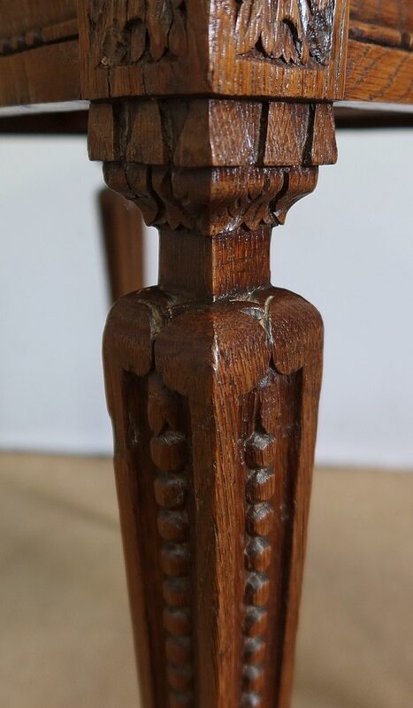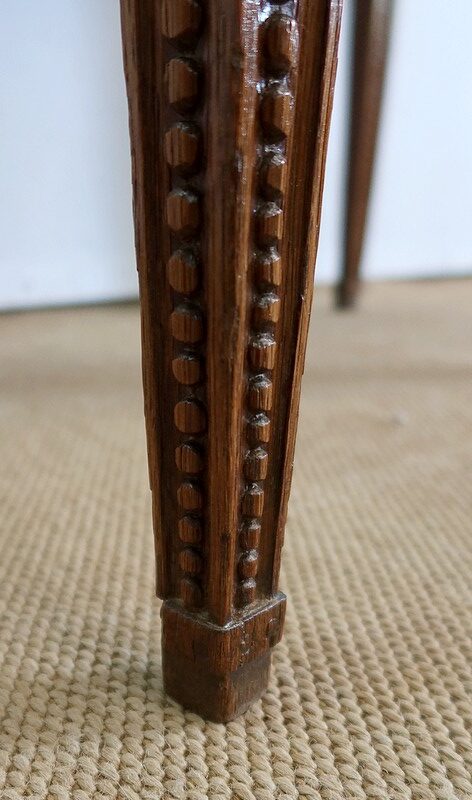 L’ensemble repose sur quatre pieds gainés, enrichis sur leurs quatre côtés de frises de perles, de tailles décroissantes, taillées dans l’épaisseur du bois.