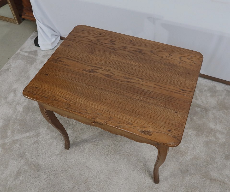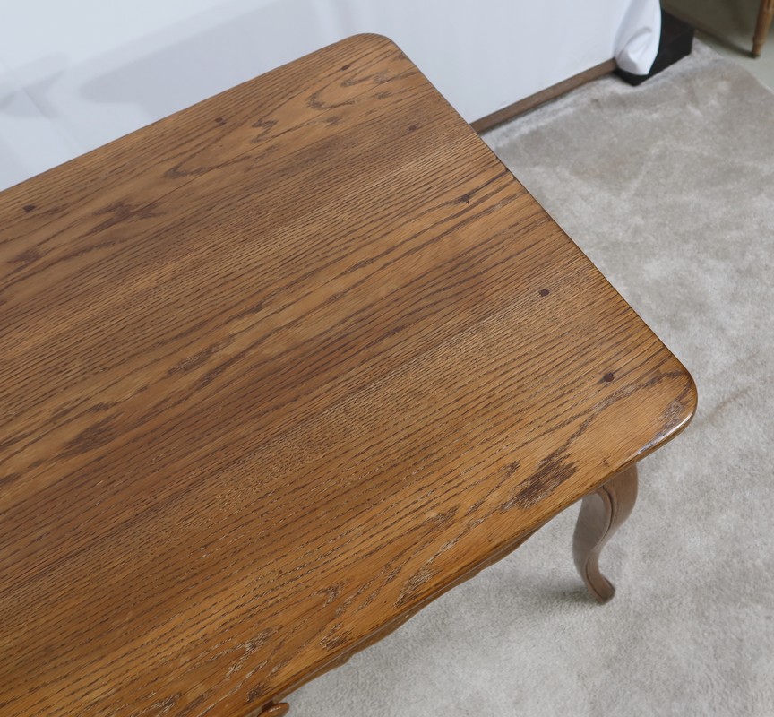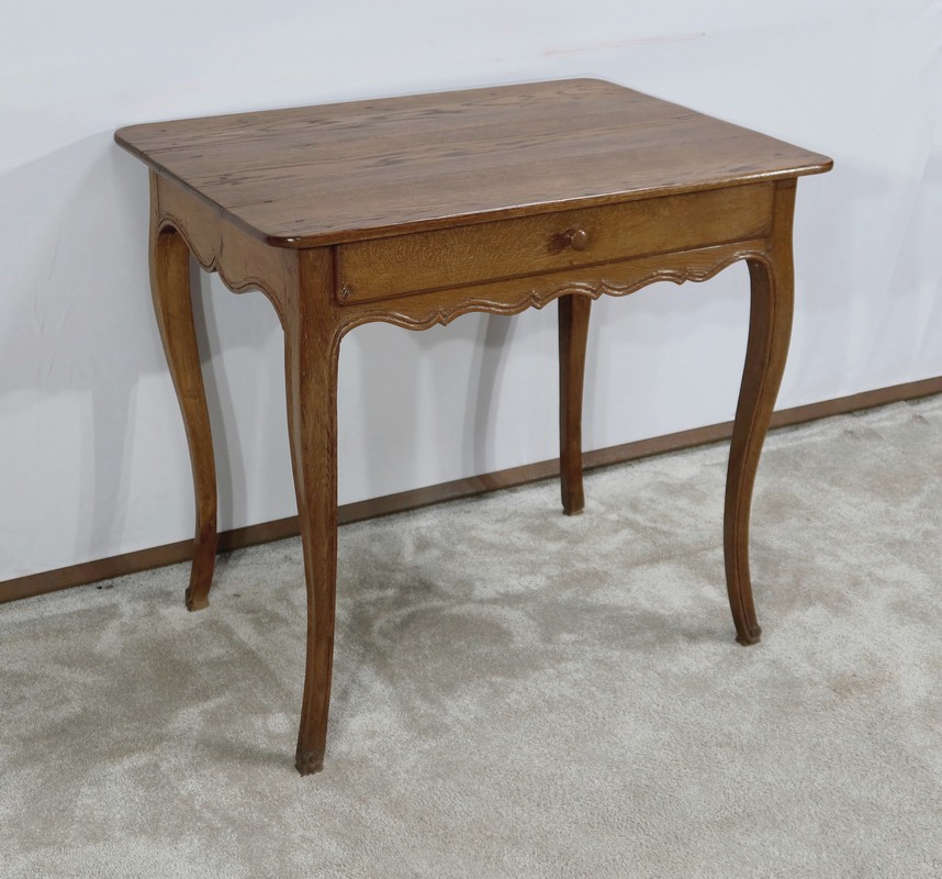 Charmante petite table mouvementée en chêne blond présentant en ceinture un long tiroir. Celui-ci est pourvu d’une façade au pourtour légèrement mouluré, en saillie de la ceinture. Il est également agrémenté d’un bouton de tirage adoucit, de forme lentille.
