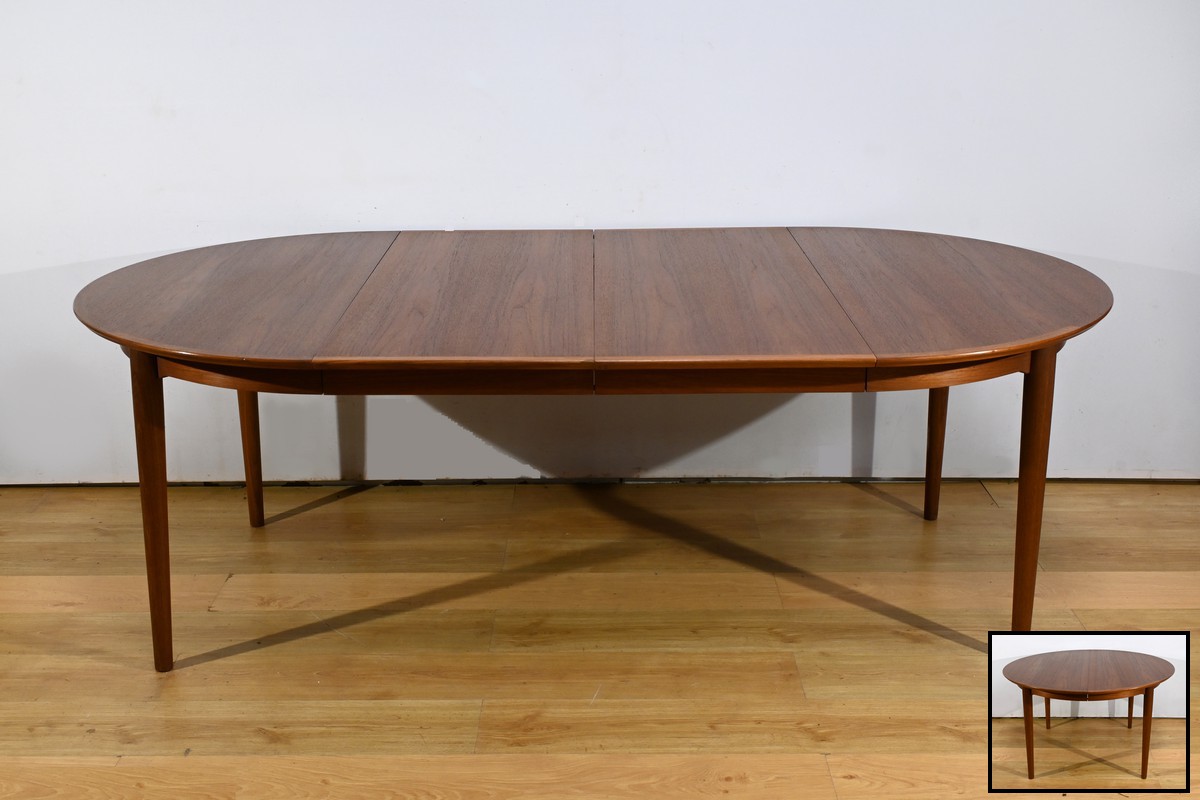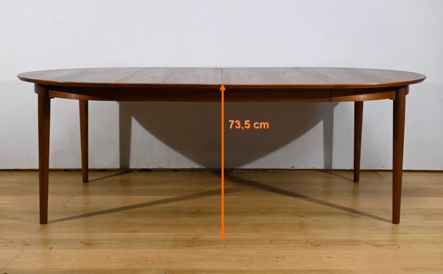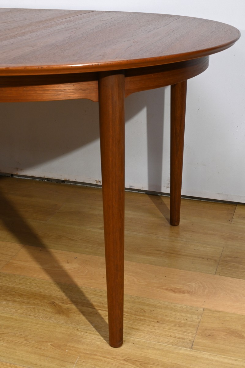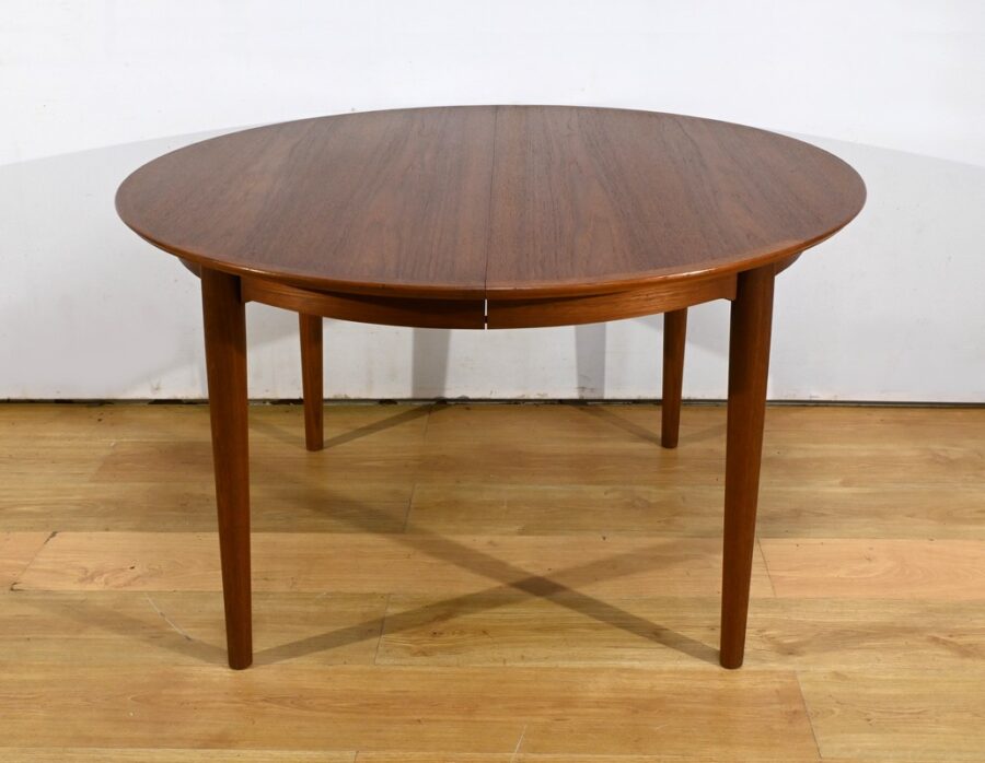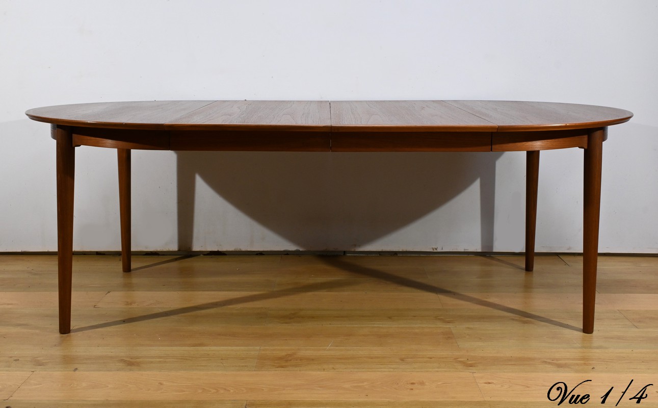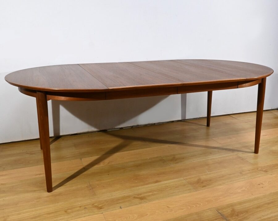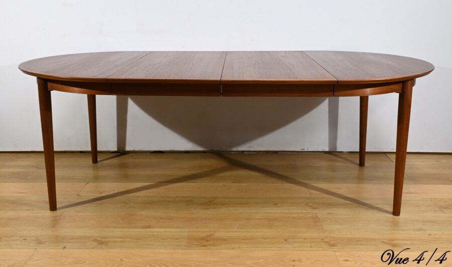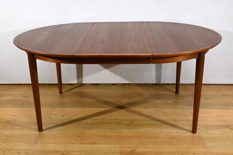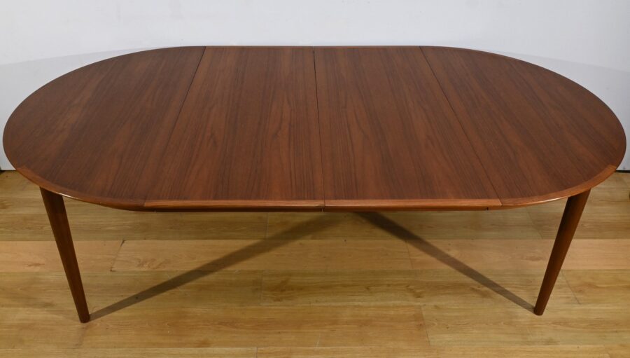 Cette table à manger scandinave en teck des années 1970 est un exemple parfait de design épuré et fonctionnel.