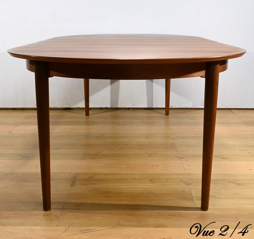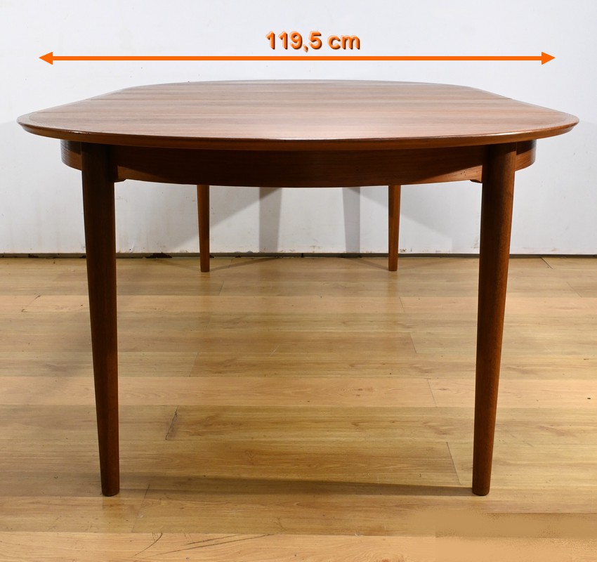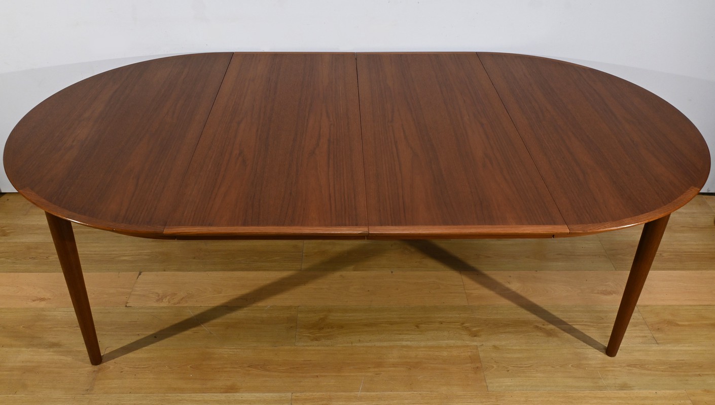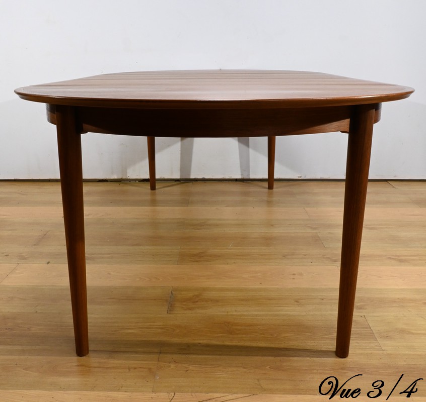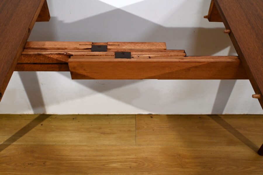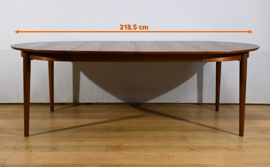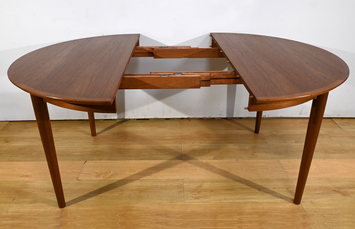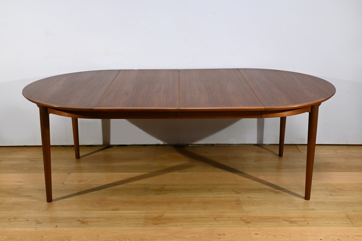 Cette table à manger scandinave en teck des années 1970 est un exemple parfait de design épuré et fonctionnel.