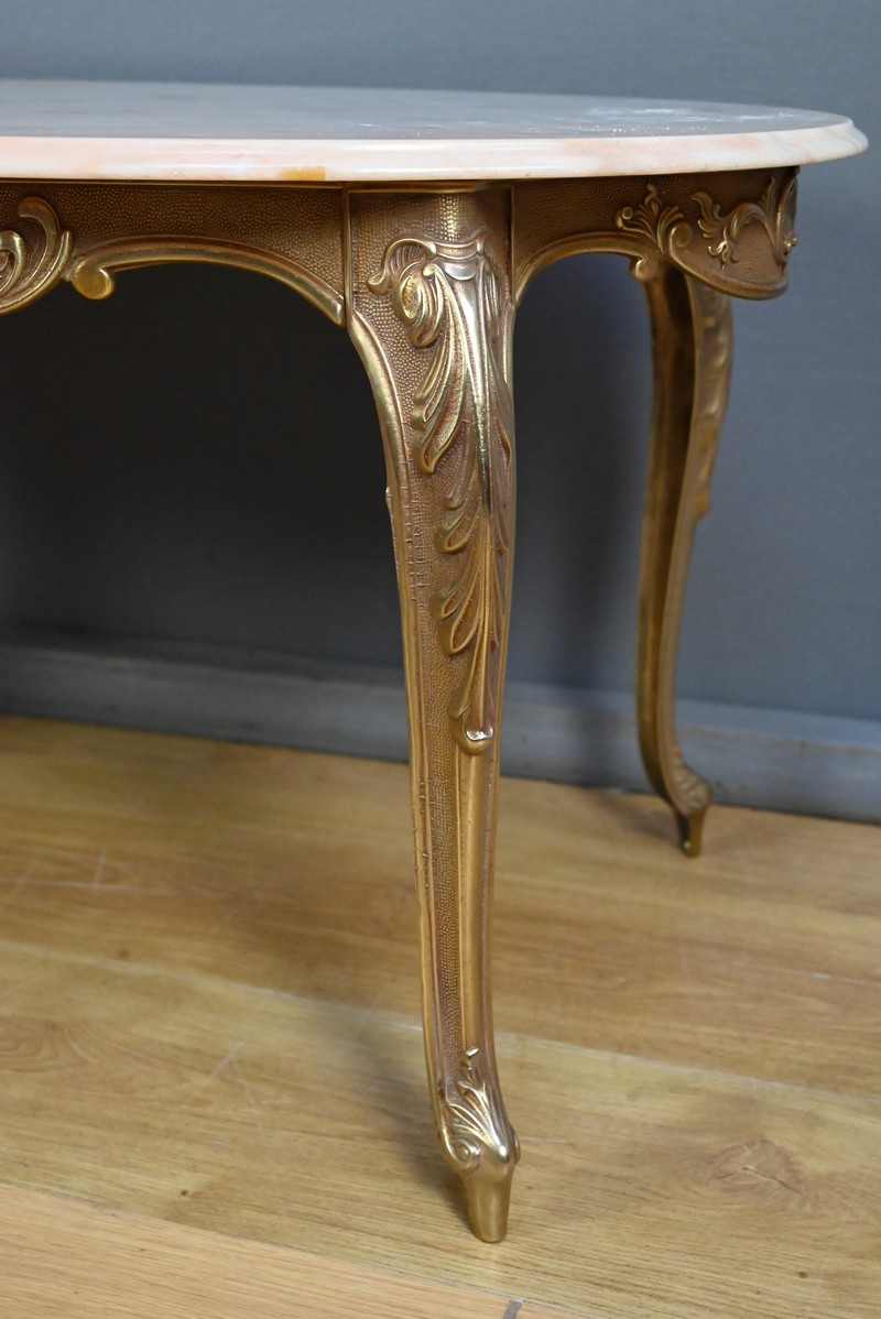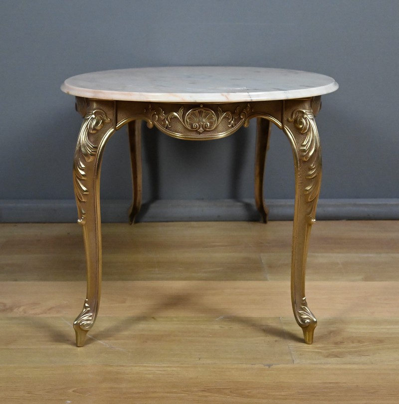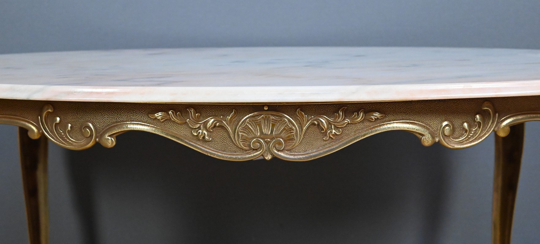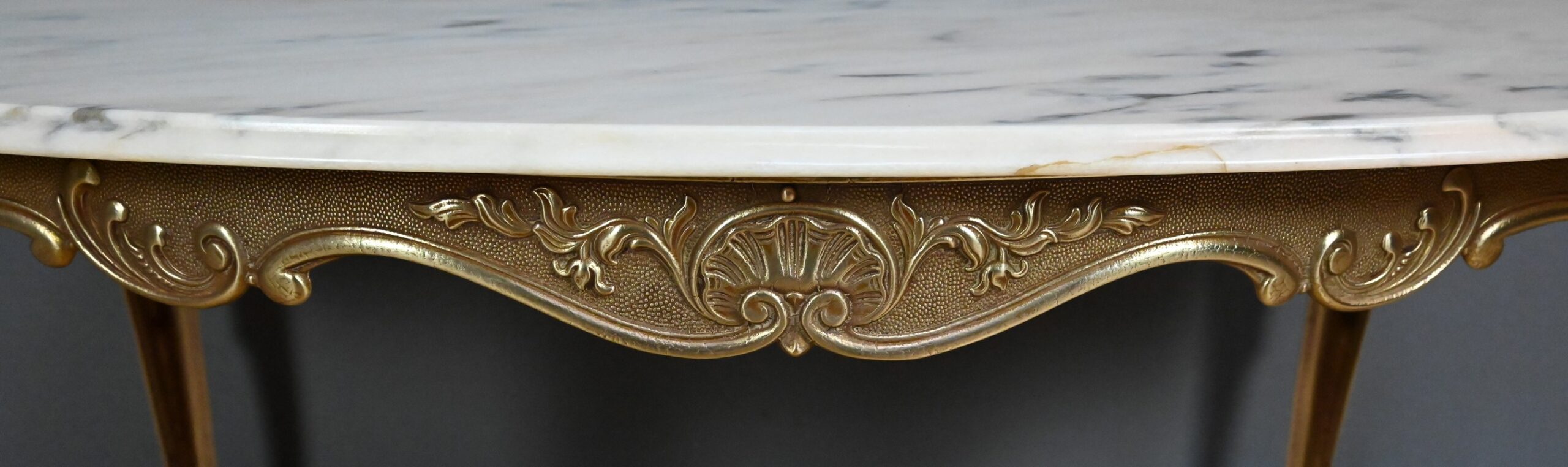 Cette table basse incarne le raffinement décoratif du style Louis XV, revisité avec une touche de charme vintage. Son plateau ovale en marbre lumineux, délicatement veiné, est ceinturé d’une gorge élégante qui souligne la noblesse du matériau. Il repose sur une structure en laiton finement ciselé, où rinceaux et volutes s’entrelacent avec grâce. La ceinture mouvementée, typique du style rocaille, est ponctuée de coquilles décoratives au centre de chaque face, apportant une touche théâtrale à l’ensemble. Les pieds galbés, ornés de grandes feuilles d’acanthe en chute, prolongent cette dynamique baroque avec une majesté assumée. Parfaite pour un intérieur sophistiqué, cette pièce conjugue le faste des arts décoratifs à la robustesse des matériaux. Elle séduira les amateurs de mobilier alliant caractère et élégance.