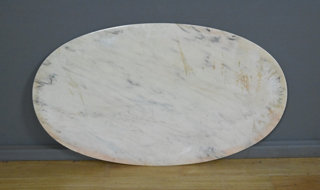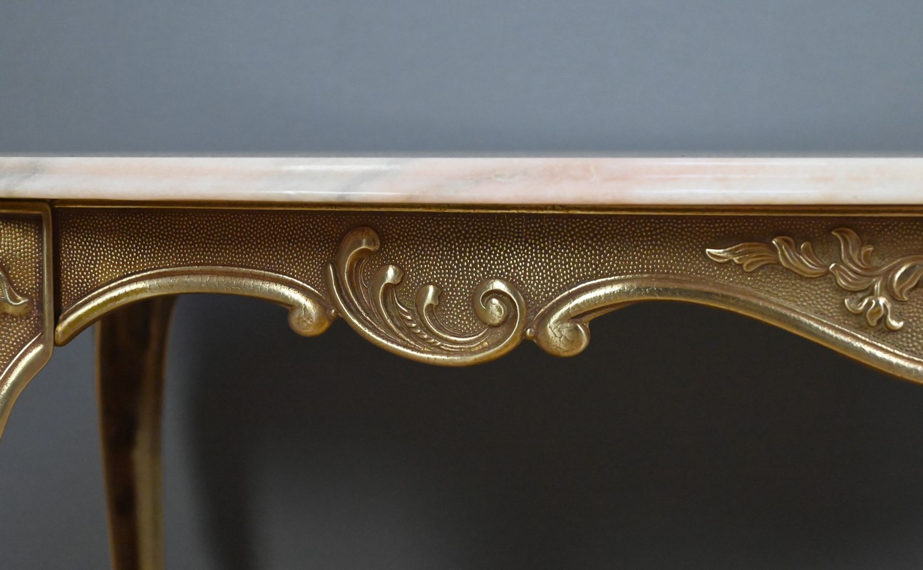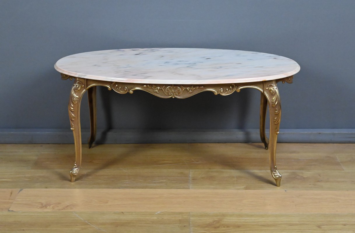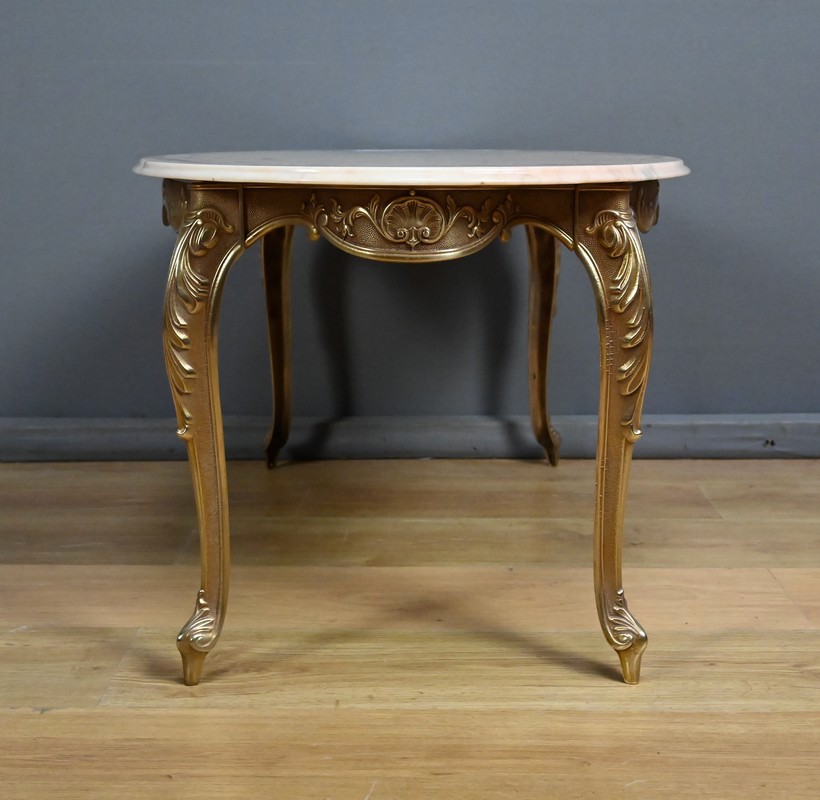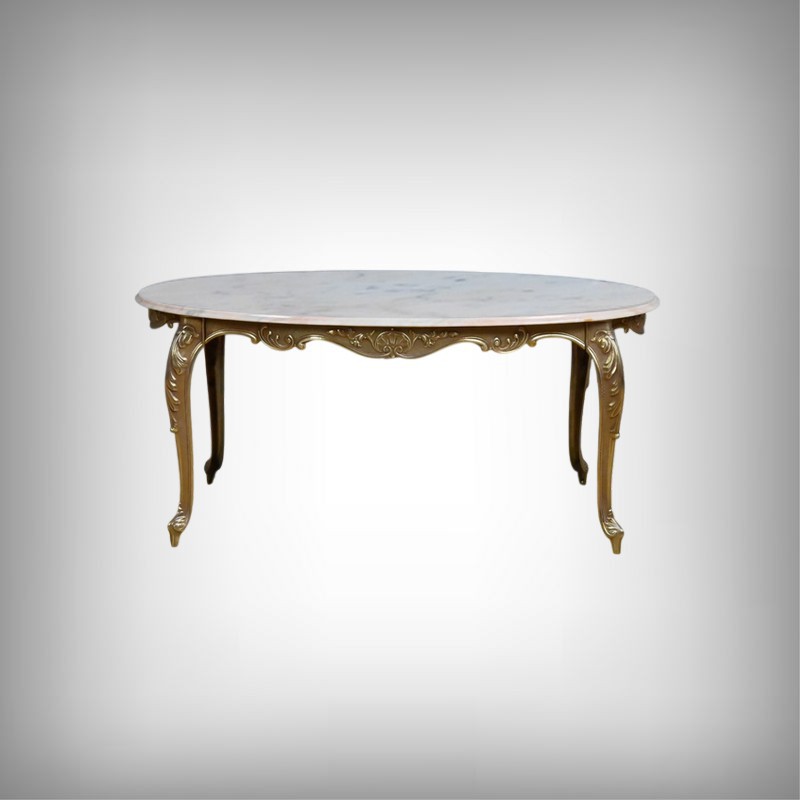 Cette table basse incarne le raffinement décoratif du style Louis XV, revisité avec une touche de charme vintage. Son plateau ovale en marbre lumineux, délicatement veiné, est ceinturé d’une gorge élégante qui souligne la noblesse du matériau. Il repose sur une structure en laiton finement ciselé, où rinceaux et volutes s’entrelacent avec grâce. La ceinture mouvementée, typique du style rocaille, est ponctuée de coquilles décoratives au centre de chaque face, apportant une touche théâtrale à l’ensemble. Les pieds galbés, ornés de grandes feuilles d’acanthe en chute, prolongent cette dynamique baroque avec une majesté assumée. Parfaite pour un intérieur sophistiqué, cette pièce conjugue le faste des arts décoratifs à la robustesse des matériaux. Elle séduira les amateurs de mobilier alliant caractère et élégance.