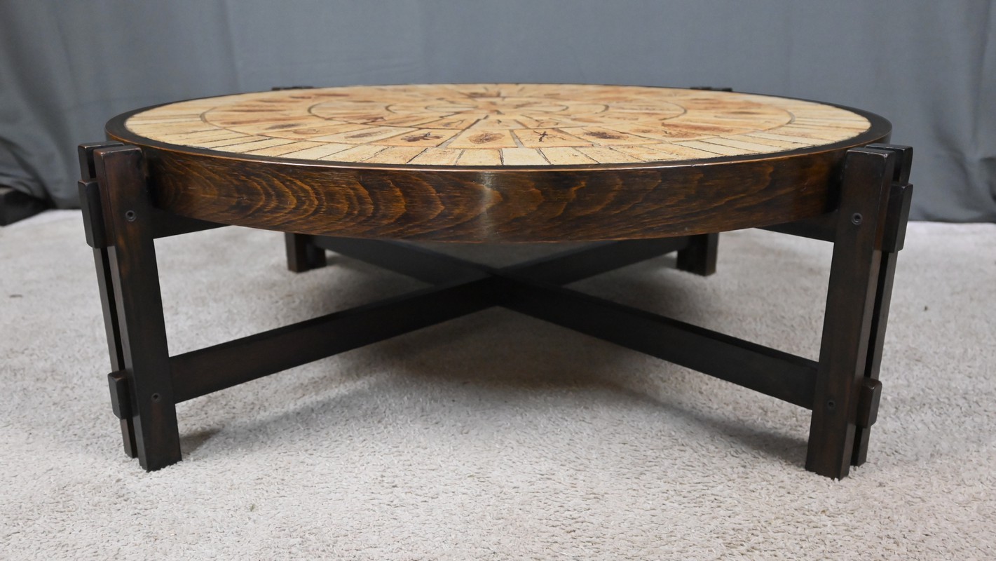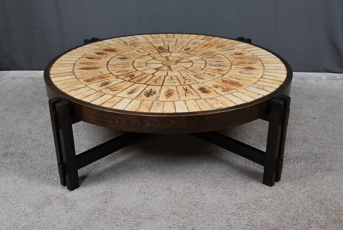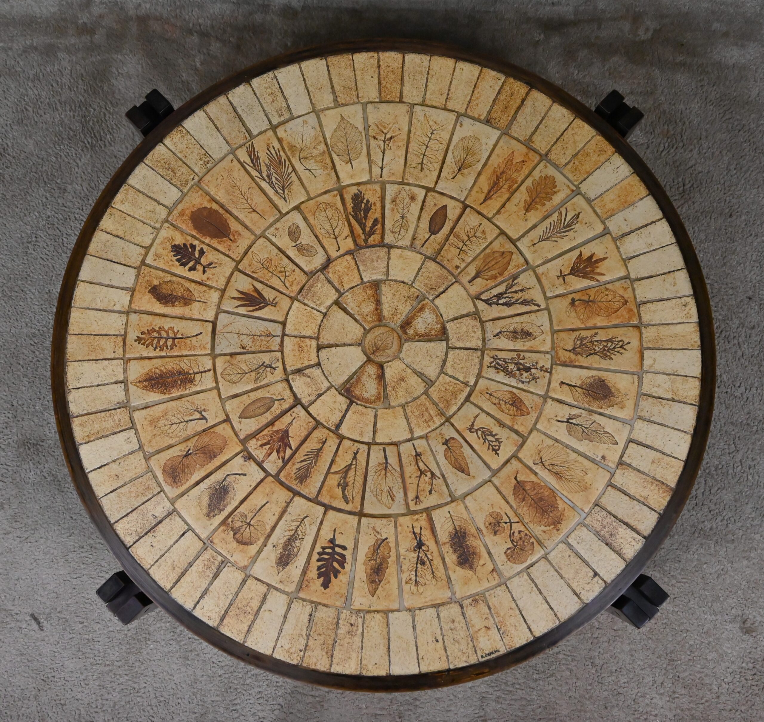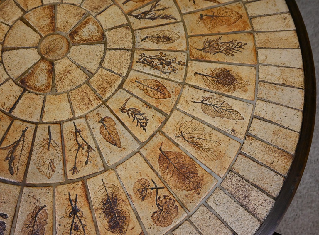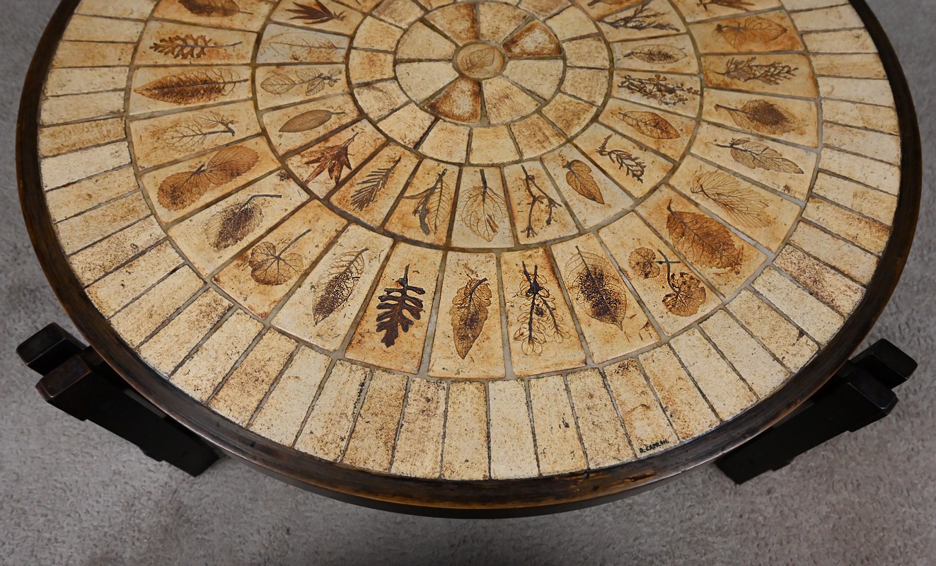 Superbe table ronde de Roger Capron, emblématique céramiste de Vallauris, qui s’est entouré des meilleurs artisans pour donner vie à sa célèbre collection « Les Herbiers ». Cette pièce vintage incarne l’alliance parfaite entre savoir-faire artistique et hommage à la nature méditerranéenne.