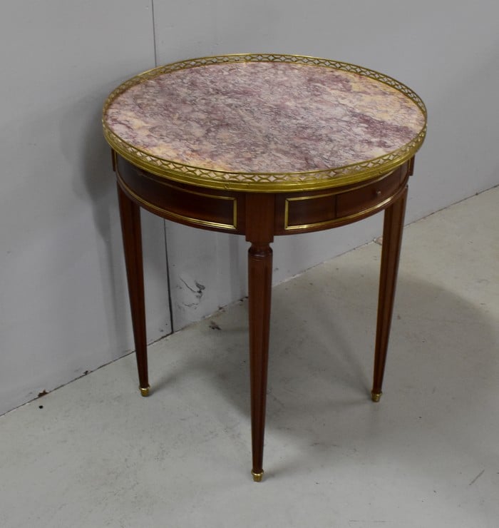 Son plateau Rond est en Marbre Griotte Rose de Lourdes, entouré d’une galerie Ajourée en Laiton.