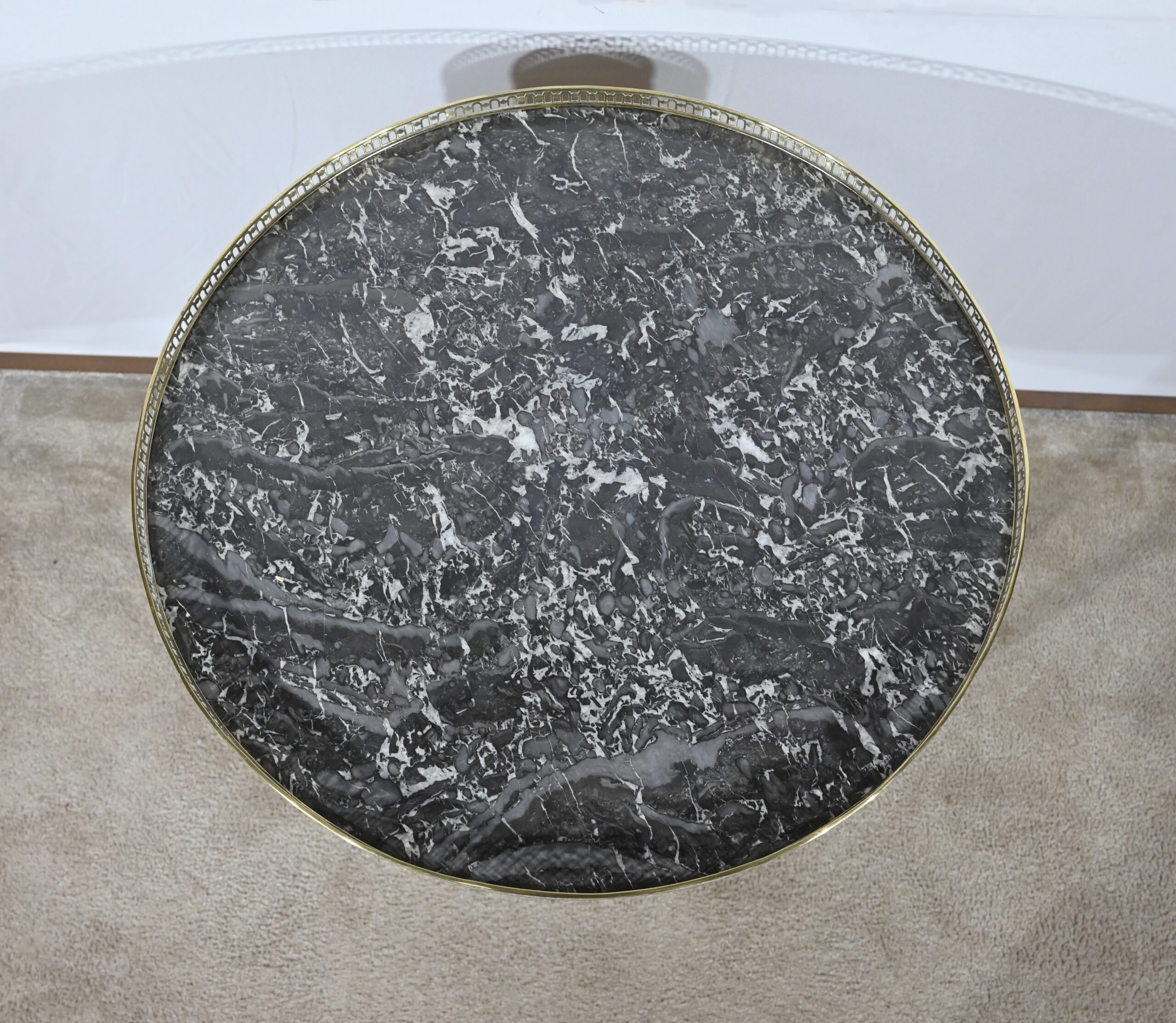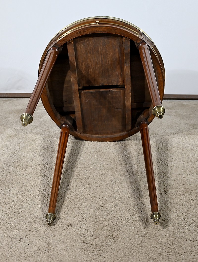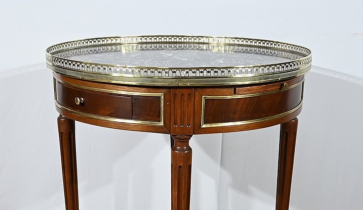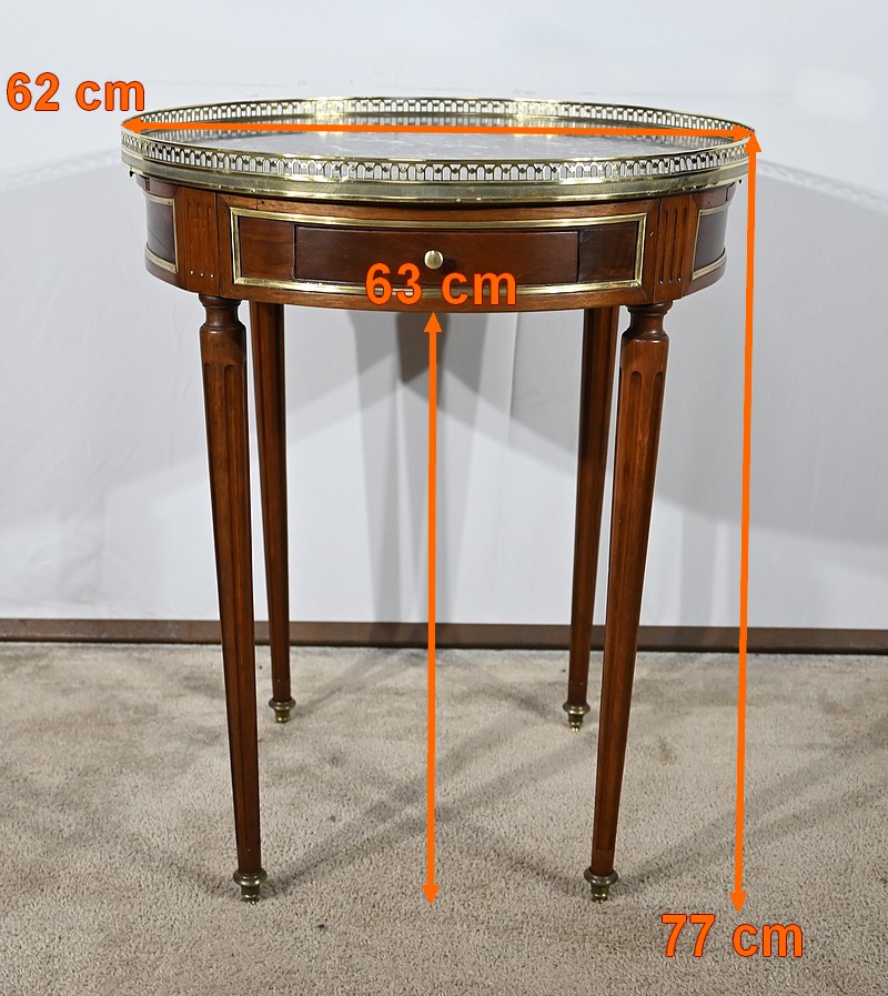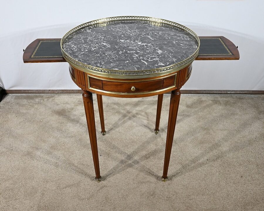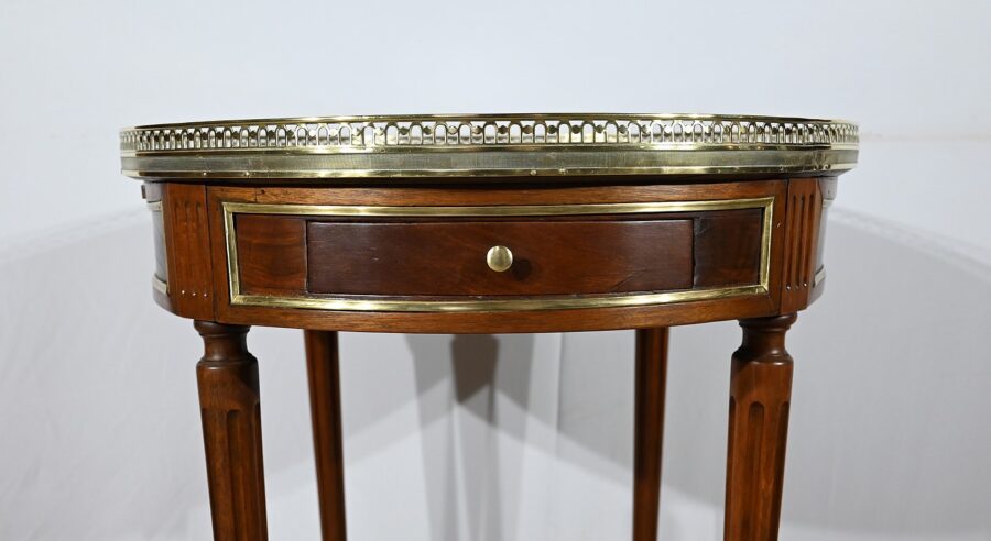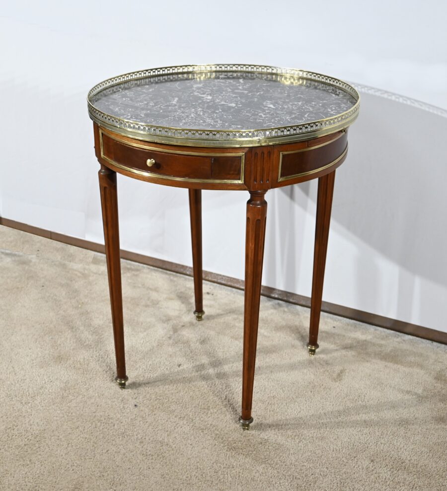 Cette table bouillotte Louis XVI est sommée d’un beau marbre circulaire gris Sainte Anne Belge. Celui-ci est entouré d’une galerie en laiton ciselée en partie basse et ajourée en partie haute .