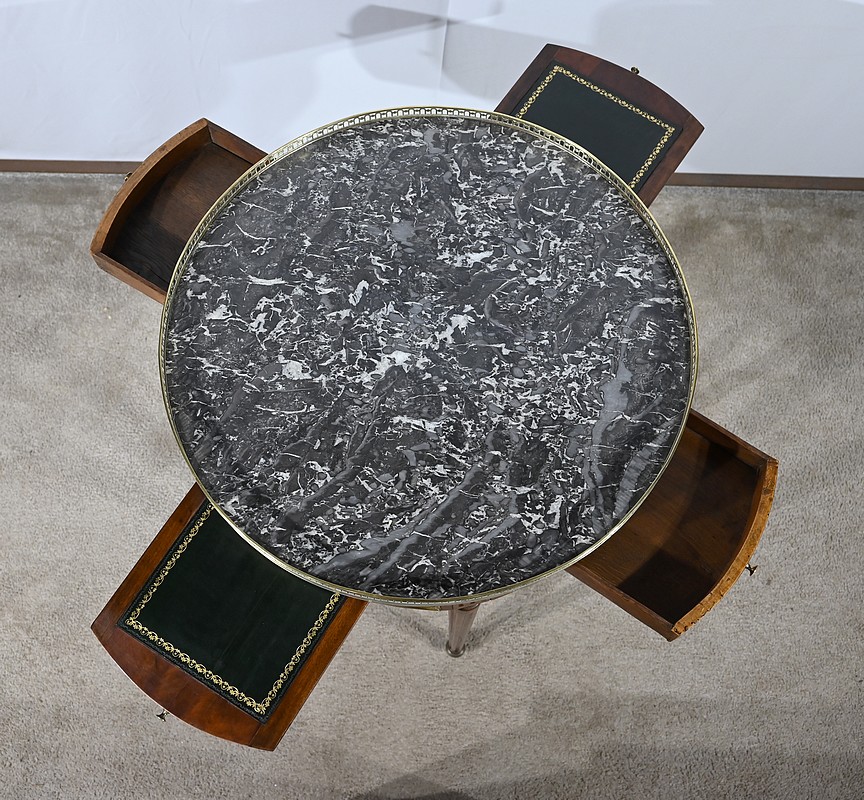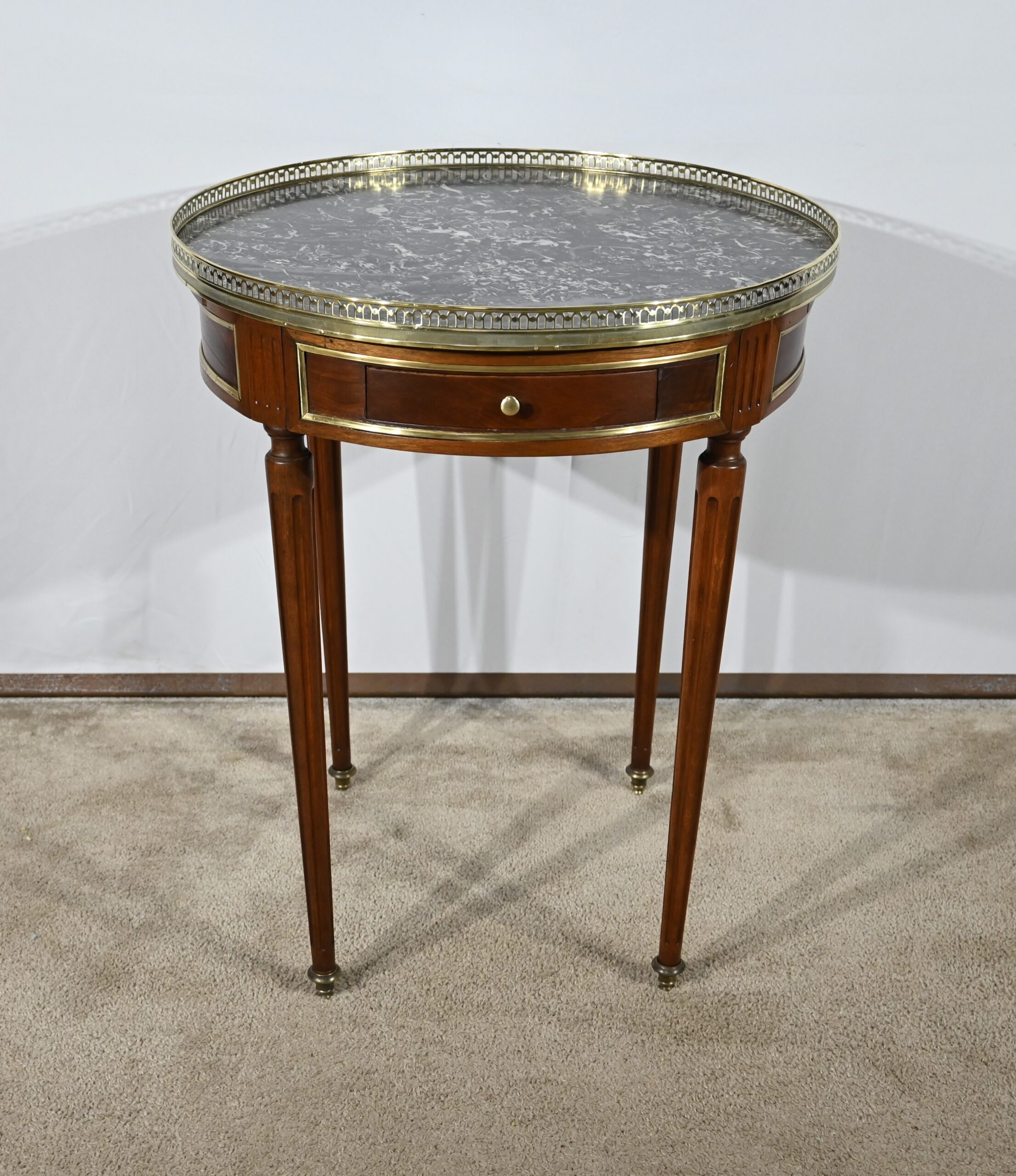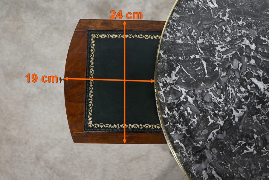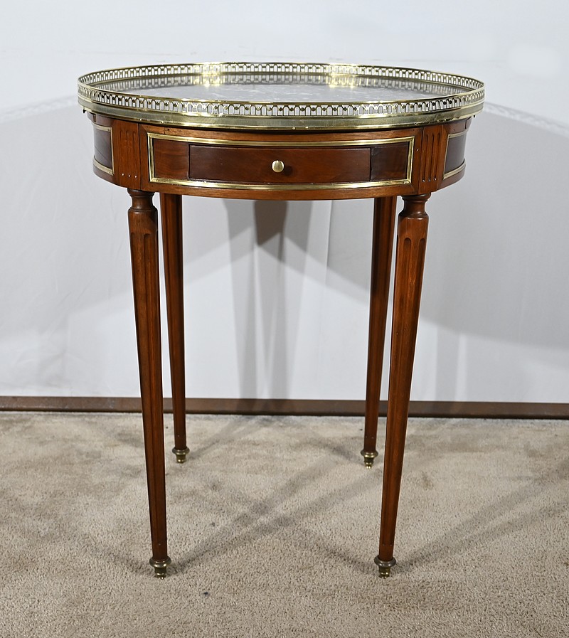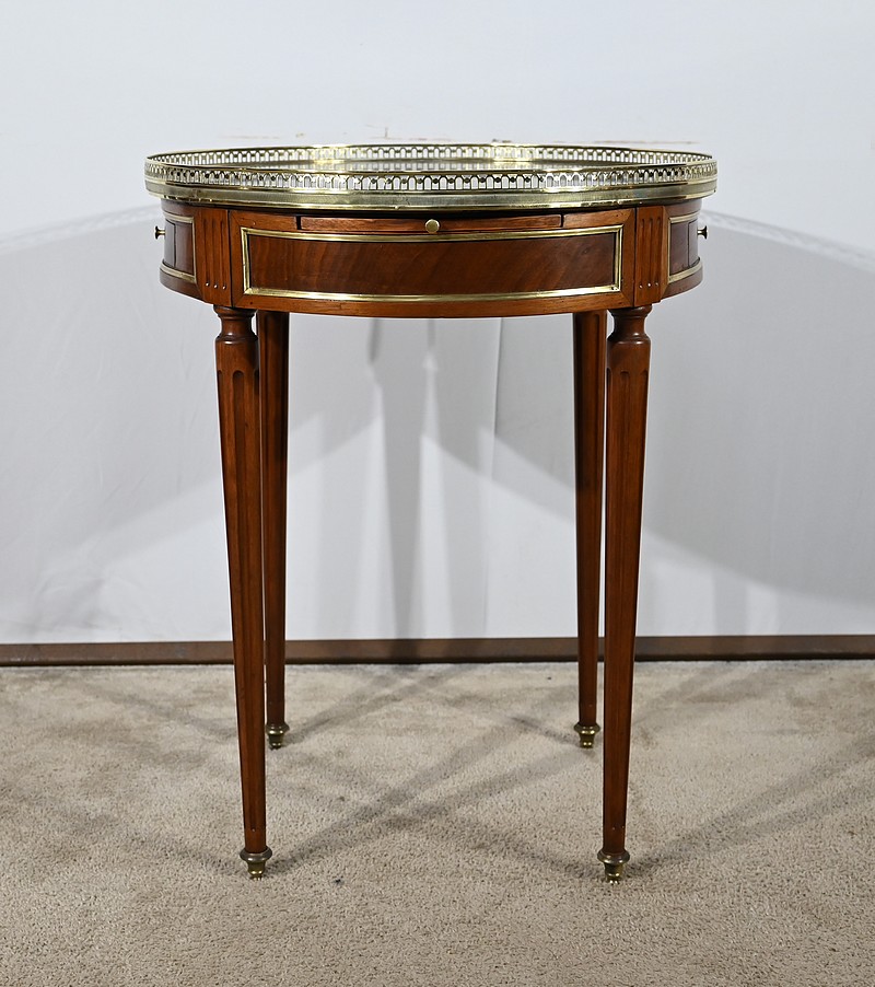 Cette table bouillotte Louis XVI est sommée d’un beau marbre circulaire gris Sainte Anne Belge. Celui-ci est entouré d’une galerie en laiton ciselée en partie basse et ajourée en partie haute .