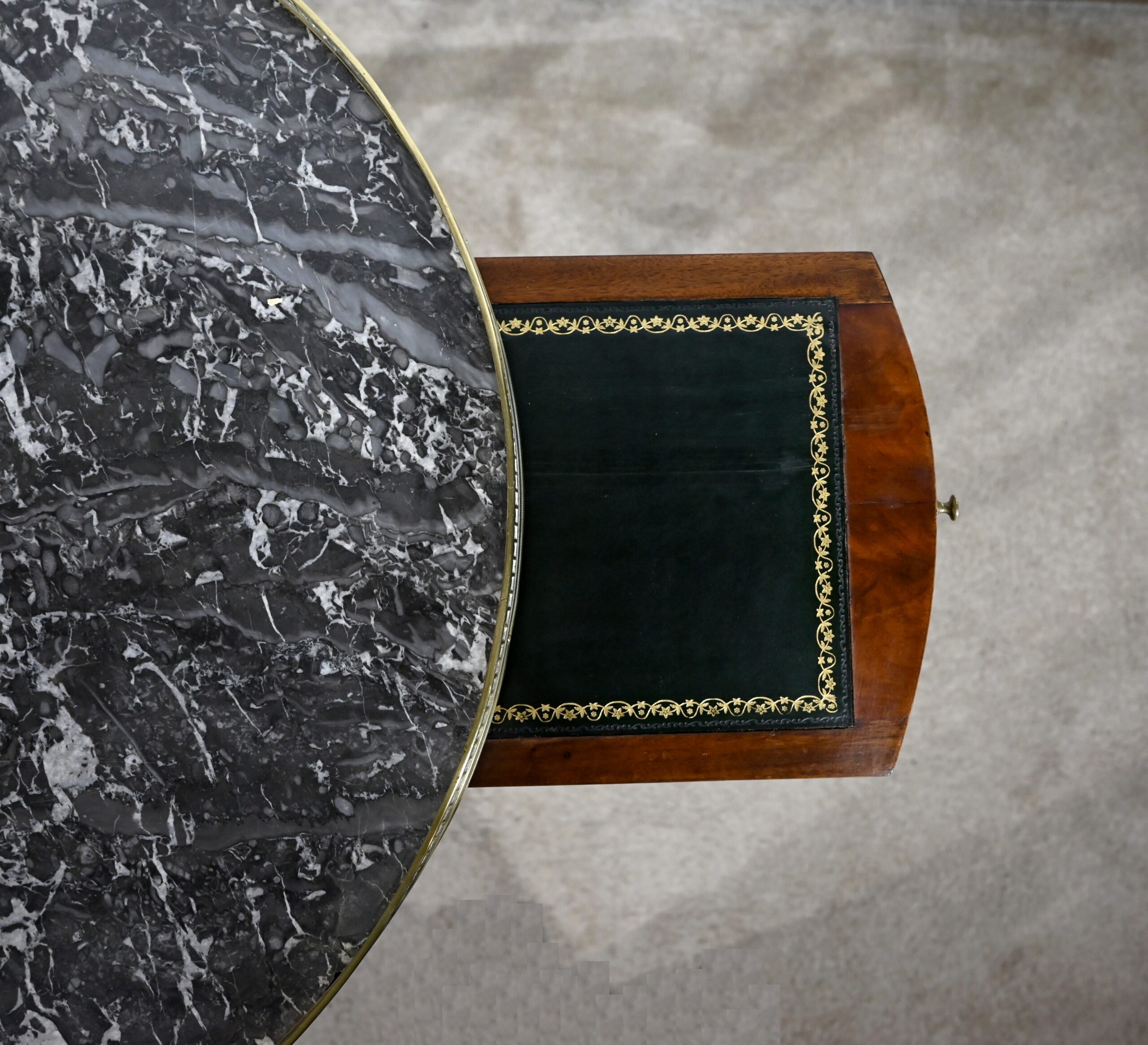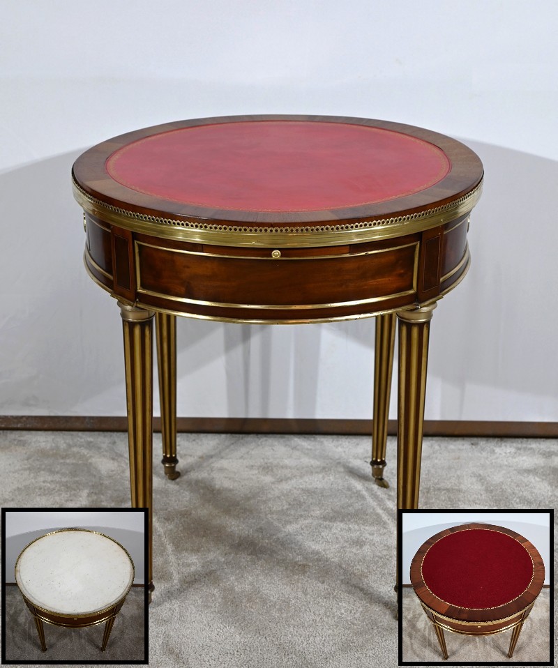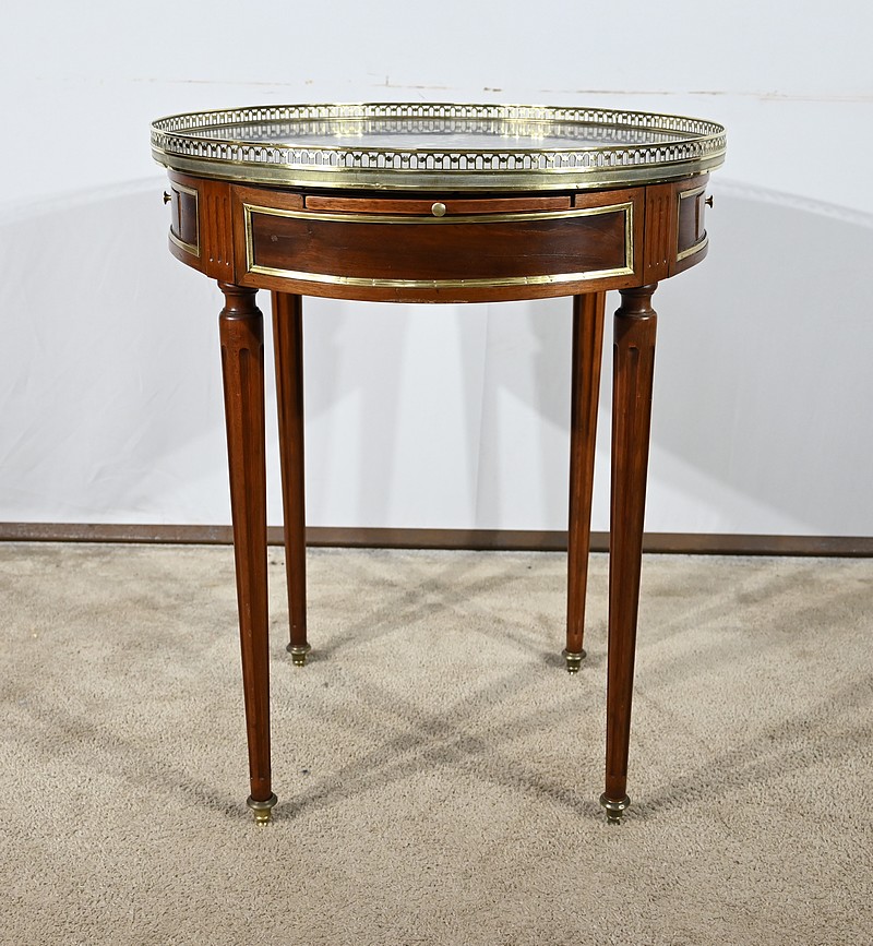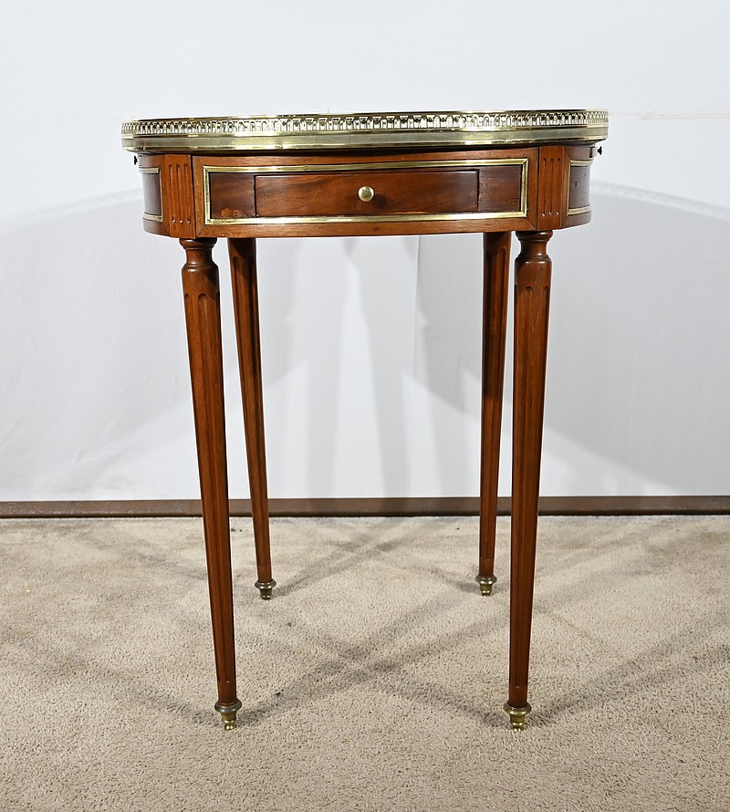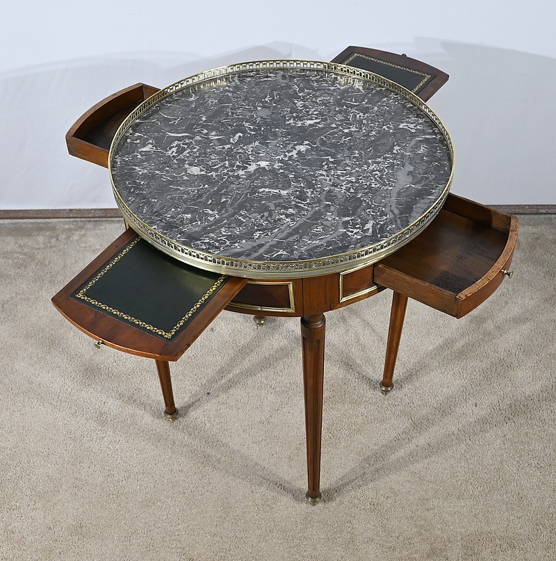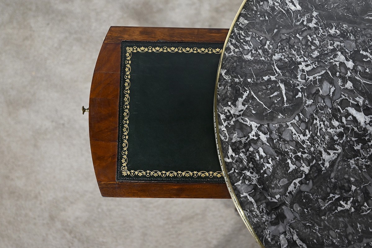 Cette table bouillotte Louis XVI est sommée d’un beau marbre circulaire gris Sainte Anne Belge. Celui-ci est entouré d’une galerie en laiton ciselée en partie basse et ajourée en partie haute .