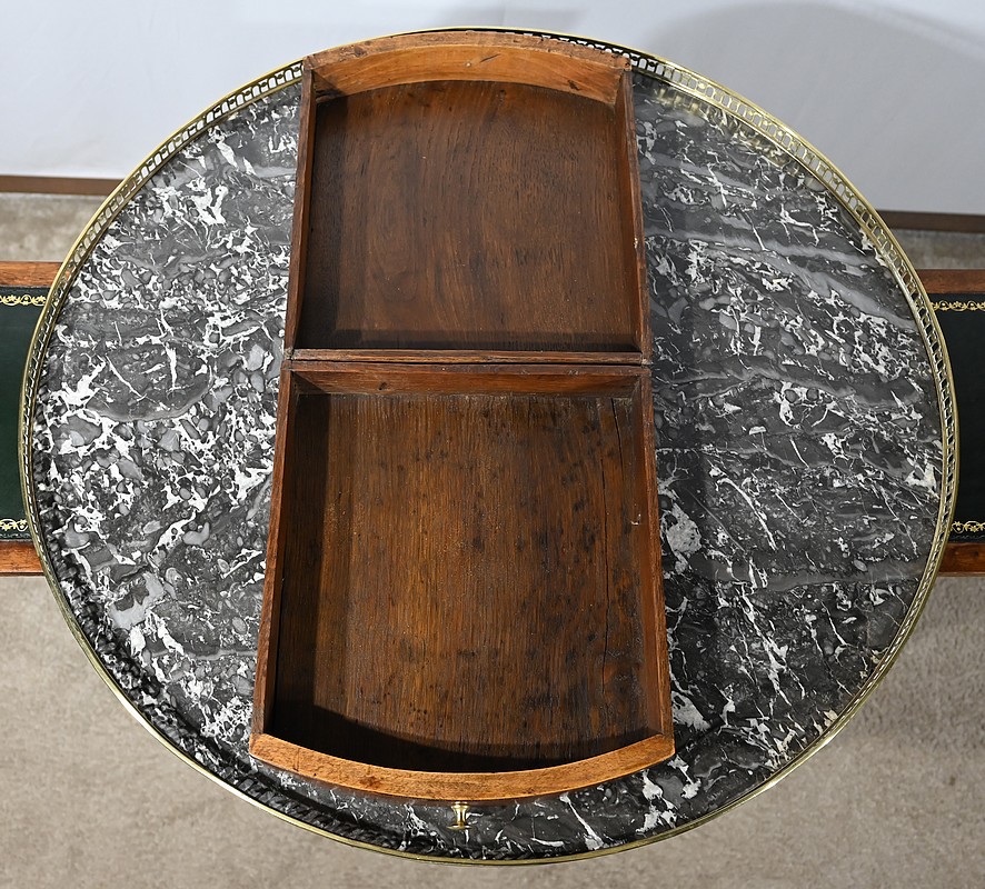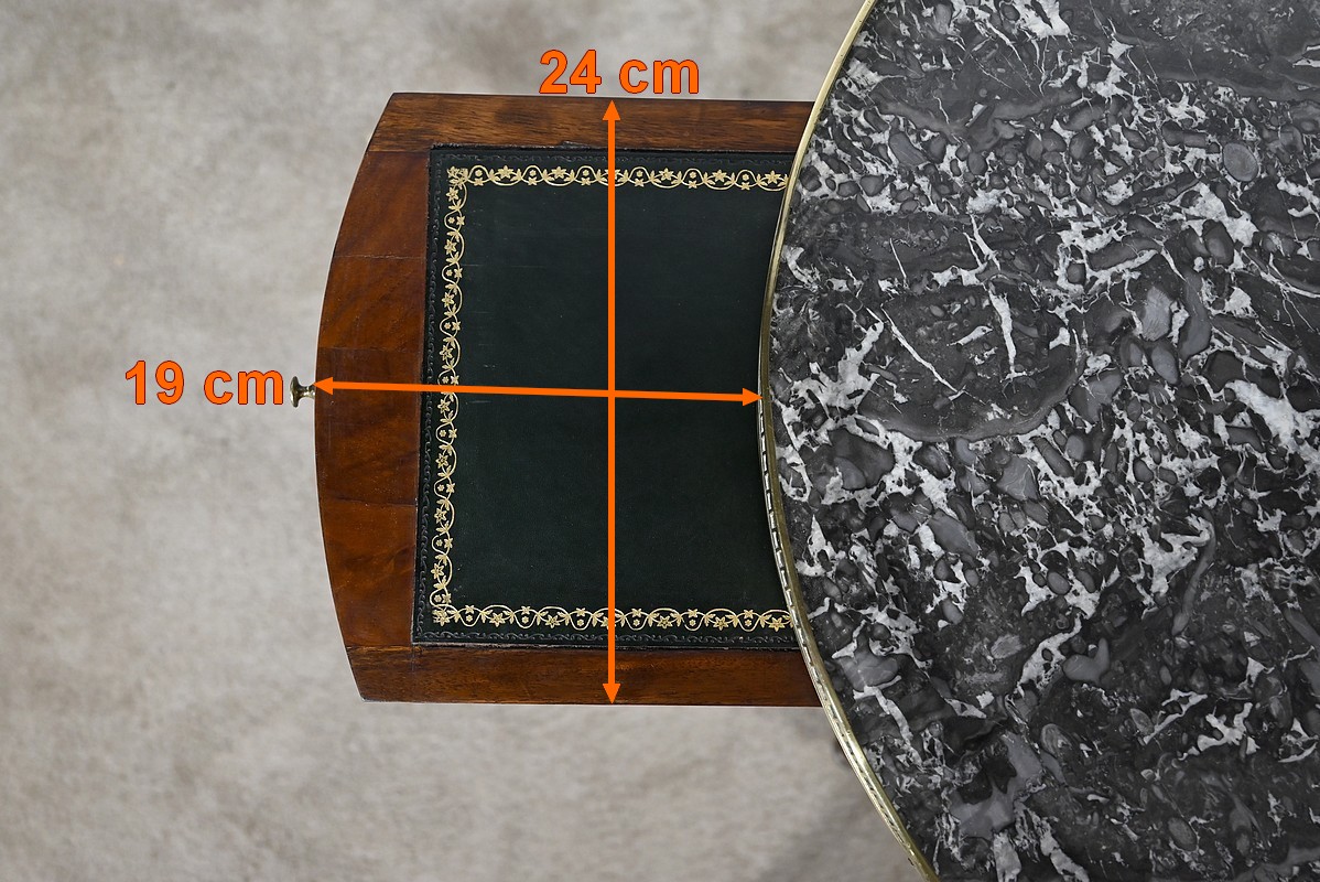 Cette table en acajou massif et placage d’acajou possède une ceinture à défoncement avec dans son pourtour une baguette à doucine en laiton. De part et d’autre, nous retrouvons un tiroir muni d’un bouton lentille en bronze. Les côtés et fonds de tiroirs sont en chêne. Sur les côtés, cette table est dotée de tablettes entourées d’un cadre en acajou. Elles sont foncées d’un cuir vert neuf avec vignette à froid et vignette dorée.