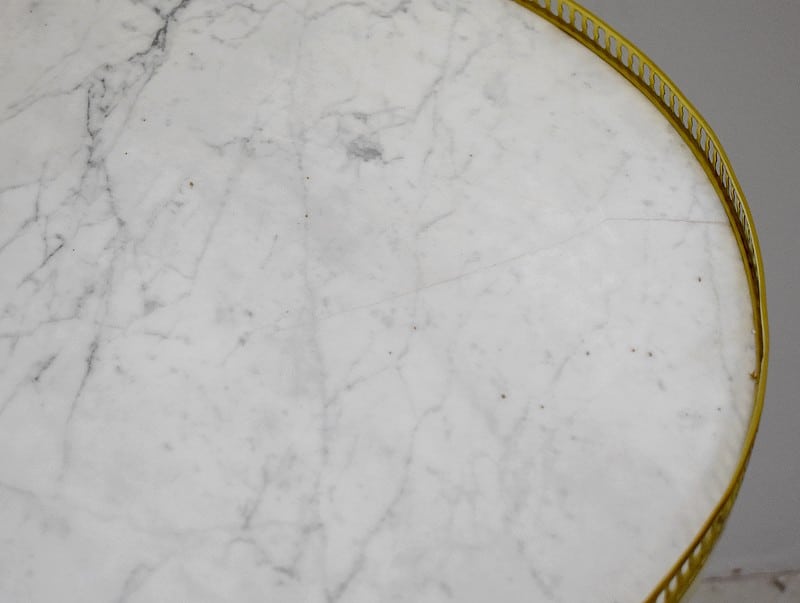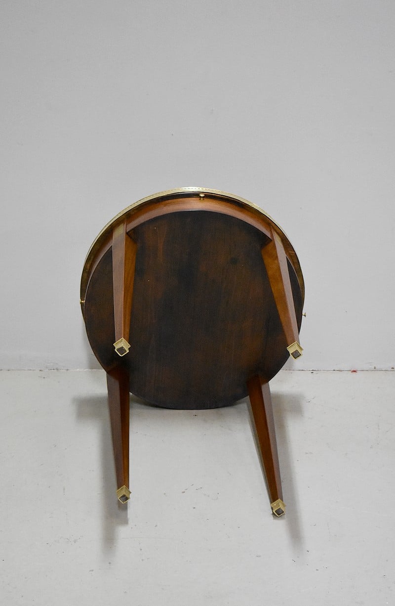 Table bouillotte ronde de style Louis XVI en Acajou massif et placage d’Acajou à dessus en marbre blanc de Carrare (on y voit une légère fissure) cerclé d’une galerie en laiton ajourée.