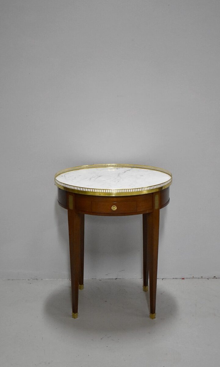 Table bouillotte ronde de style Louis XVI en Acajou massif et placage d’Acajou à dessus en marbre blanc de Carrare (on y voit une légère fissure) cerclé d’une galerie en laiton ajourée.