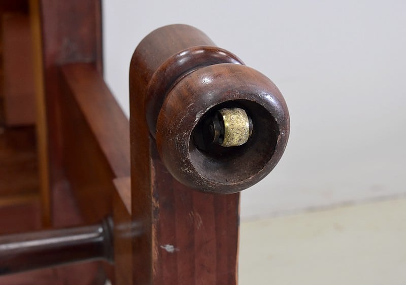 Elle repose sur 2 montants entretoisés d’une barre à chat en bois tourné, sculpté et mouluré et reposant eux-même sur 4 pieds boules moulurés dans lesquels sont logées des roulettes.