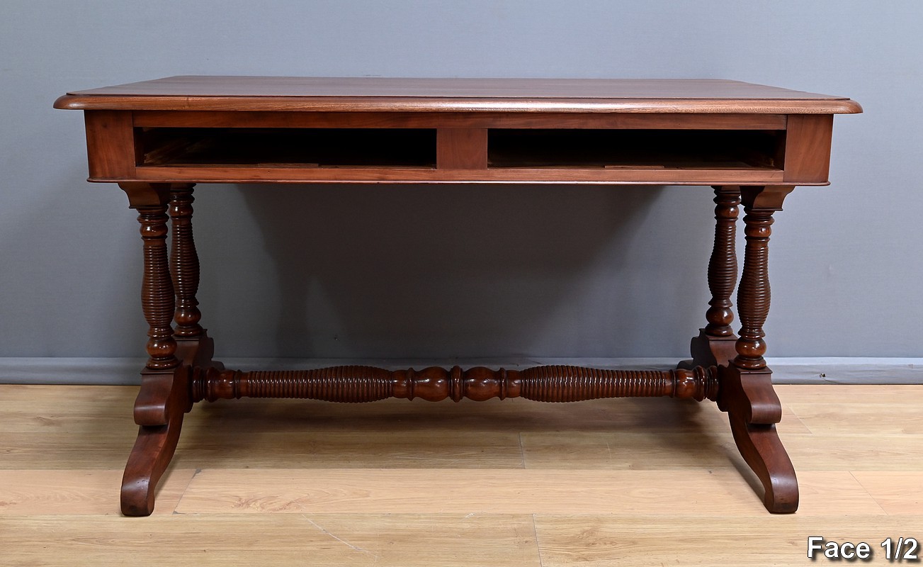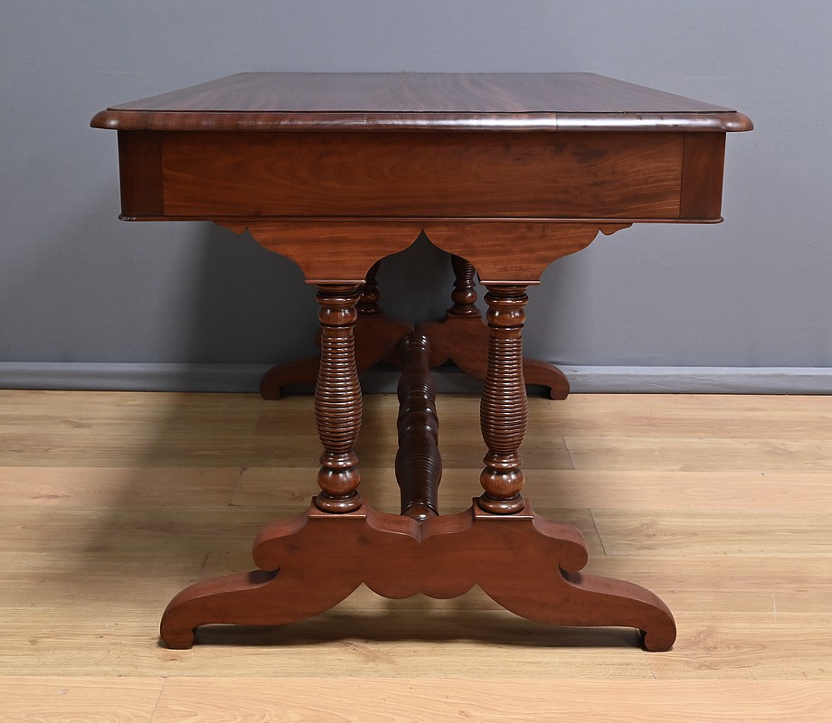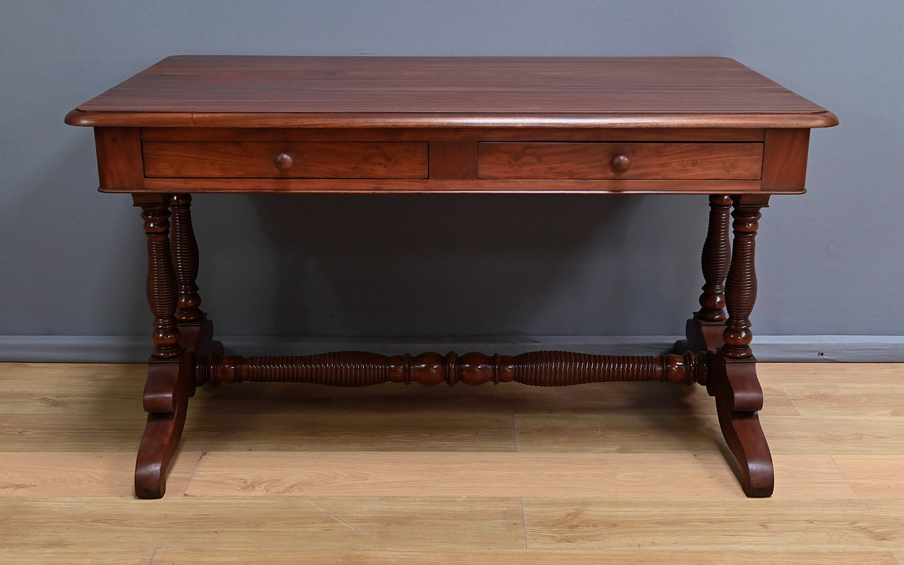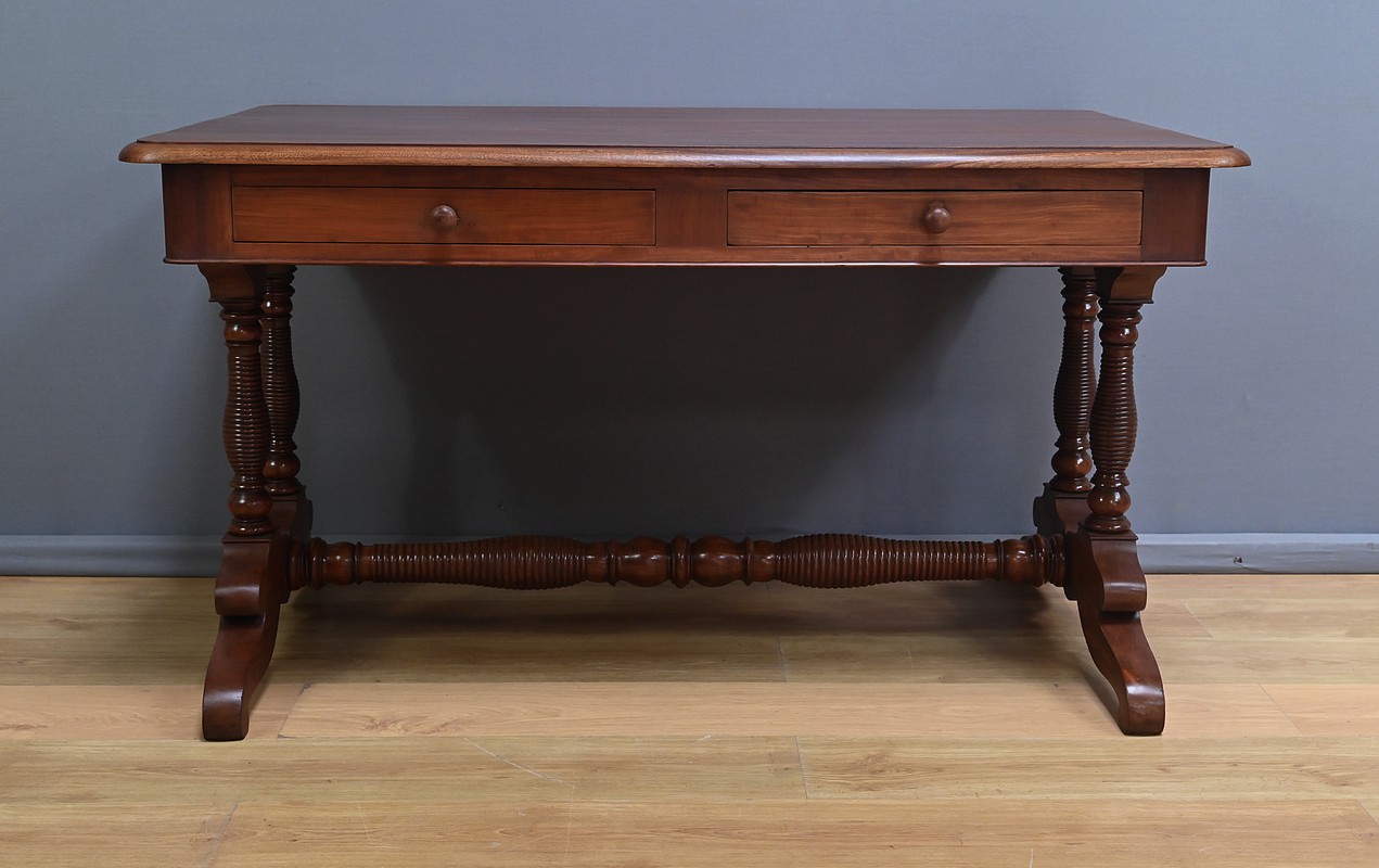Conçu dans la première moitié du XIXe siècle, ce bureau de milieu en acajou de style Louis-Philippe se caractérise par ses quatre tiroirs en ceinture présents sur ses deux faces. Il offre ainsi une grande polyvalence, permettant une utilisation de ses deux côtés. Le piétement, renforcé par une entretoise, assure une parfaite stabilité à ce bureau au design sobre mais distingué. Les pieds tournés, délicatement sculptés, sont portés par des bases en acajou massif mouvementé. Ils illustrent le souci du détail et le savoir-faire des ébénistes de cette époque. Caractérisé par sa sobriété élégante et une conception pensée pour durer, ce bureau traverse les époques sans perdre son charme authentique.