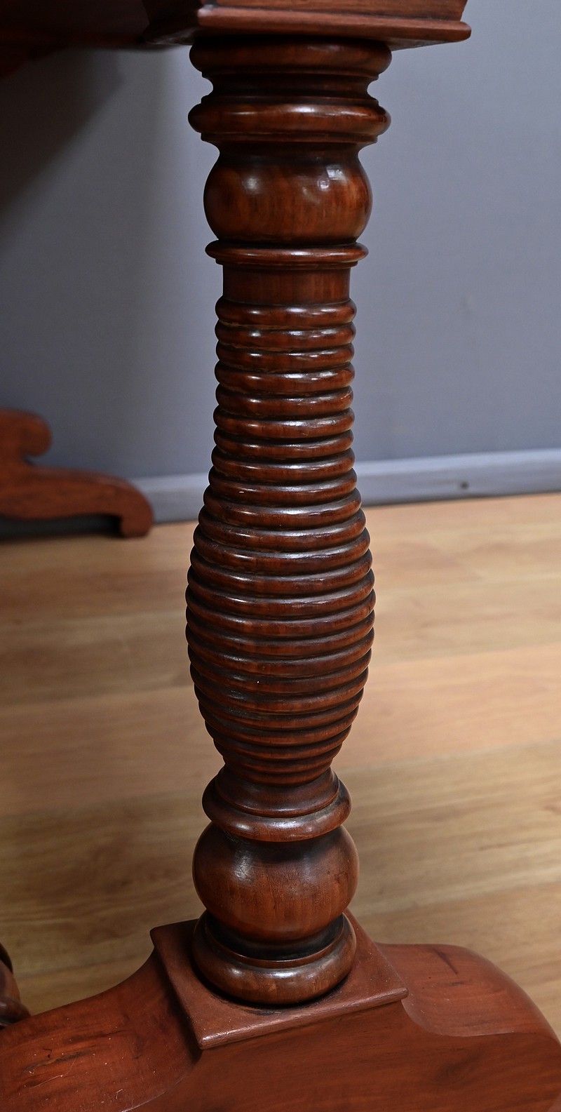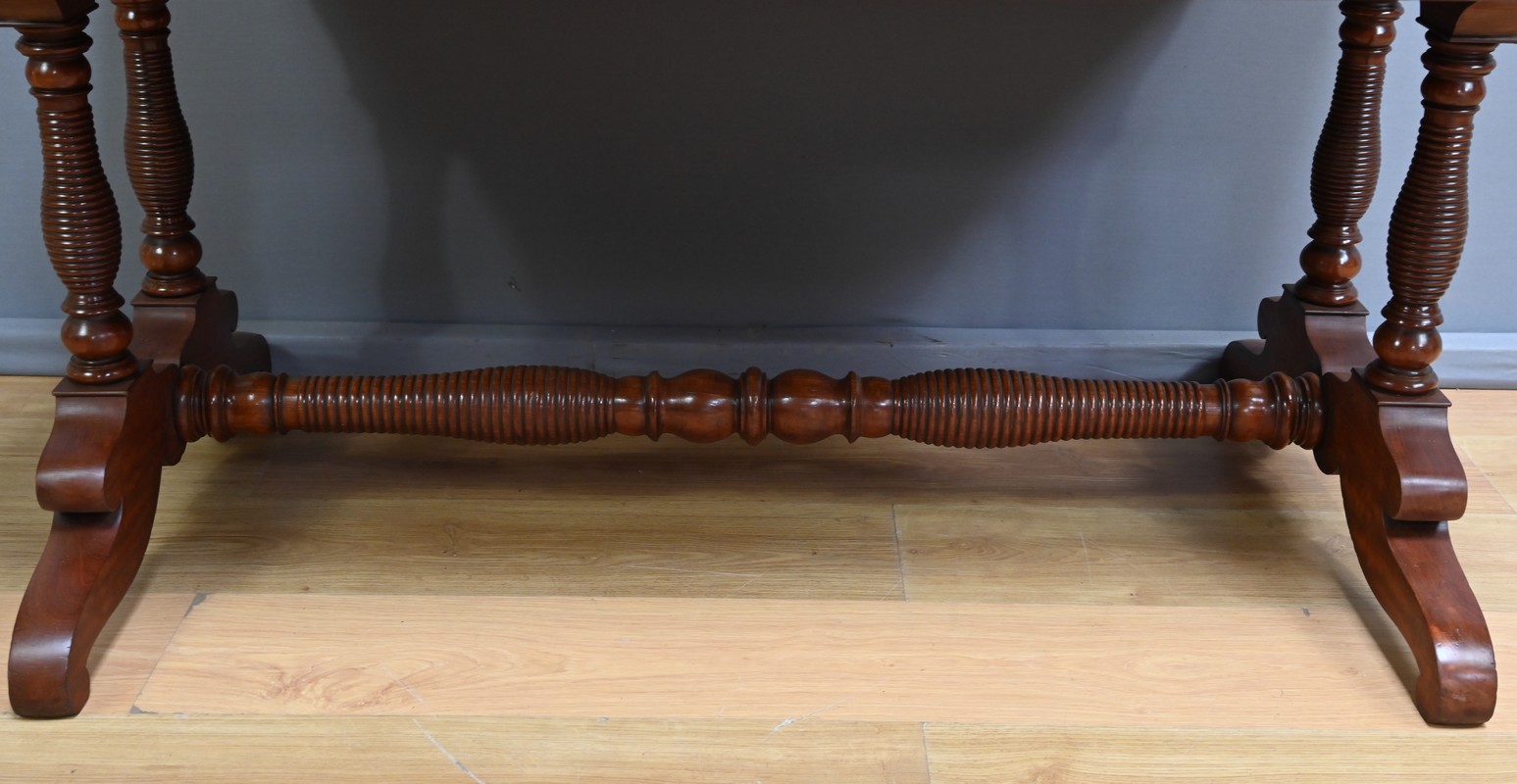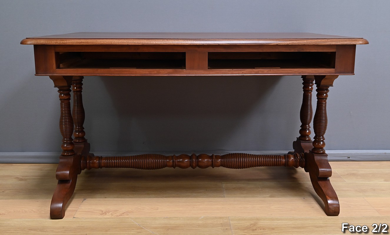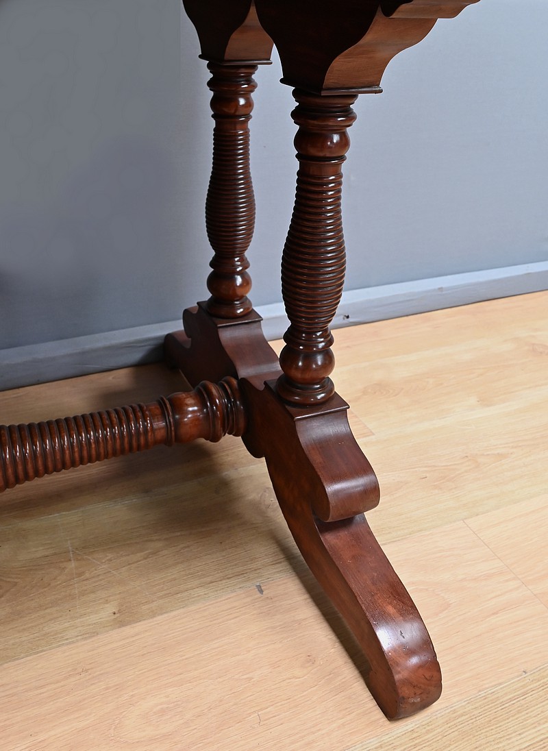 Conçu dans la première moitié du XIXe siècle, ce bureau de milieu en acajou de style Louis-Philippe se caractérise par ses quatre tiroirs en ceinture présents sur ses deux faces. Il offre ainsi une grande polyvalence, permettant une utilisation de ses deux côtés. Le piétement, renforcé par une entretoise, assure une parfaite stabilité à ce bureau au design sobre mais distingué. Les pieds tournés, délicatement sculptés, sont portés par des bases en acajou massif mouvementé. Ils illustrent le souci du détail et le savoir-faire des ébénistes de cette époque. Caractérisé par sa sobriété élégante et une conception pensée pour durer, ce bureau traverse les époques sans perdre son charme authentique.