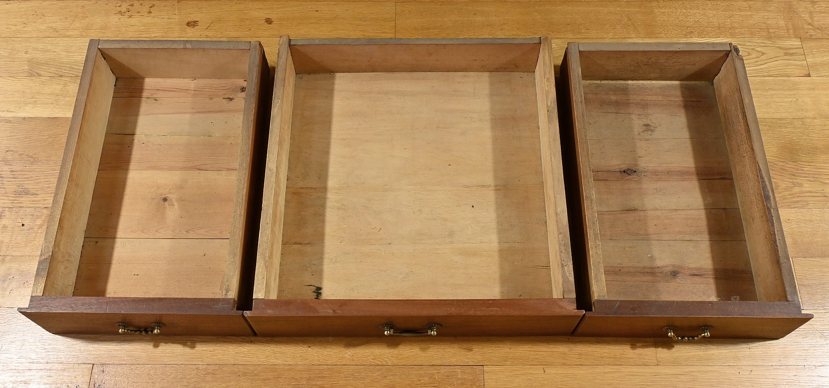 Bureau en Acajou massif muni de trois tiroirs en ceinture de taille différente, se tirant à l’aide de poignées tombantes en bronze. Ces dernières sont accompagnées de rosaces ciselées. Le dessus de ce bureau est constitué d’une seule planche d’acajou au veines nuancées. Cette table repose sur 4 pieds tournés à la forme élégante. La couleur riche et chaleureuse du bois d’acajou confère à la table un charme unique et en fait une pièce maîtresse idéale pour un bureau ou une pièce de travail. Cette table bureau est non seulement fonctionnelle, offrant un espace de travail confortable, mais aussi une pièce décorative qui rehaussera l’esthétique de tout intérieur.