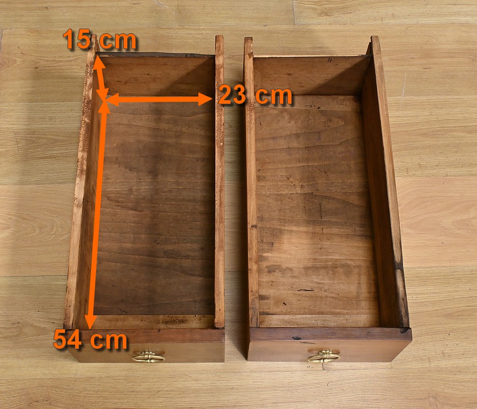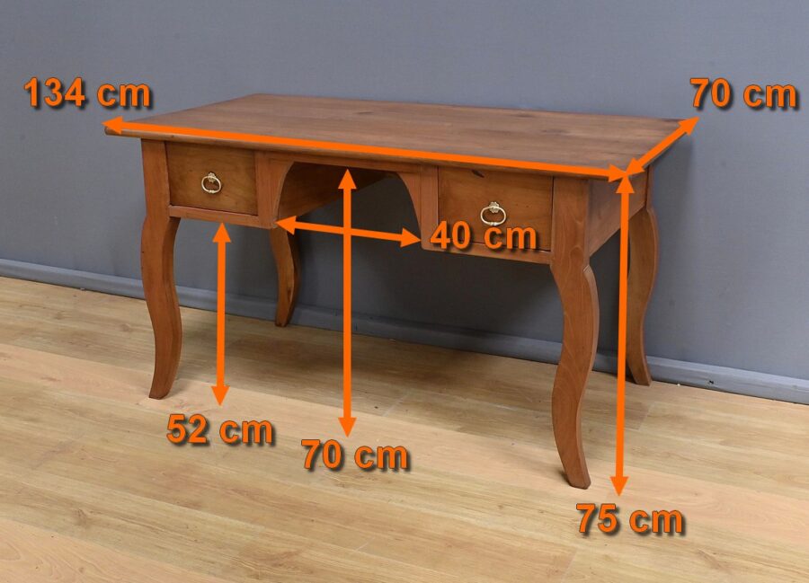 Cette table bureau en merisier massif datant de la seconde moitié du XIXe siècle, présente un plateau rectangulaire constitué de larges planches bien jointives. Ce mobilier possède deux tiroirs profonds, ornés de poignées en laiton en forme d’anneaux. Les pieds galbés, typiques du style Louis XV, ajoutent une touche de raffinement. Le bois de merisier, avec sa finition cirée et sa teinte chaleureuse, met en valeur la richesse de sa texture naturelle. Un meuble intemporel qui allie fonctionnalité et esthétique.