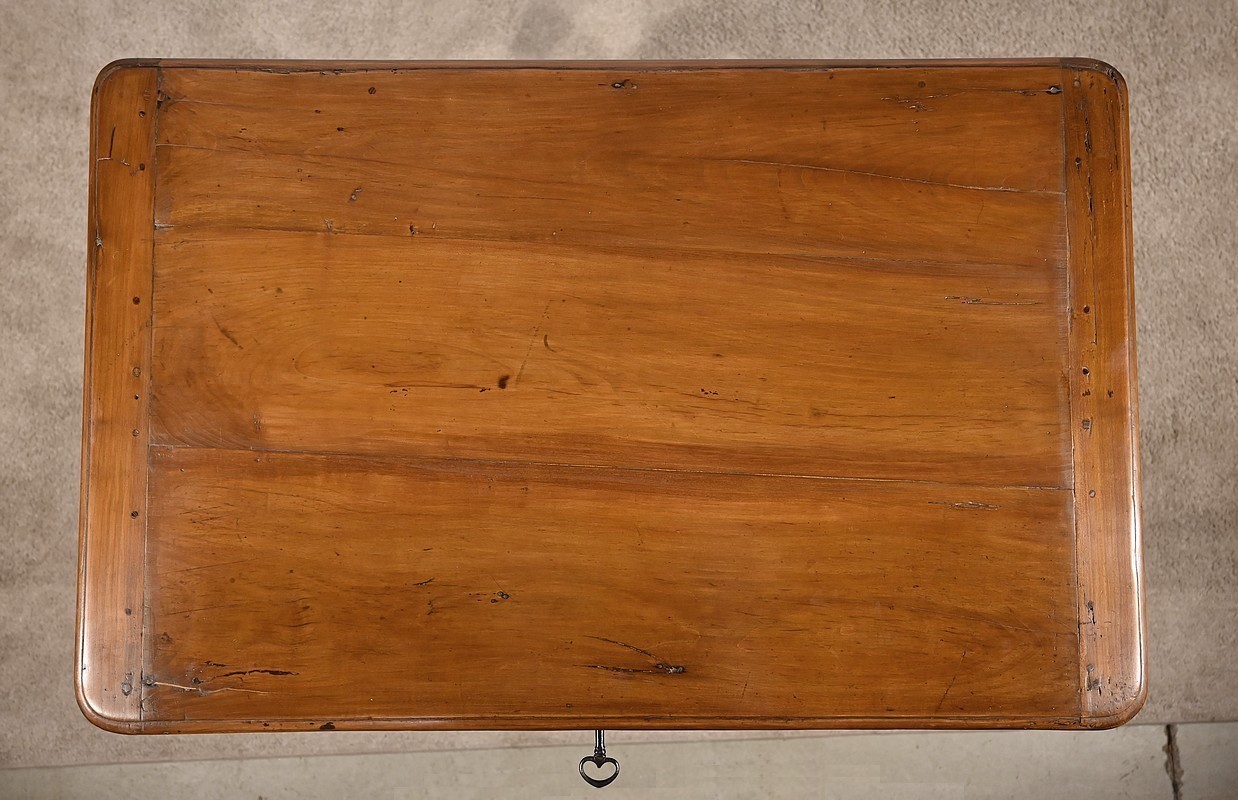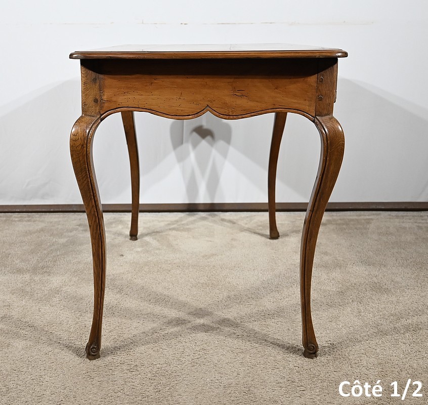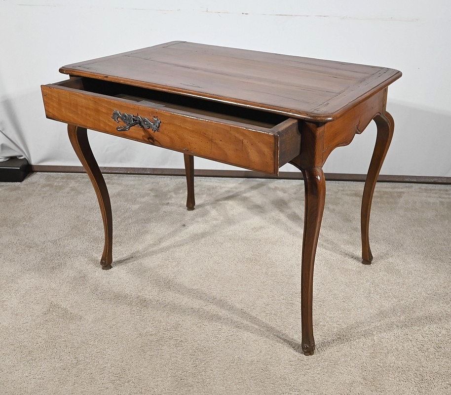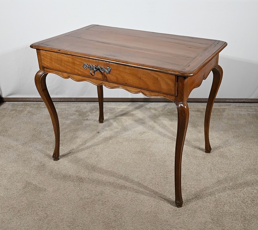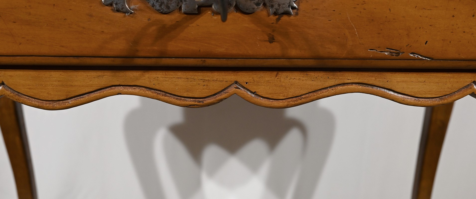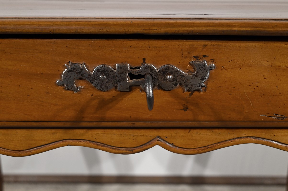 Table Cabaret Louis XV en merisier et pieds en chêne, ouvrant en ceinture par un tiroir en applique, mouluré sur les côtés et le dessous. La serrure et la clé sont d’origine et en état de fonctionnement. L’entrée est en fer, posée à l’horizontal . La ceinture sous le tiroir est découpée avec une légère moulure en dessous qui se profile avec des pieds cambrés dits à bosse. Ils sont moulurés et se terminent par des volutes en partie basse. Ce meuble est muni de côtés à découpe en forme de cœur avec des moulures également. Le dessus de cette table cabaret est composé de trois planches bien jointives et une partie « embout » aux extrémités, permet d’éviter la déformation des trois planches. Le pourtour est en bec de corbin. Ce meuble est totalement chevillé avec petites chevilles anciennes témoignant de son grand âge.